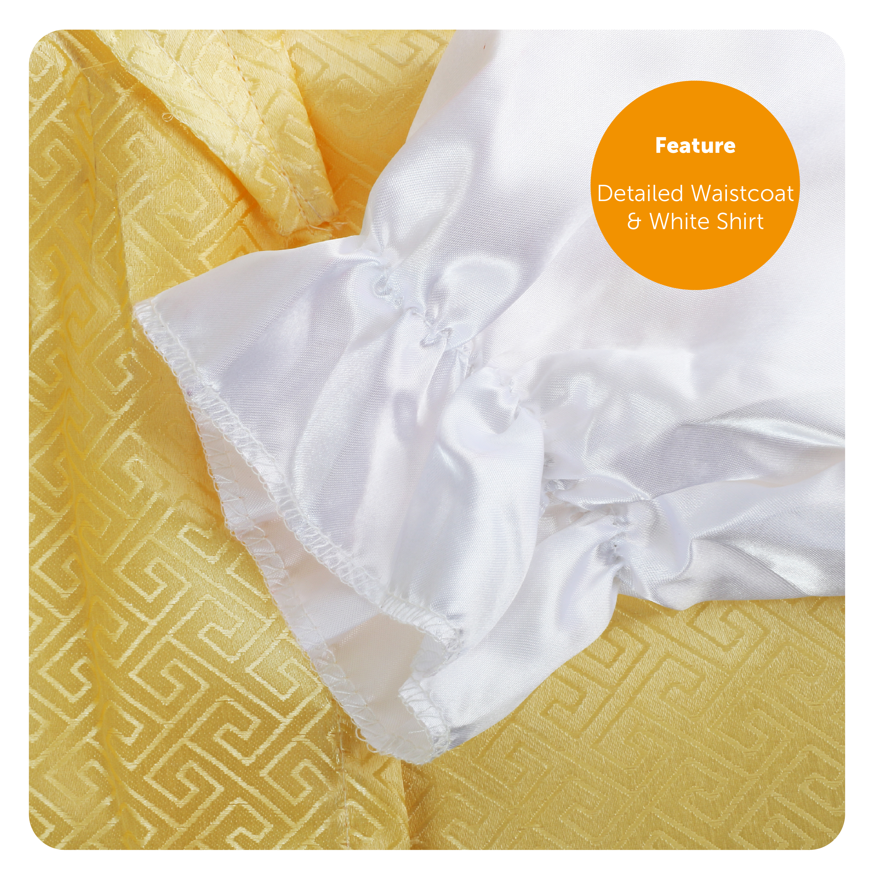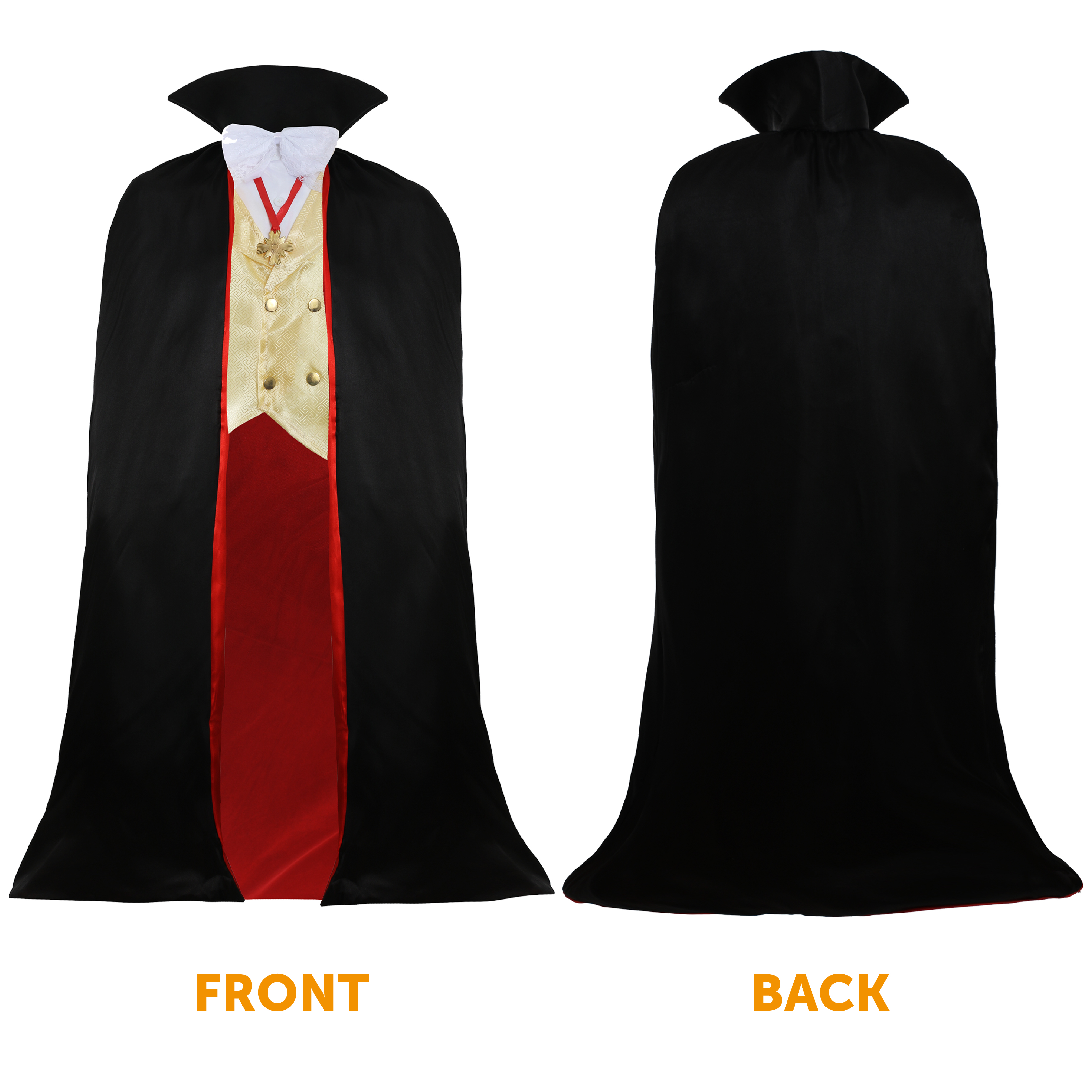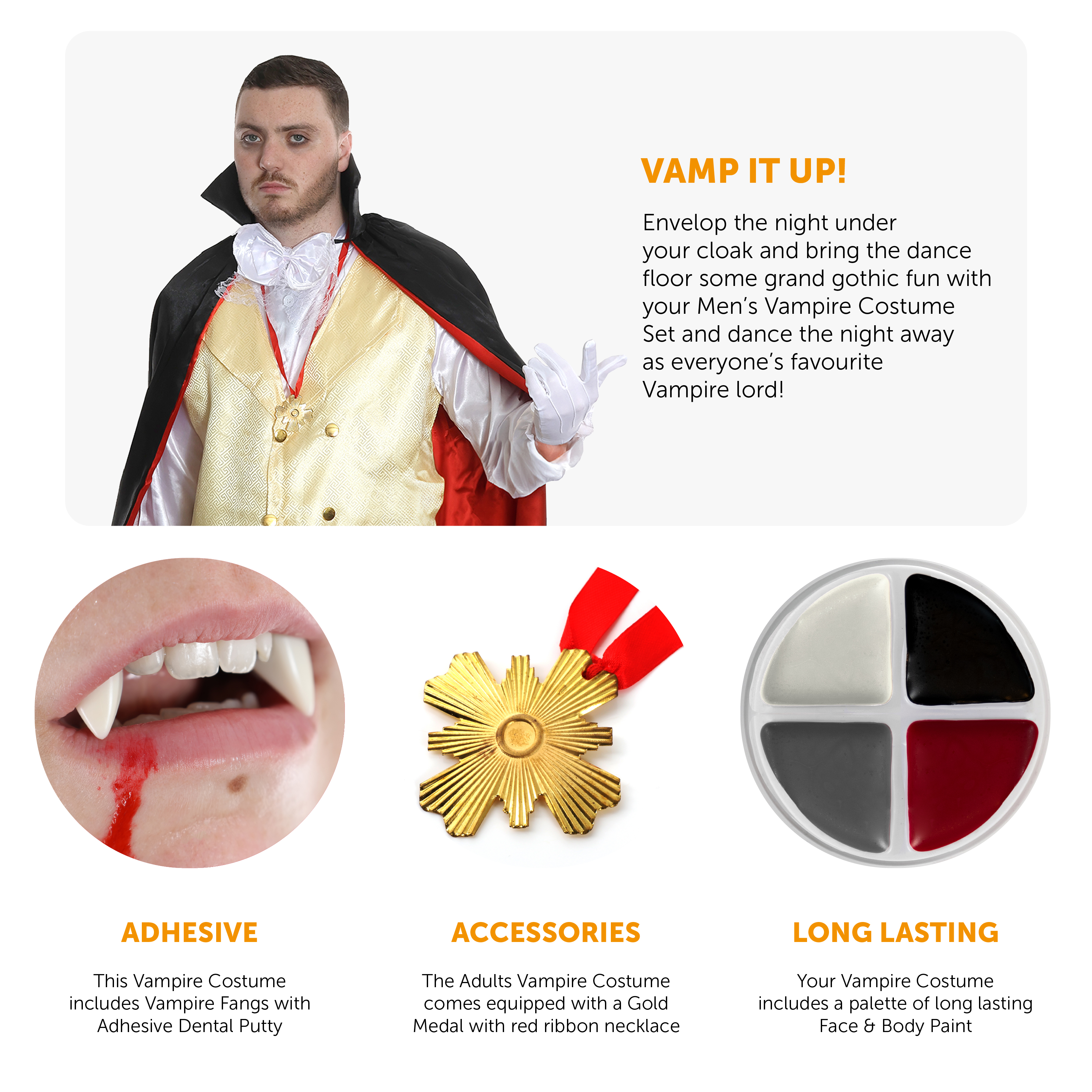 COSTUME INCLUDES: Your Men’s Vampire Costume includes a Gold Waistcoat with White Shirt, a Medal with a Red Necklace, a White Bow Tie, a Black Collared Cape with a Red lining, a palette of Face and Body Paint, and Vampire Fangs with Putty!