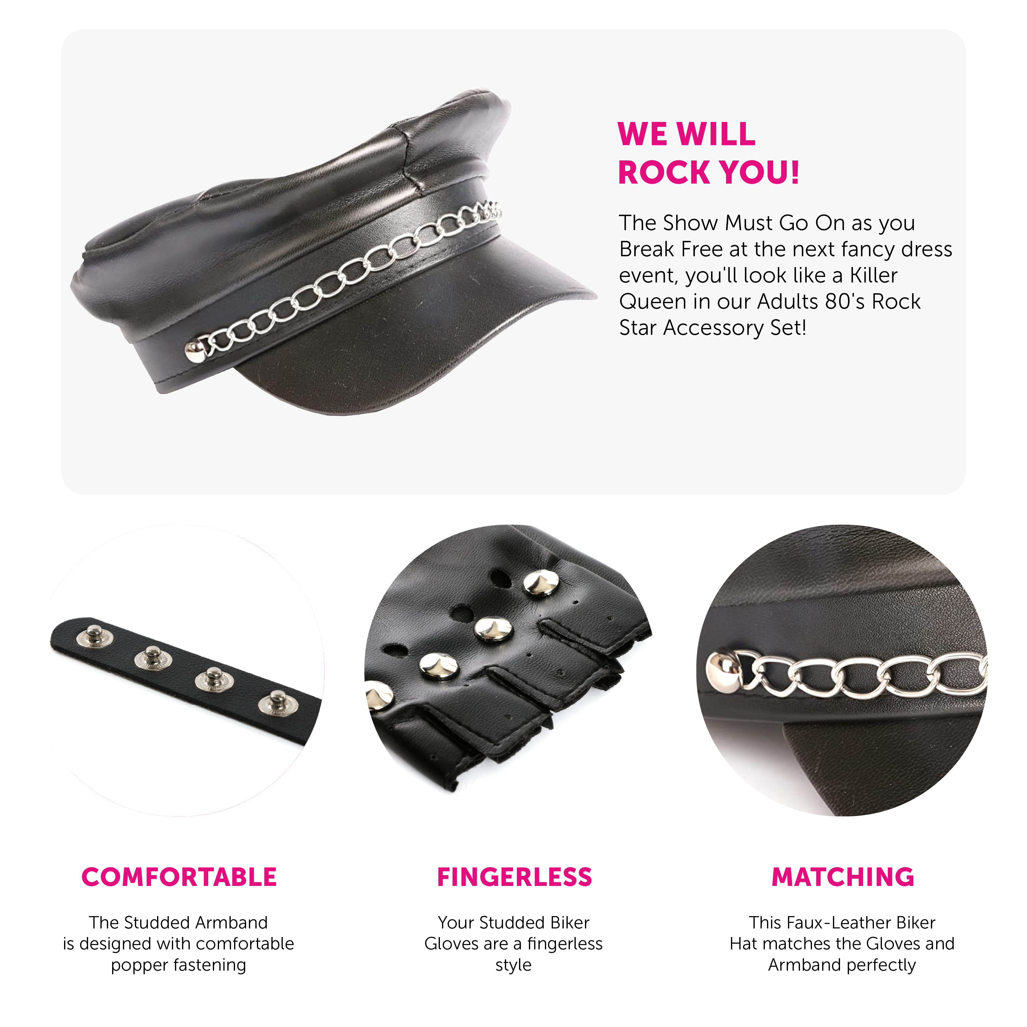 ACCESSORY SET INCLUDES: This 80's Rock Star Accessory Set includes a Black Faux-Leather Biker Cap with Silver Chain detail, a pair of Mirrored Aviator Sunglasses, a Black Adhesive Moustache, a Faux-Leather, Black Armband with Silver Stud detailing and a pair of Faux-Leather Fingerless Biker Gloves - perfect for music events!
