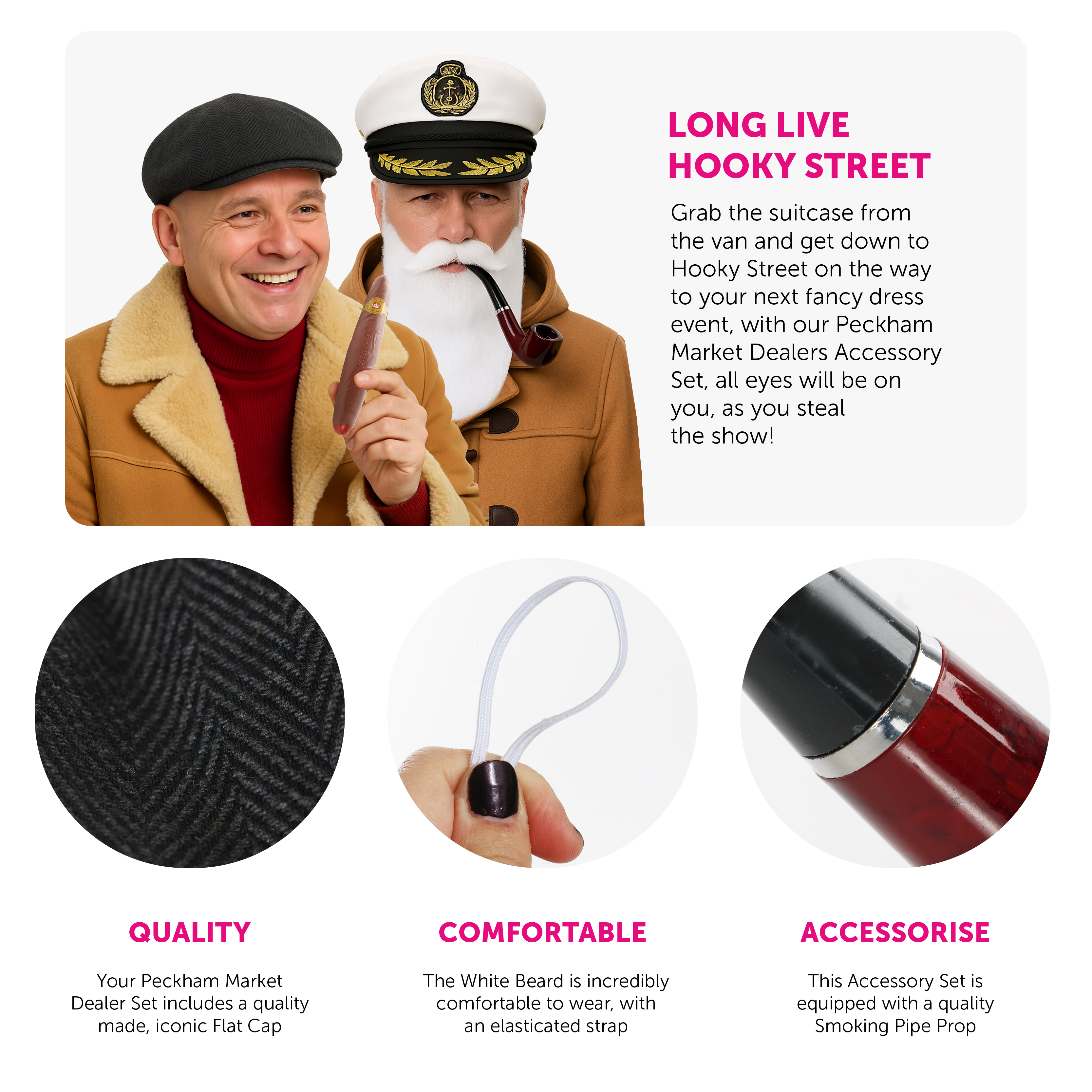 ACCESSORY SET INCLUDES: This Peckham Market Dealers Accessory Set includes a White Captain's Hat with a Gold Yellow Embroidery, a White Beard, a Fake Smoking Pipe, a Grey Flat Cap, and a Plastic Cigar, perfect for your next fancy dress party!