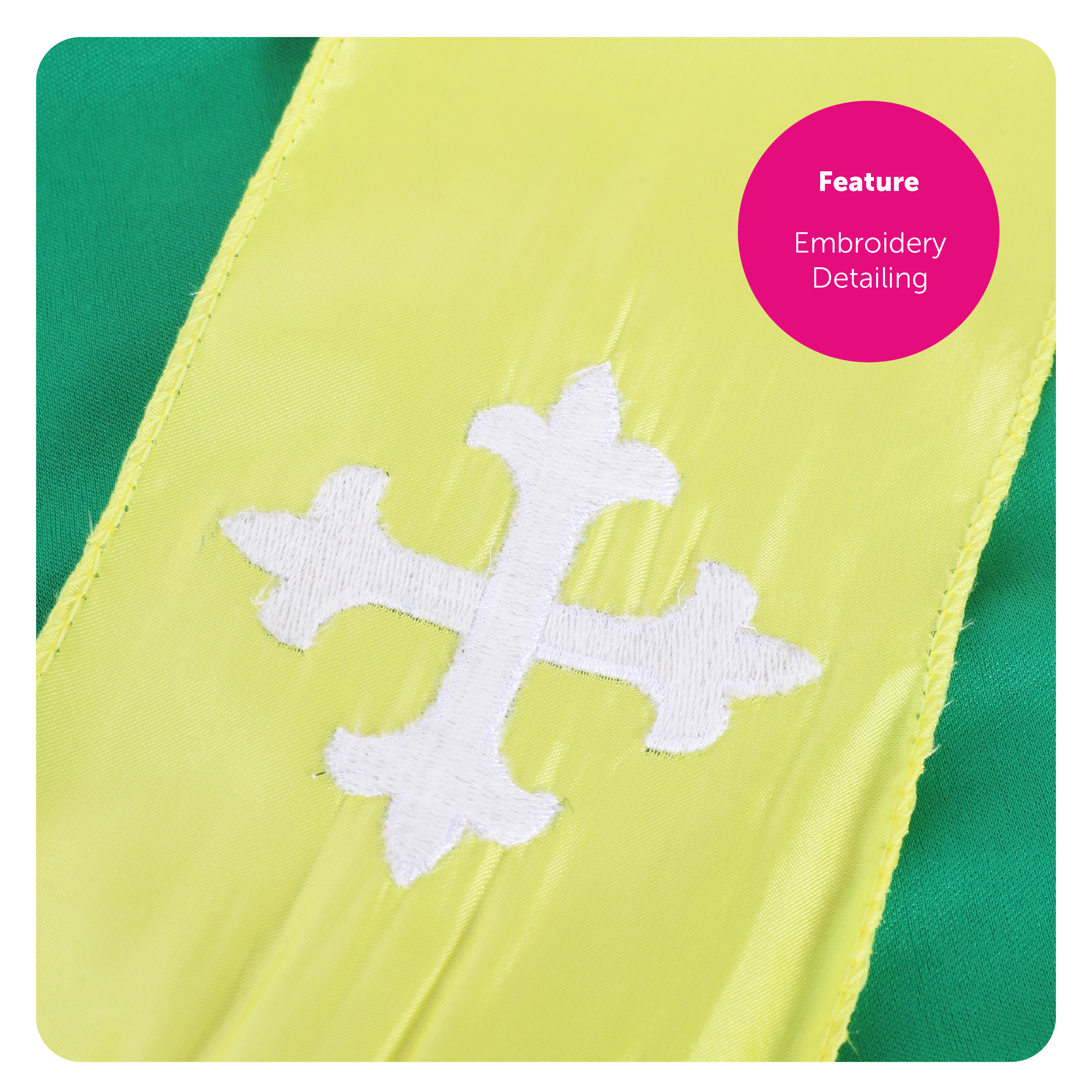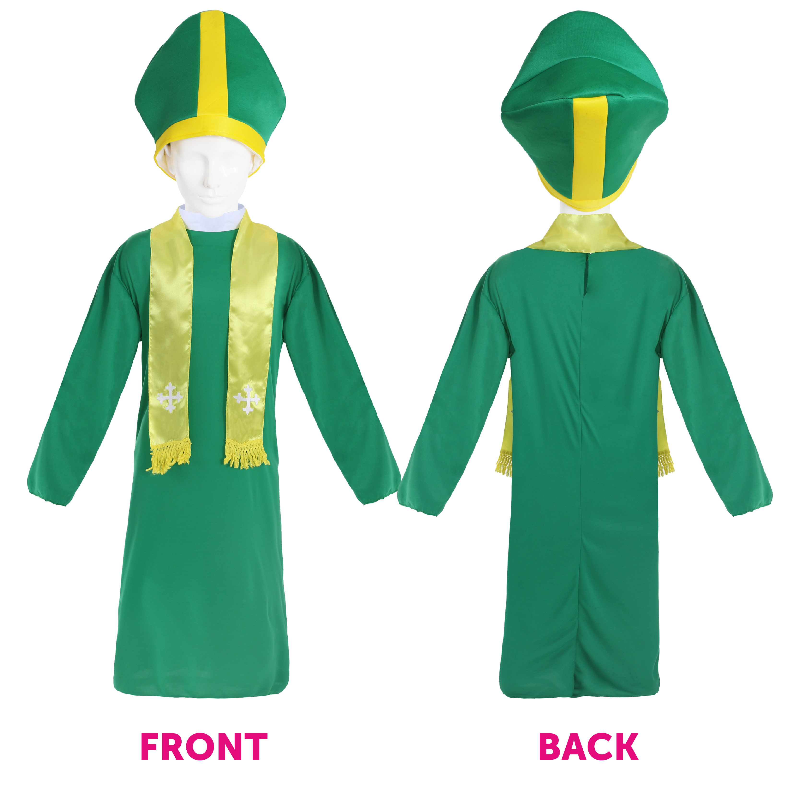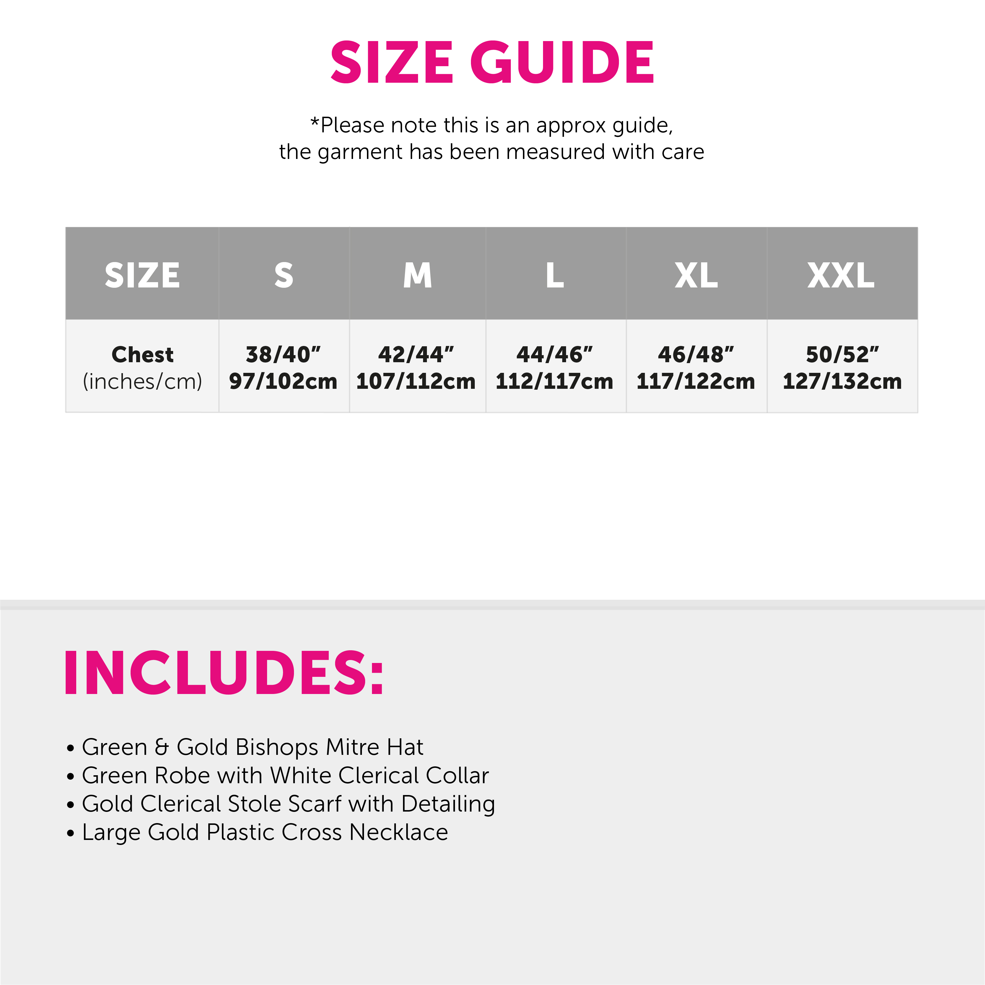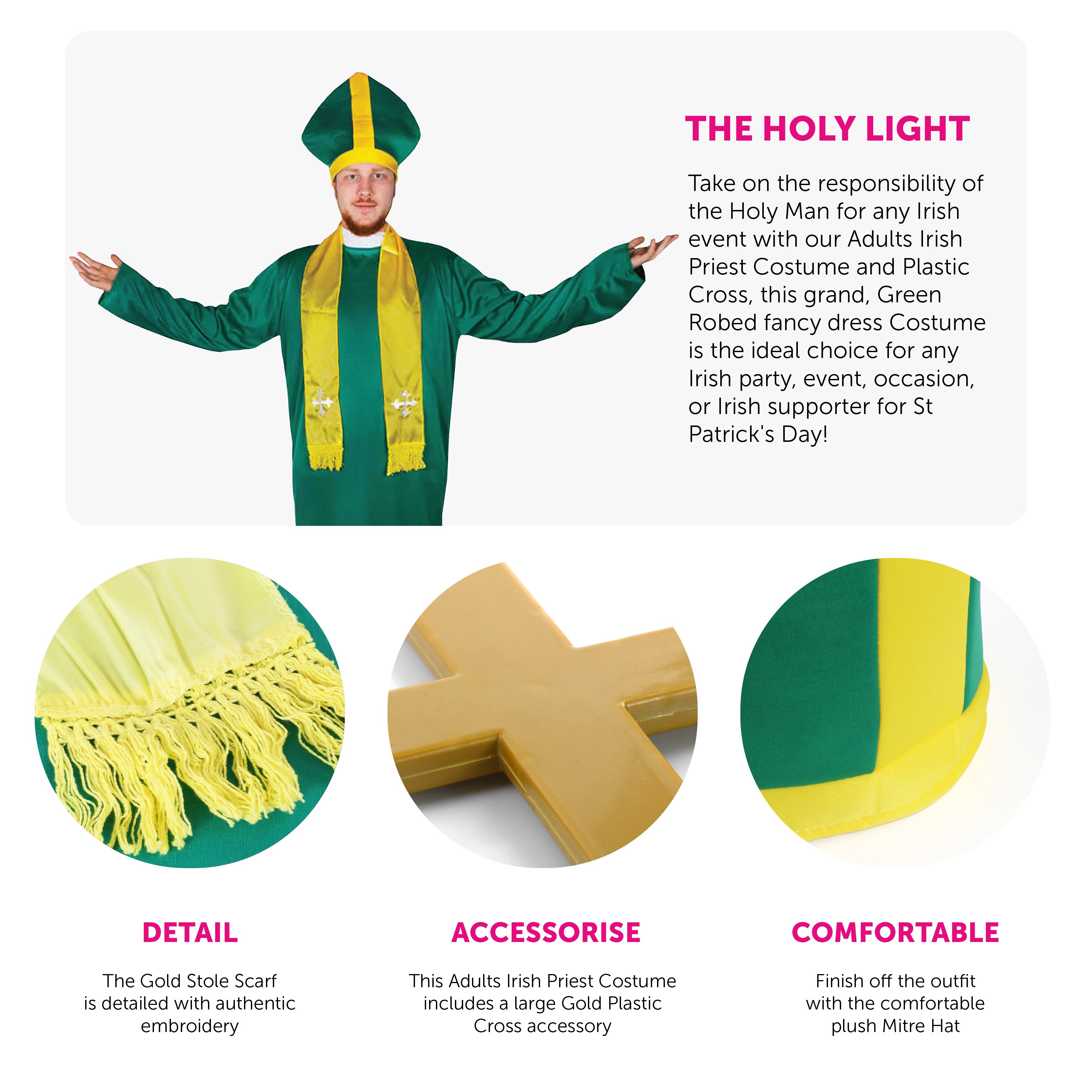 COSTUME DETAILS: This Adults Irish Priest costume includes a Green & Gold Mitre Hat, a Green Cassock Robe with a White Clerical Collar, a Gold Stole Scarf with Fleur De Lis detail, and a large Gold Plastic Cross on a Necklace, the perfect Costume to wear at any Irish event!