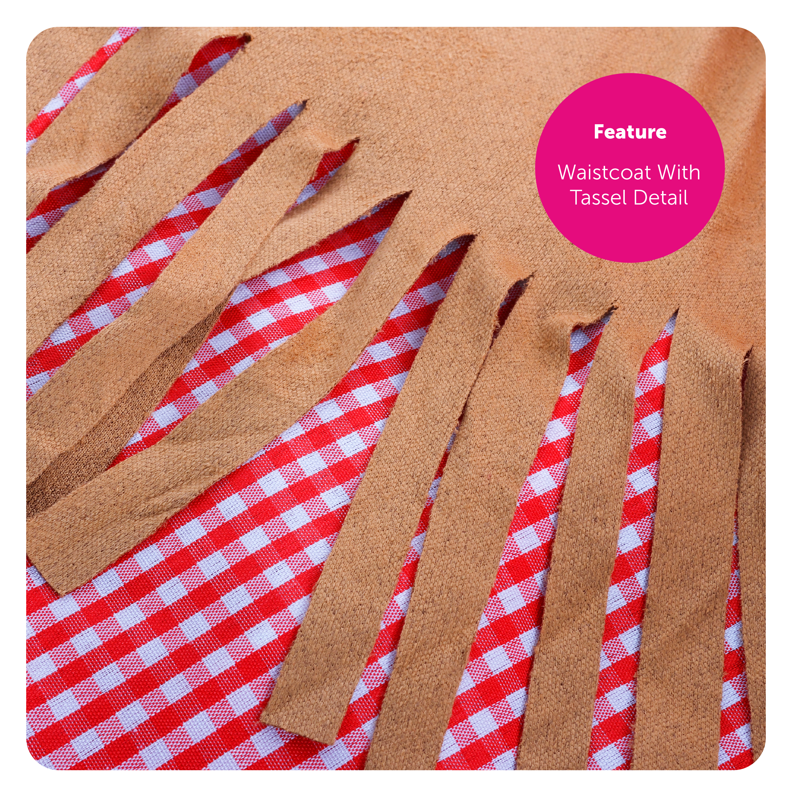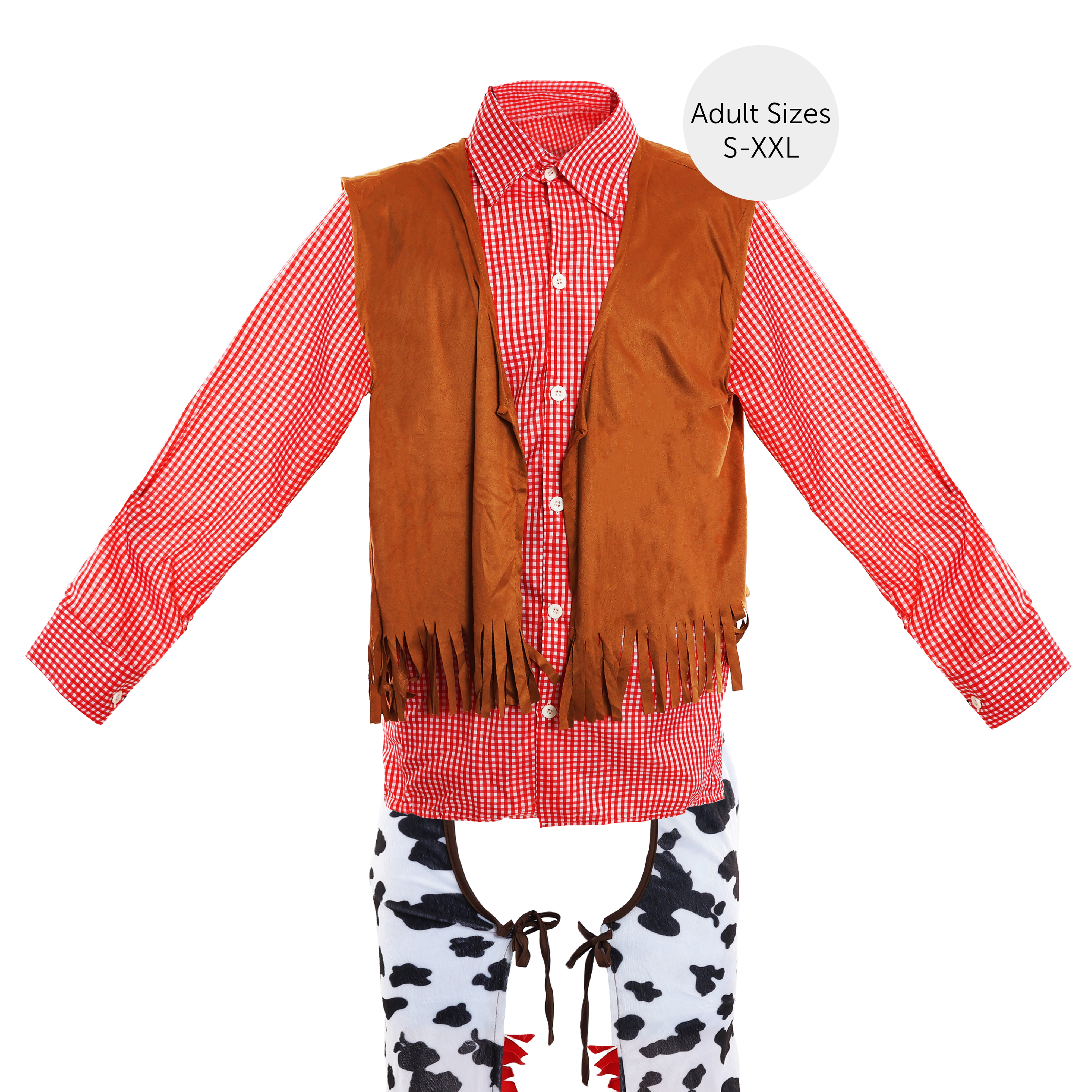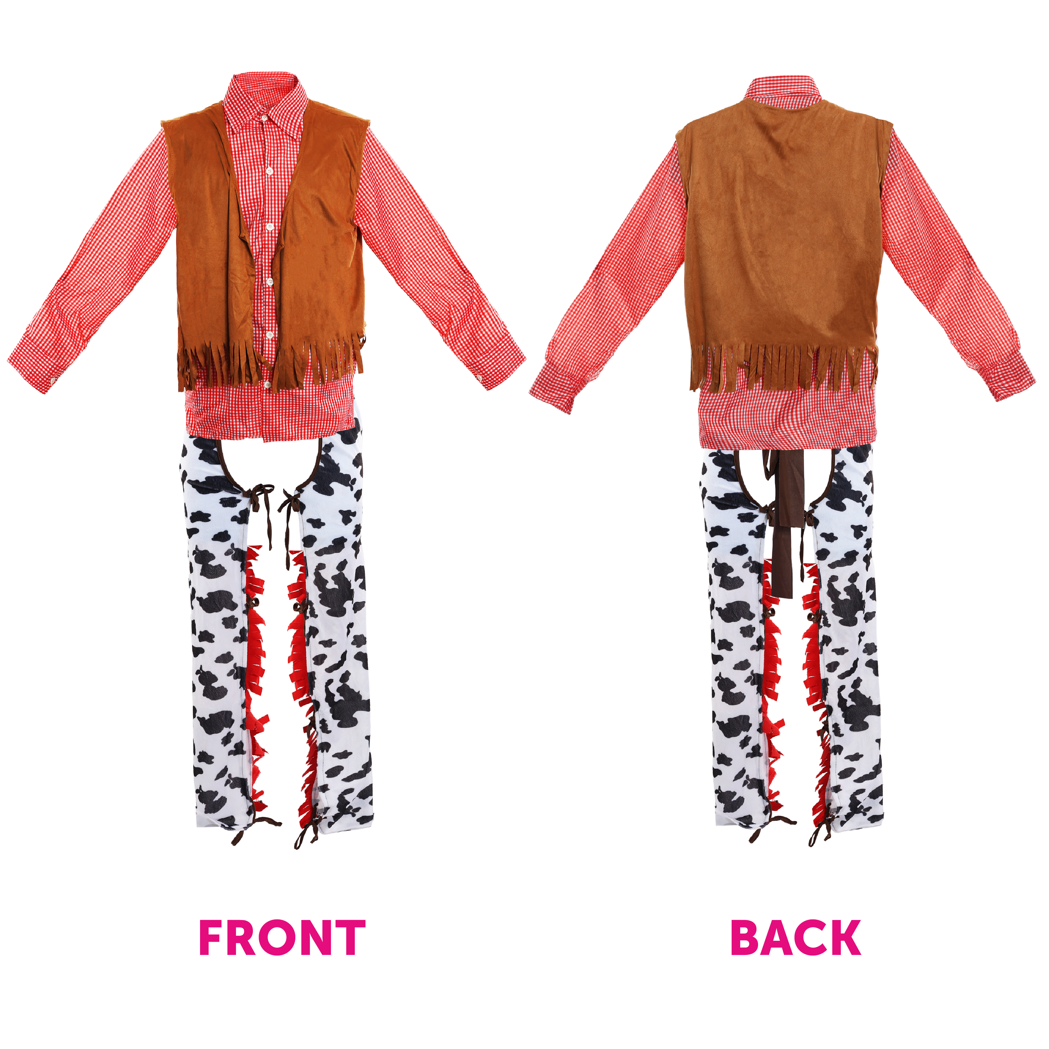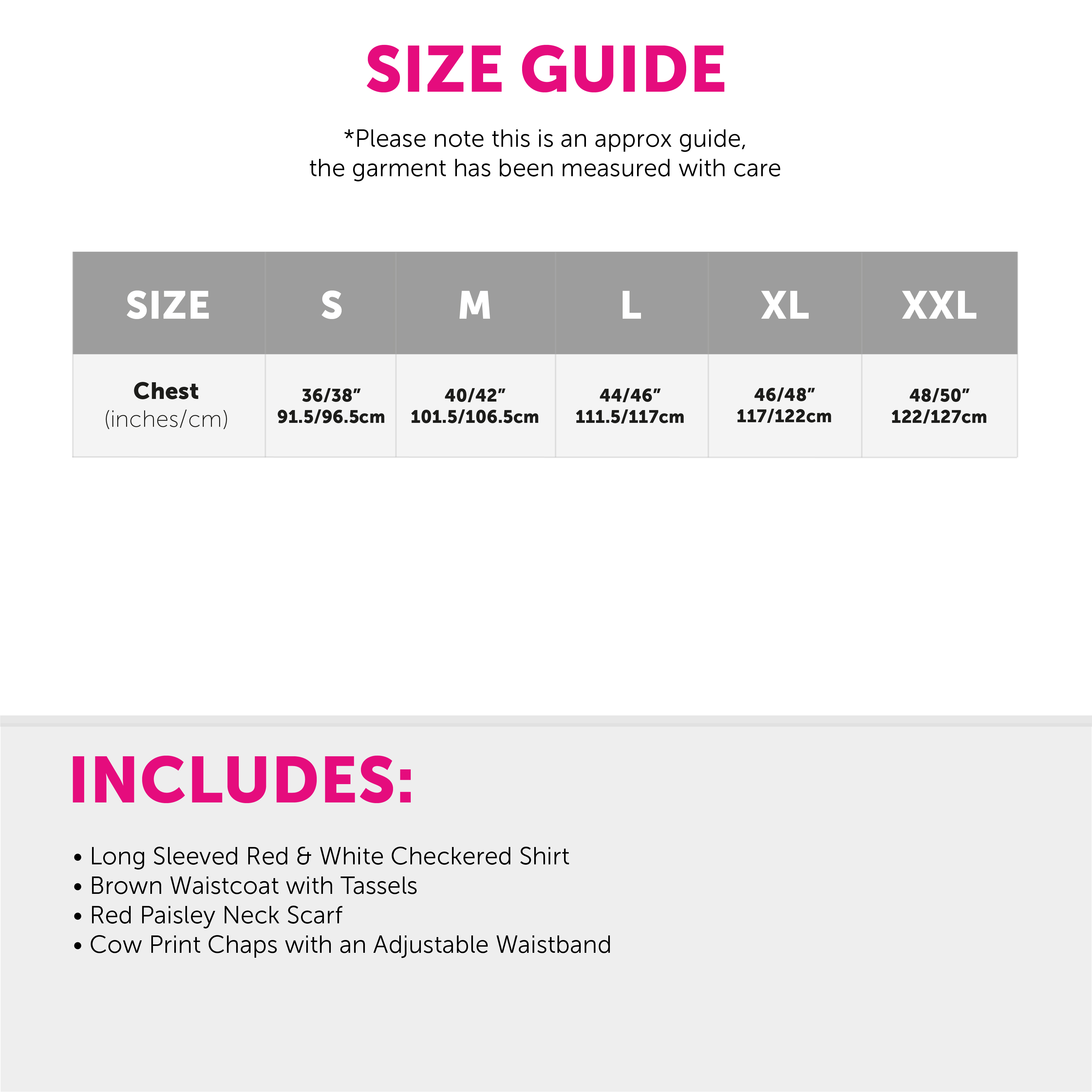 COWBOY COSTUME INCLUDES: This Adults Cowboy Costume includes a long sleeved Red and White Checkered Shirt, Red Paisley Neck Scarf, a Brown Waistcoat with Tassels and Cow Print Chaps with an adjustable waistband!