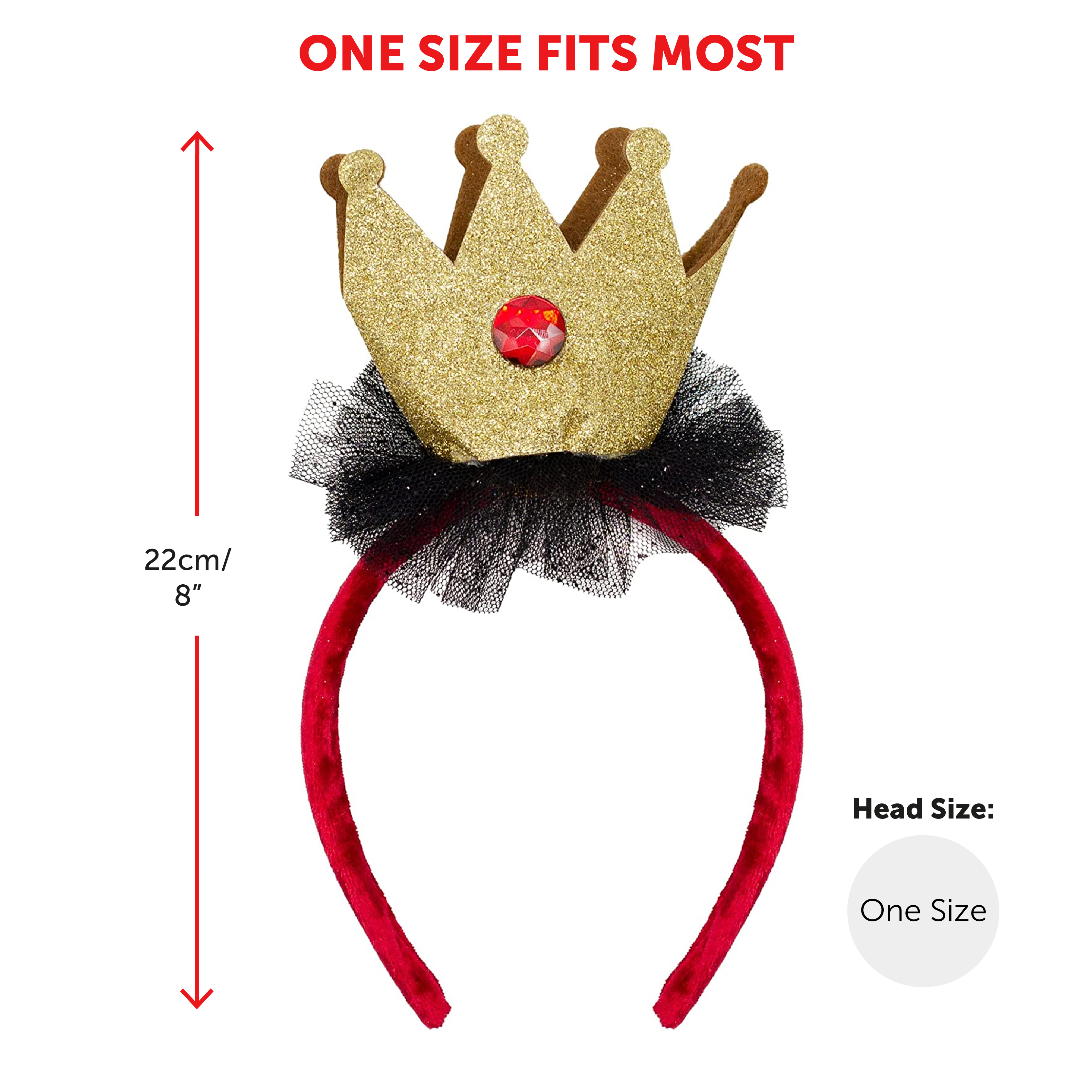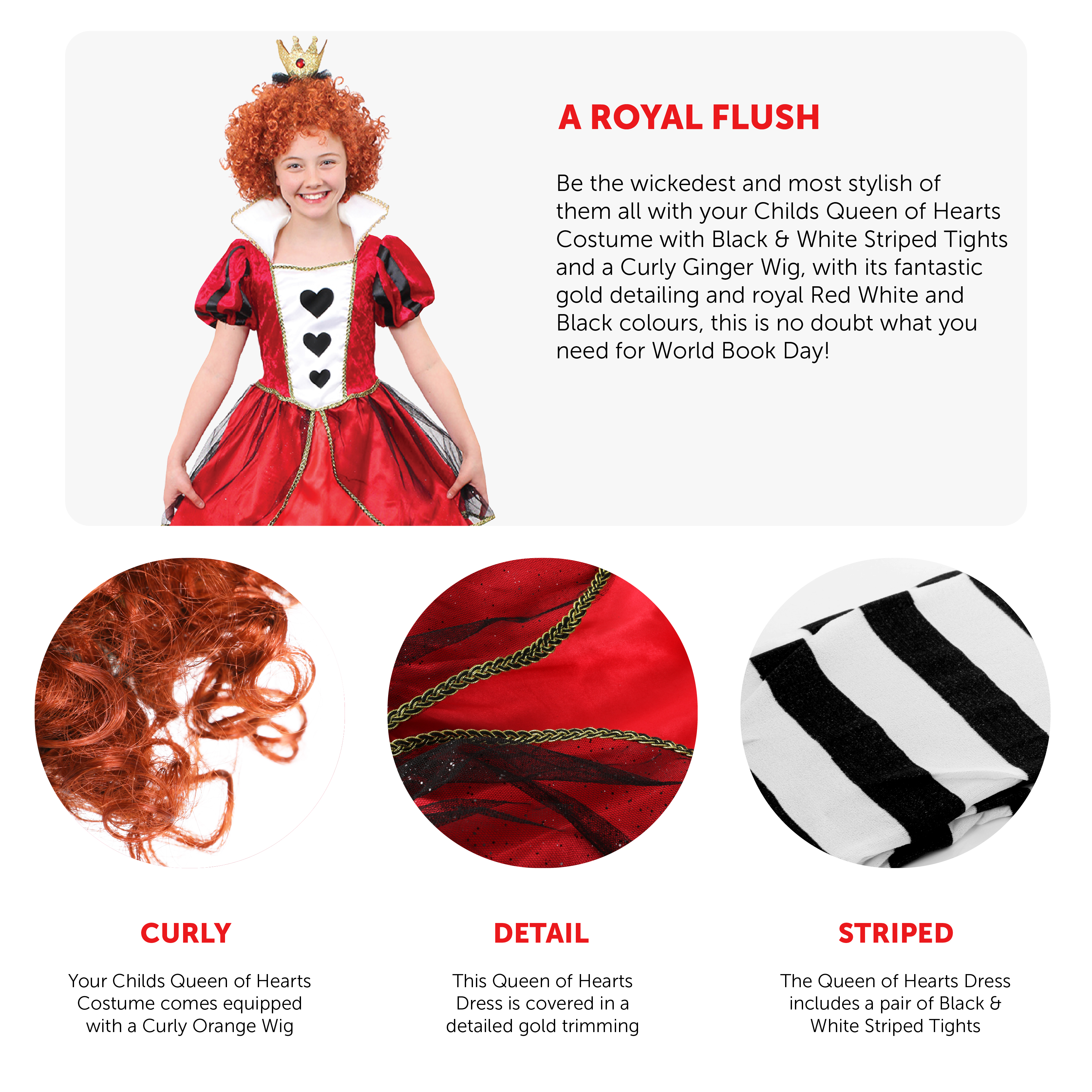 COSTUME INCLUDES: This Queen of Hearts Costume includes a Queen of Hearts Fancy Dress Costume, a curly Ginger Wig, Striped Black and White Tights, and a Glitter Gold Mini Crown on a Headband with extra detailing!