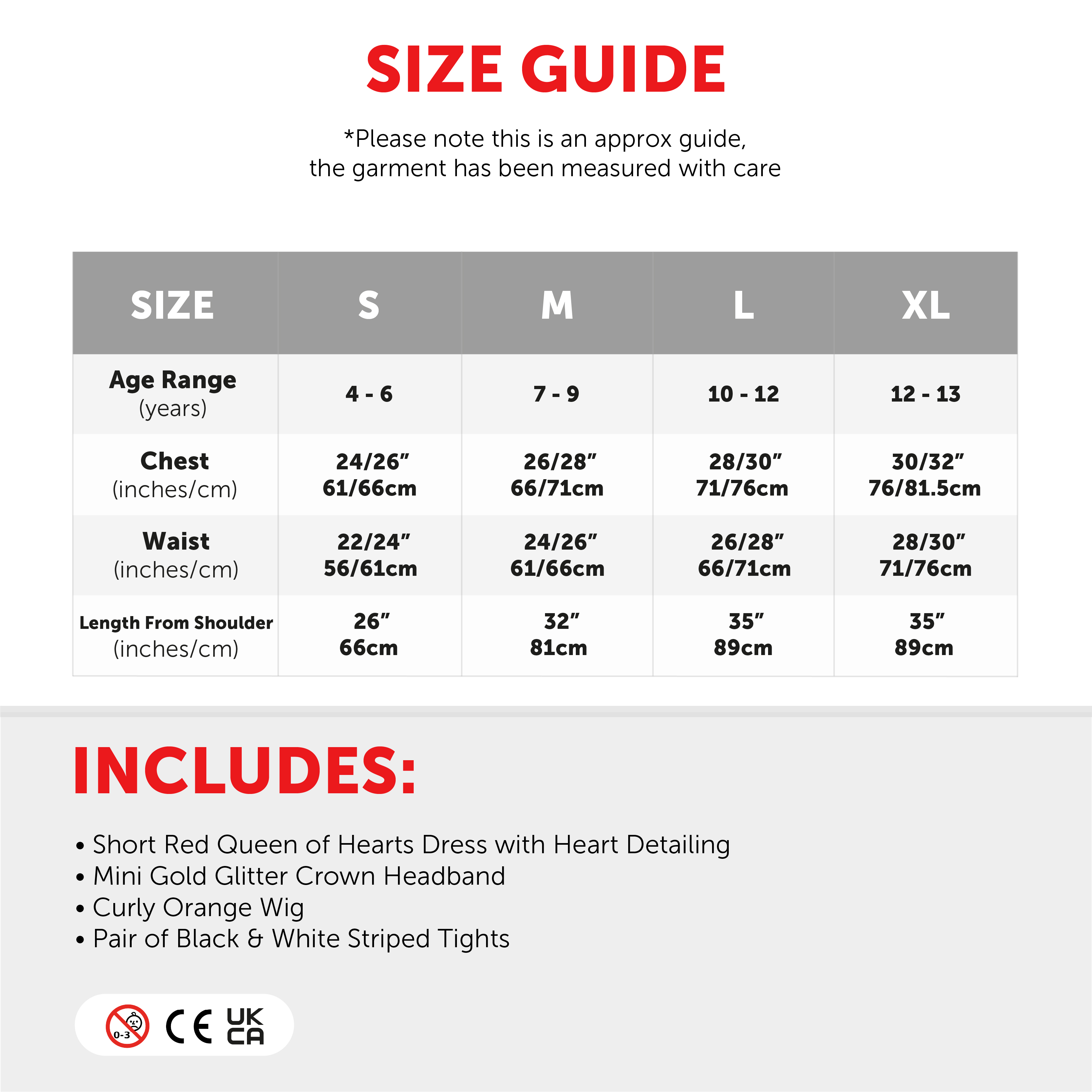 AVAILABLE IN MULTIPLE SIZES: This Queen of Hearts Costume is Available in Sizes Small – X-Large: Small - 4-6 Years - Chest: 24-26"/61-66cm, Waist: 22-24"/56-61cm, Length (From Shoulder): 26"/66cm | Medium - 7-9 Years - Chest: 26-28"/66-71cm, Waist: 24-26"/61-66cm, Length (From Shoulder): 32"/81cm | Large - 10-12 Years - Chest: 28-30"/71-76cm, Waist: 26-28"/66-71cm, Length (From Shoulder): 35"/89cm | X-Large - 12-13 Years - Chest: 30-32"/76-81cm, Waist: 28-30"/71-76cm, Length (From Shoulder): 35"/89cm