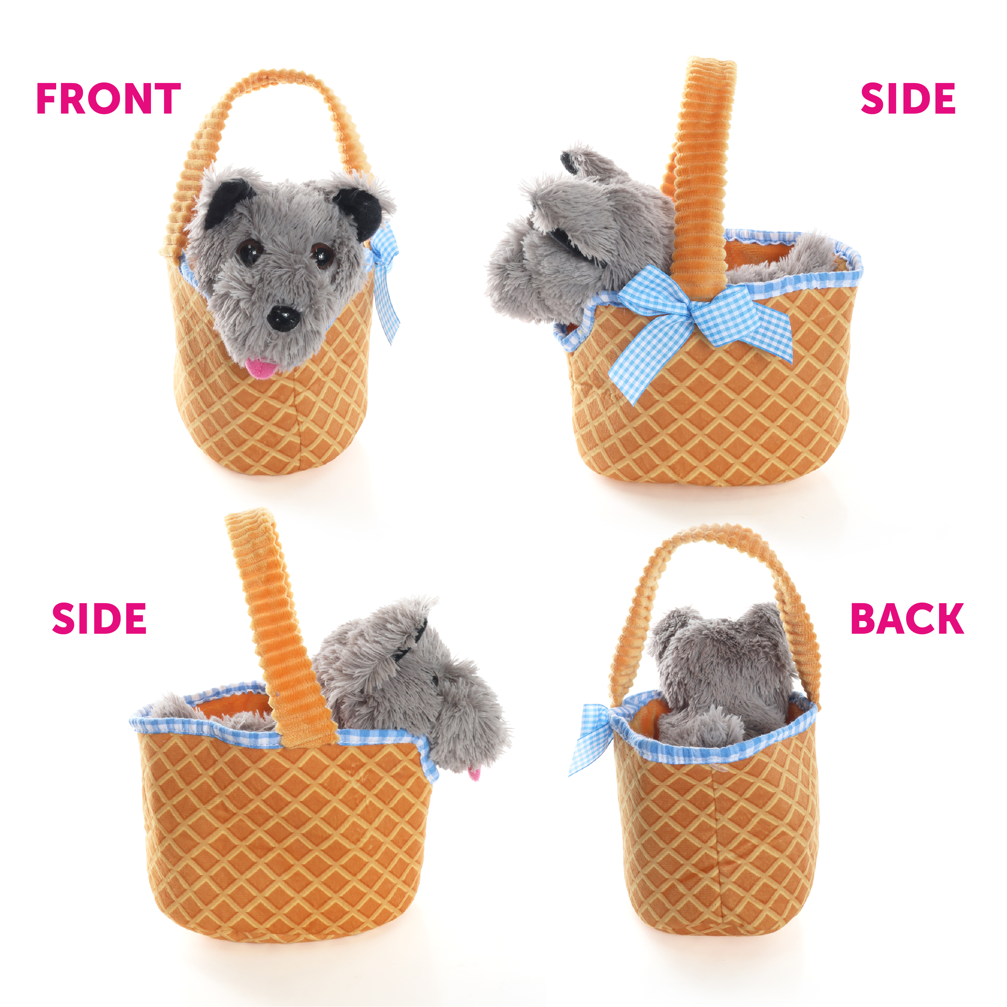 SET INCLUDES: This Set includes a Soft Brown Basket with Blue Gingham lining inside, detailed with a Bow on the side, and a Grey Toy Terrier Dog, the dog is removable from the Basket and can be used as a cute plush accessory for any other costume set you may need him to accompany with you!