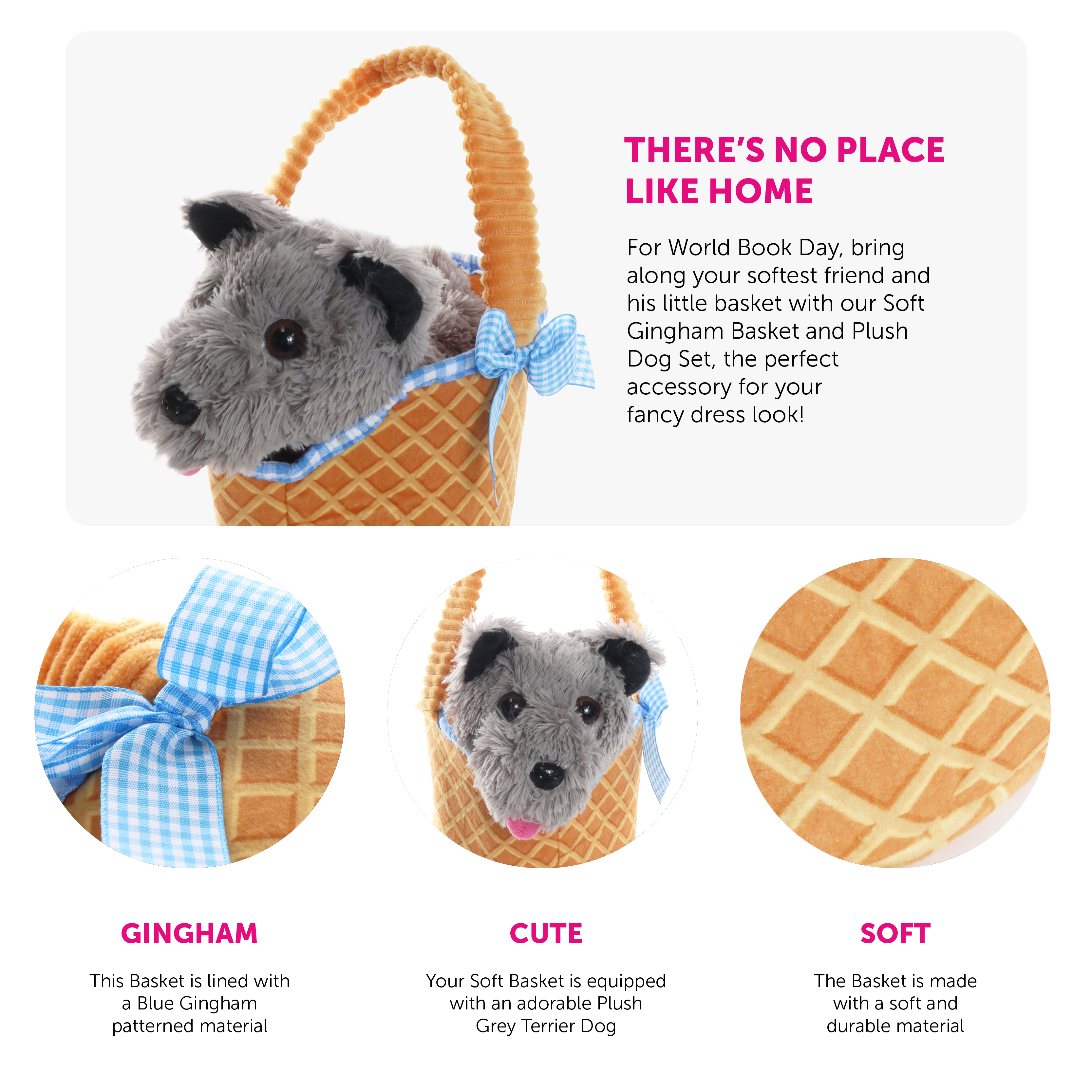 SOFT GINGHAM BASKET & PLUSH DOG: For World Book Day, bring along your softest friend and his little basket with our Soft Gingham Basket and Plush Dog Set, the perfect accessory for your fancy dress look!