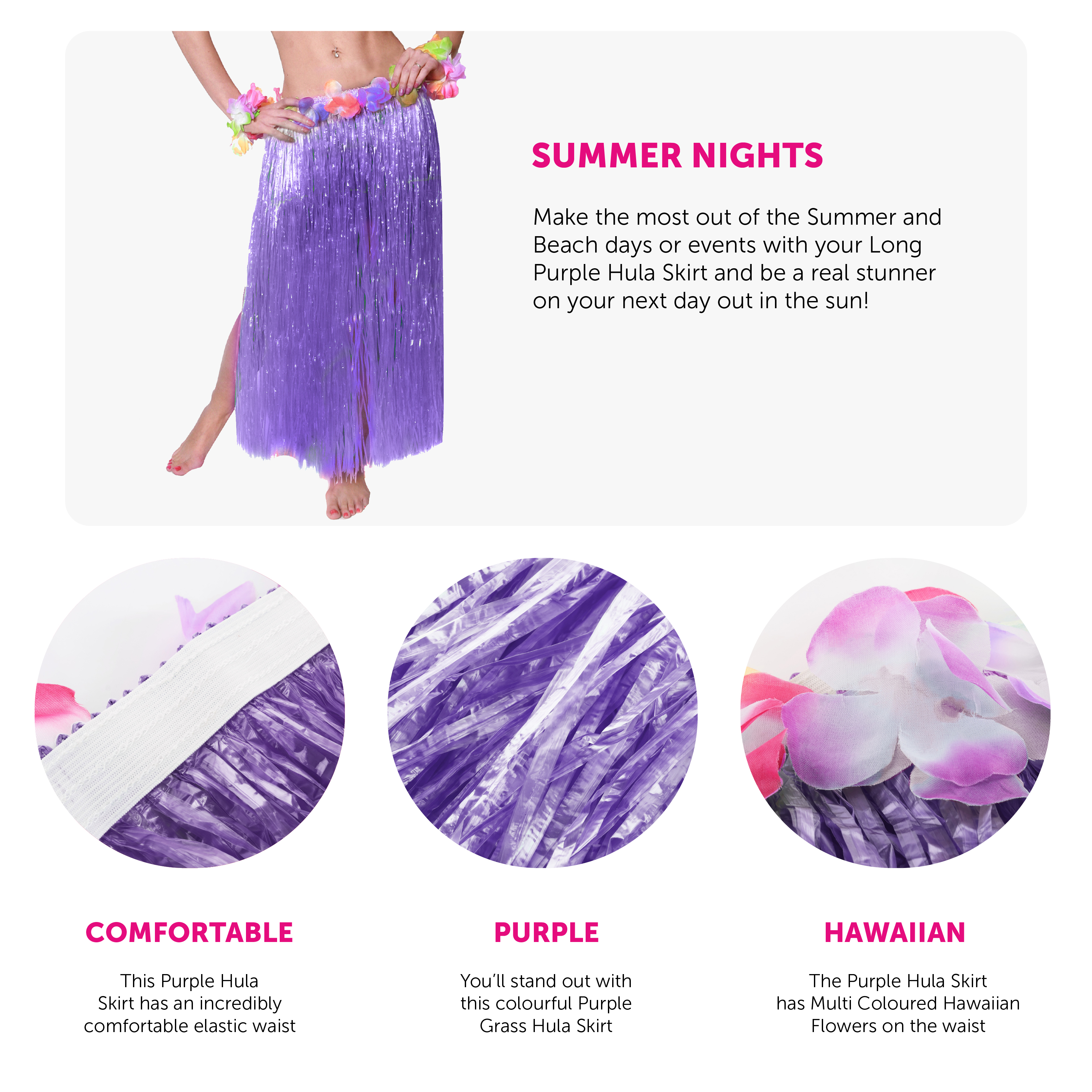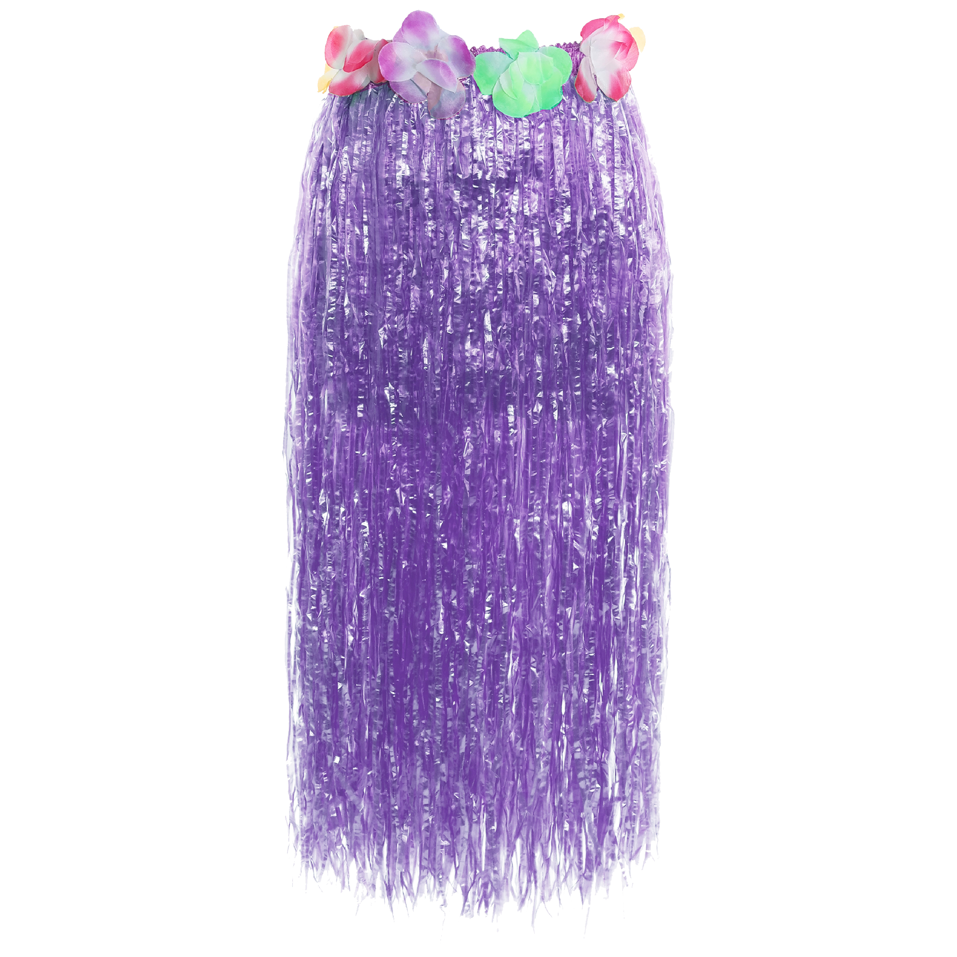 HULA SKIRT DETAILS: Your Long Hula Skirt is a Purple, grass-like Skirt with an elasticated waistband and multi coloured decorative Hawaiian Lei Flowers, all tropical and ready for the beach!