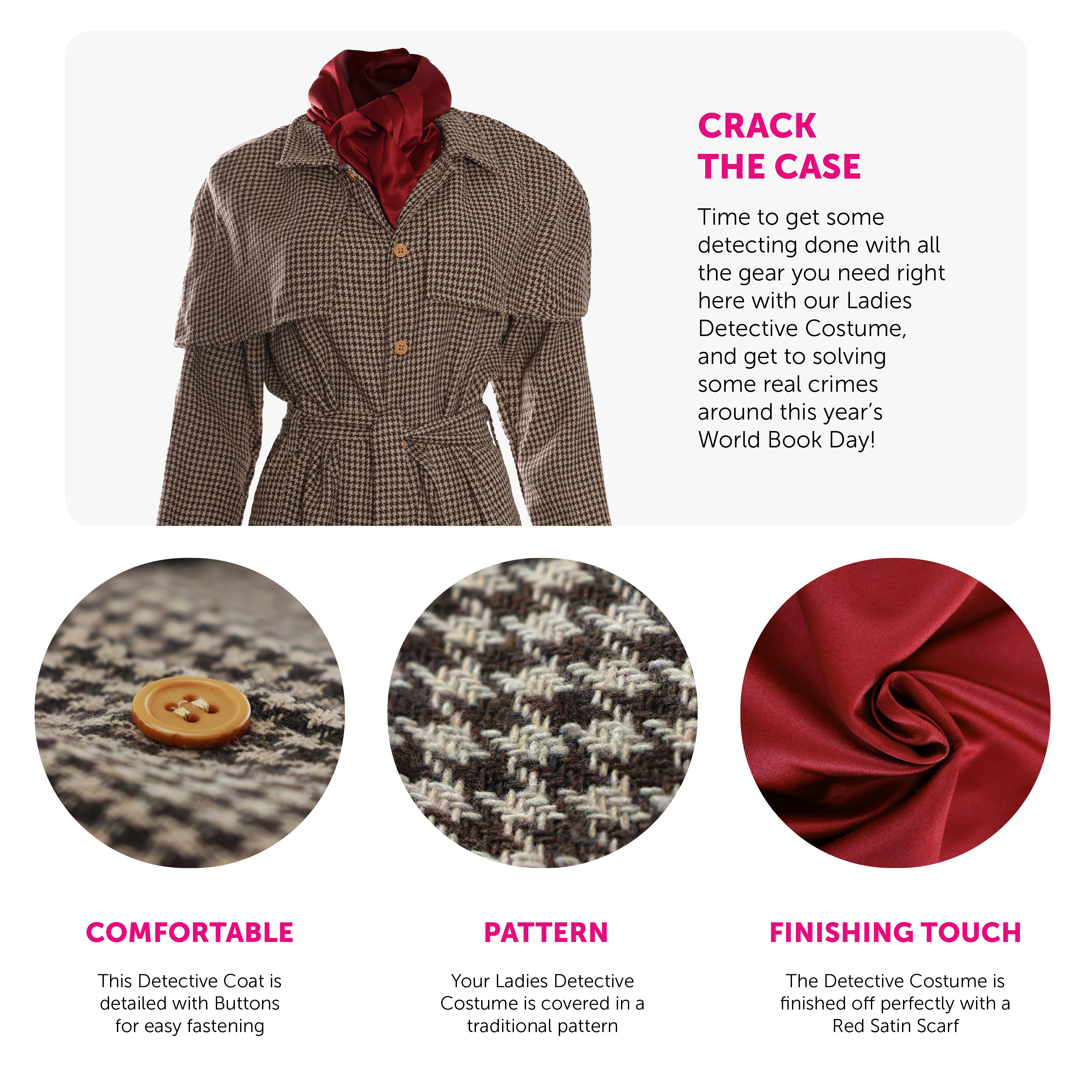 COSTUME INCLUDES: This Ladies Detective Costume includes a traditional style, Brown Deerstalker Hat with a matching Victorian Coat, detailed with a Shoulder Cape and Buttons, and a Red Satin Scarf, a great outfit to accompany a brilliant investigator such as yourself to solve only the finest and puzzling of crimes!