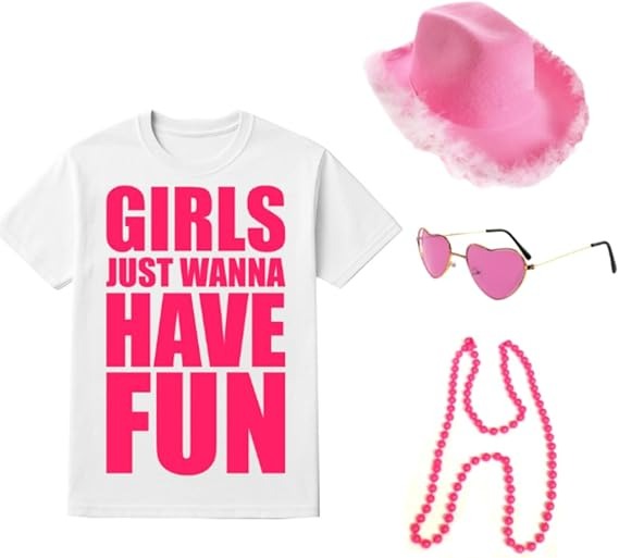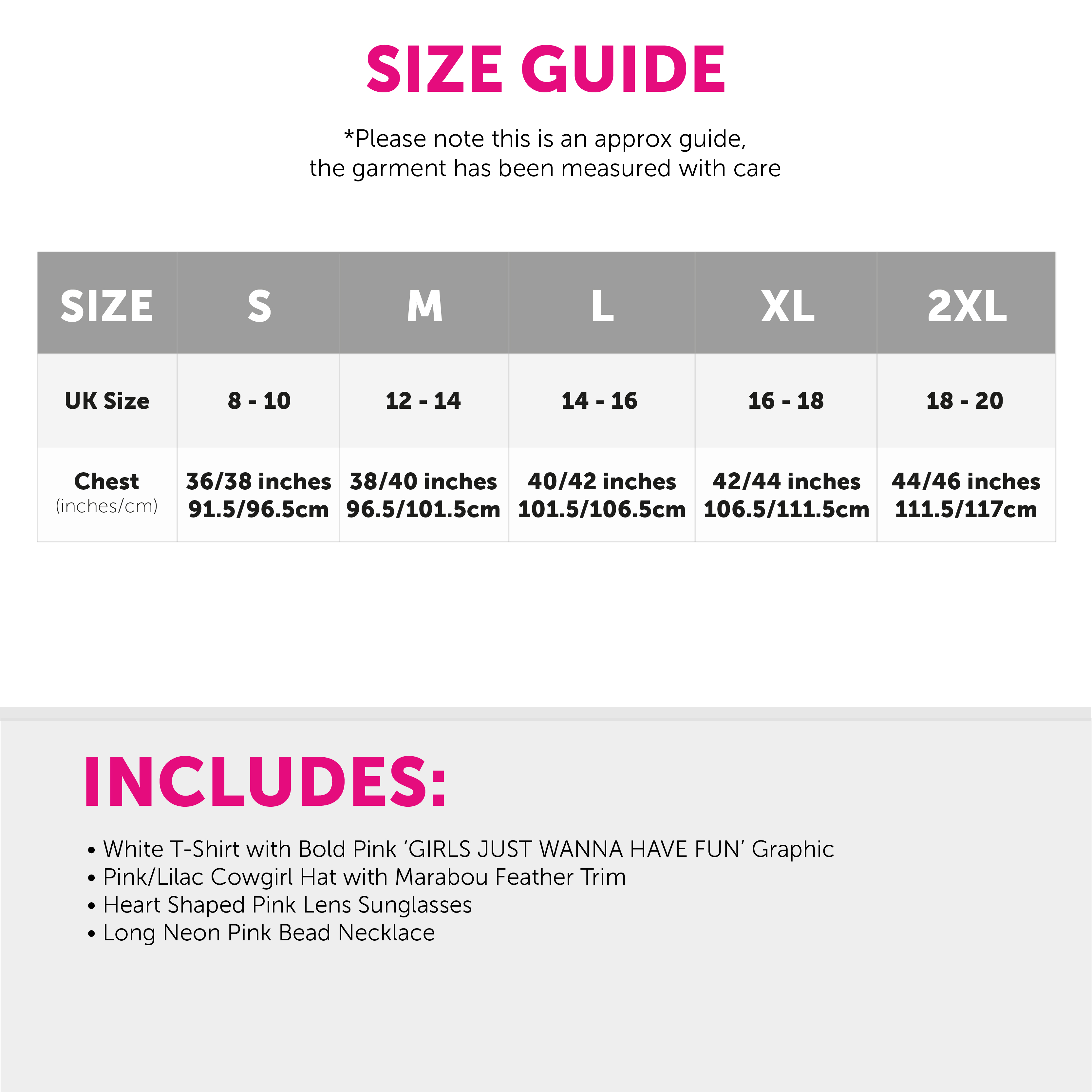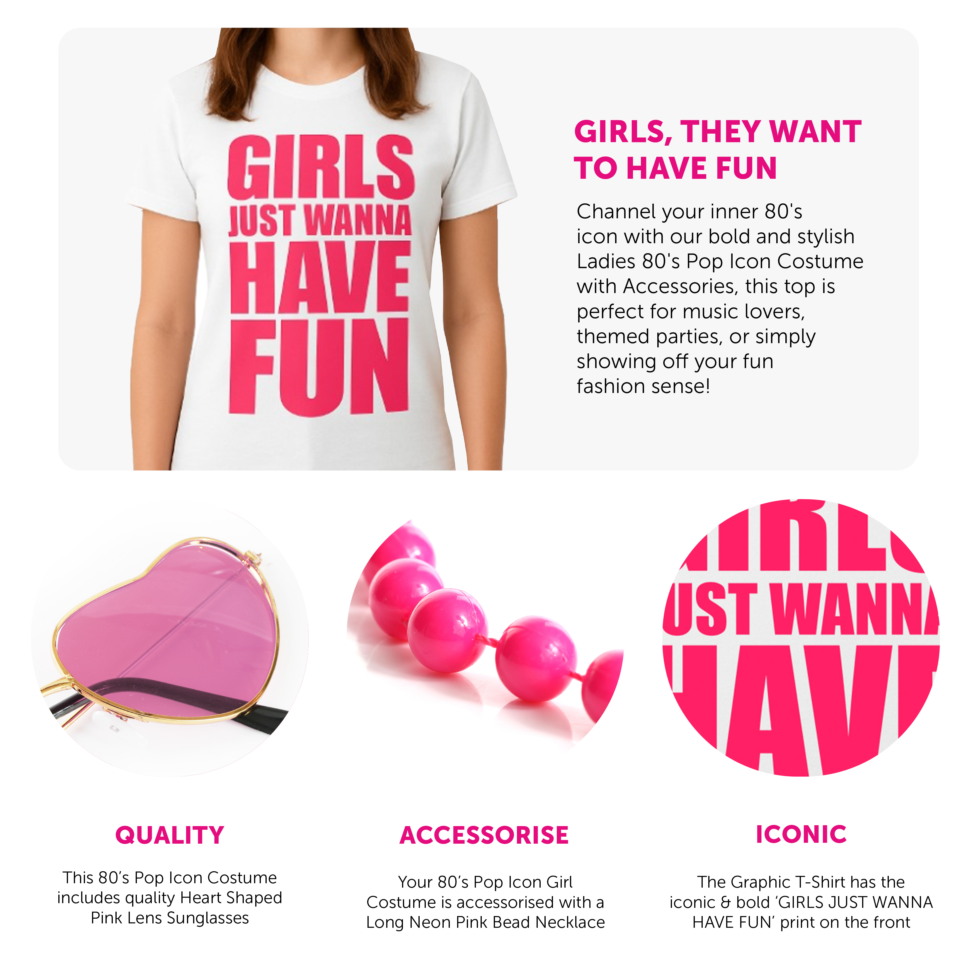 COSTUME INCLUDES: This Ladies 80' Pop Icon Costume includes a crisp White T-Shirt with a bold Pink 'Girls Just Wanna Have Fun' graphic on the front, a Pink Cowgirl Hat with Marabou Feathers around the brim, Heart Shaped Sunglasses with Pink Lenses, and a Neon Pink Bead Necklace, perfect for any fancy dress event!