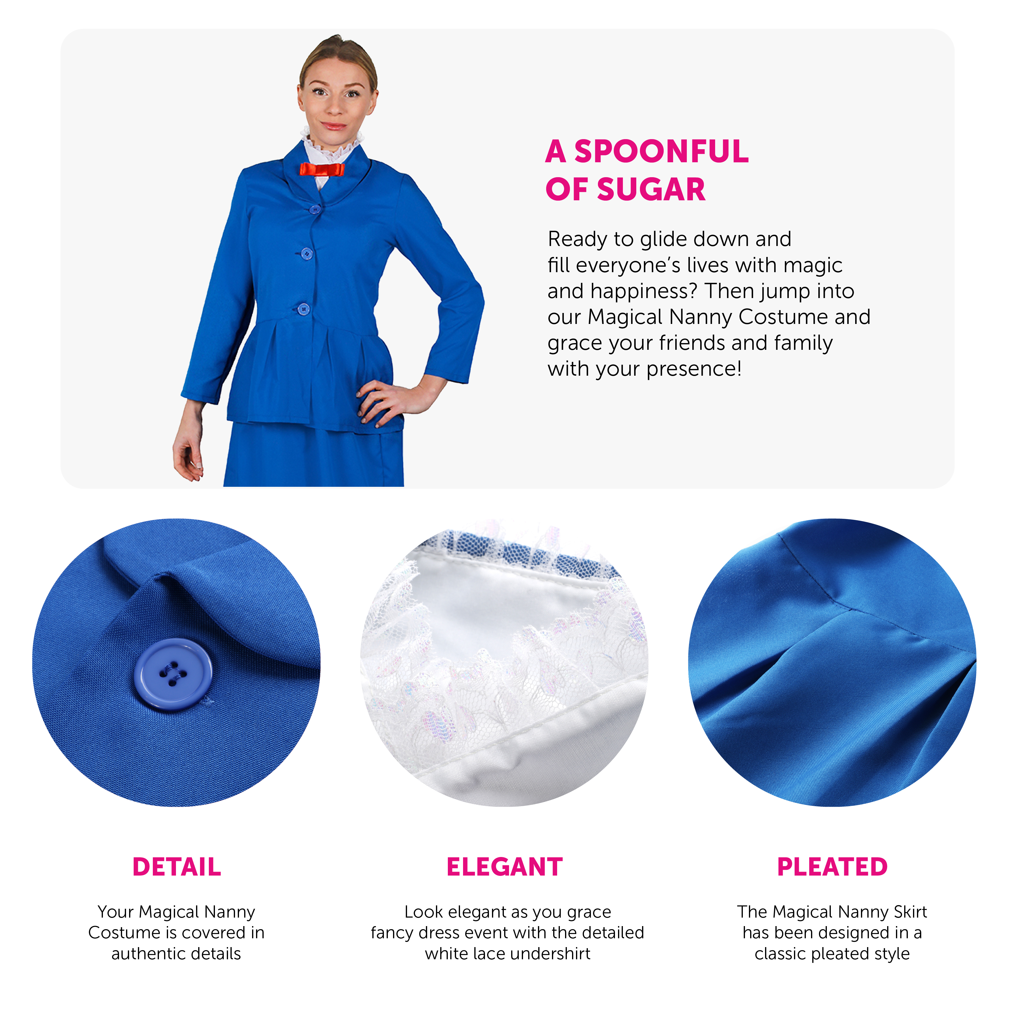 LADIES MAGICAL NANNY COSTUME: Ready to glide down and fill everyone’s lives with magic and happiness? Then jump into our Magical Nanny Costume and grace your friends and family with your presence!