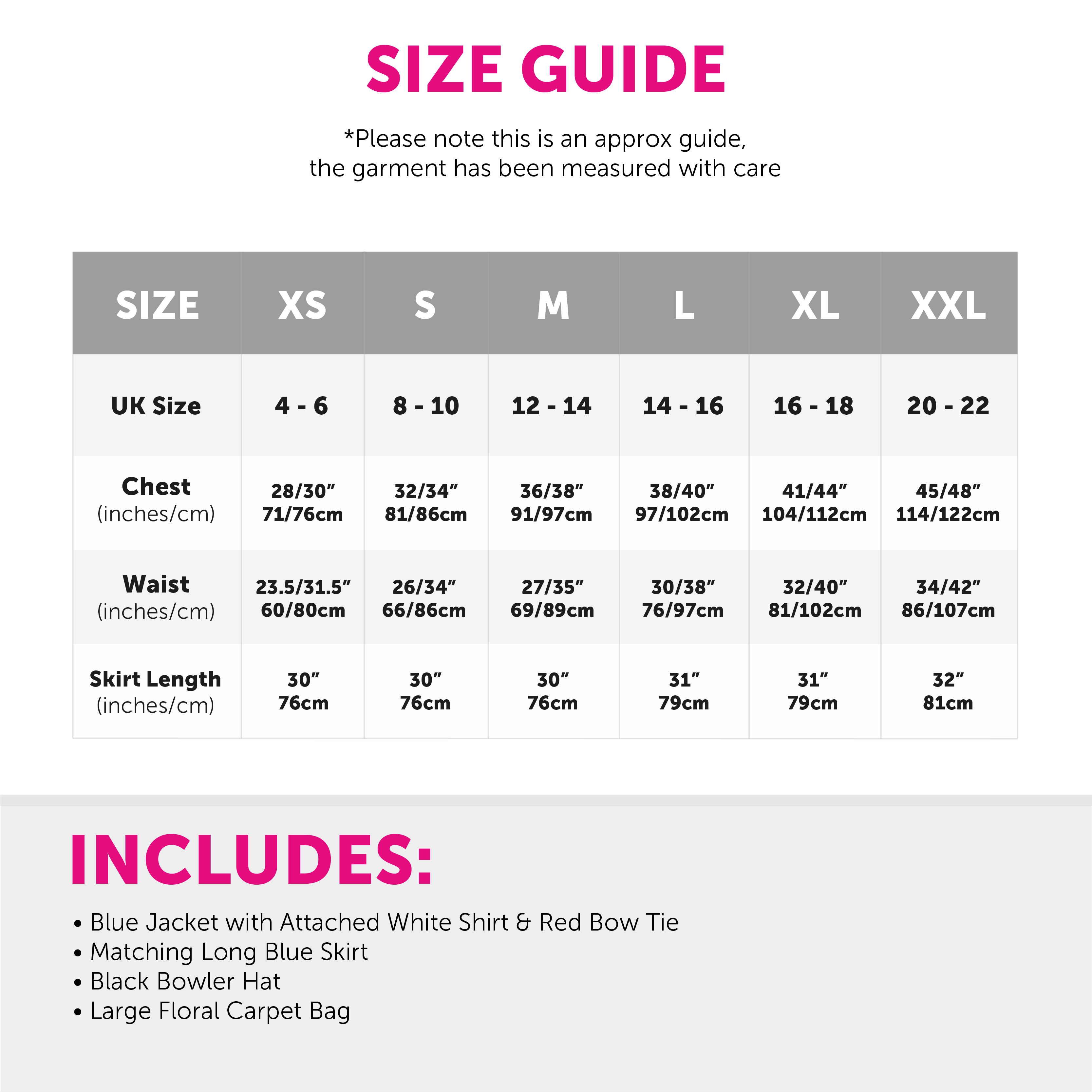 AVAILABLE IN MULTIPLE SIZES: Our Ladies Magical Nanny Costume is available in sizes X-Small – XX-Large: X-Small (UK 4 - 6) Chest 28/30" (71/76cm), Waist 23.5/31.5" (60/80cm), Skirt Length 30" (76cm) | Small (UK 8 - 10) Chest 32/34" (81/86cm), Waist 26/34" (66/86cm), Skirt Length 30" (76cm) | Medium (UK 12 - 14) Chest 36/38" (91/97cm), Waist 27/35" (69/89cm), Skirt Length 30" (76cm) | Large (UK 14 - 16) Chest 38/40" (97/102cm), Waist 30/38" (76/97 cm), Skirt Length 31" (79cm) | X-Large (UK 16 - 18) Chest 41/44" (104/112cm), Waist 32/40" (81/102cm), Skirt Length 31" (79cm) | XX-Large (UK 20 - 22) Chest 45/48" (114/122cm), Waist 34/42" (86/107cm), Skirt Length 32" (81cm)