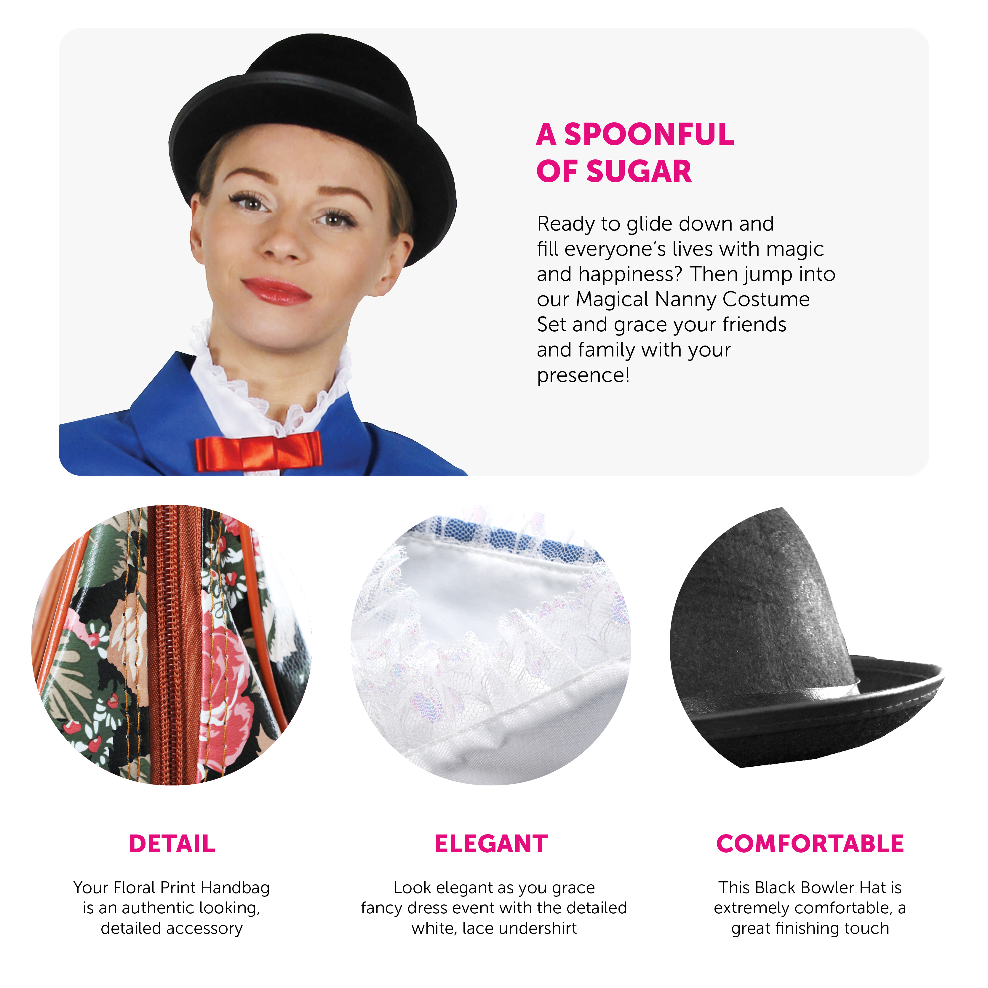 LADIES MAGICAL NANNY COSTUME SET: Ready to glide down and fill everyone’s lives with magic and happiness? Then jump into our Magical Nanny Costume Set and grace your friends and family with your presence!