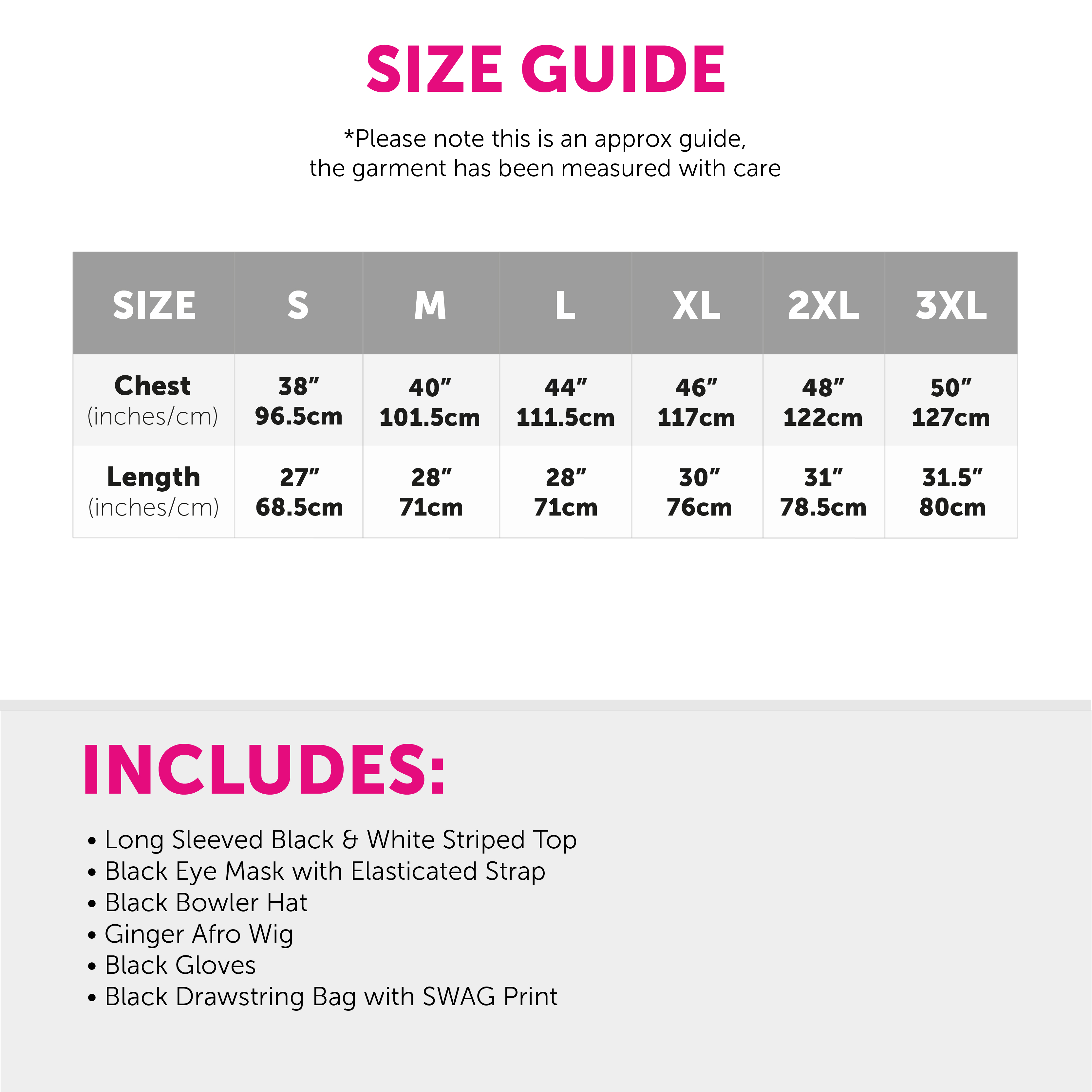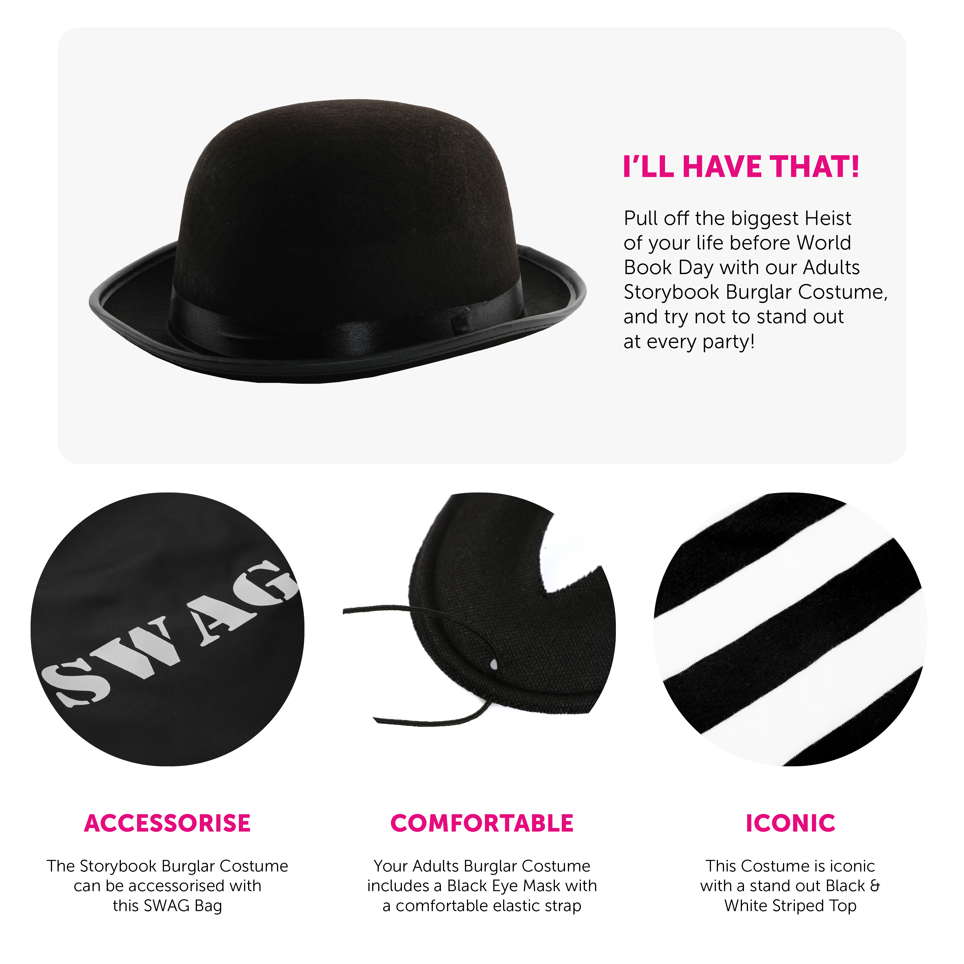 COSTUME SET INCLUDES: This Adults Storybook Burglar Costume includes a Black Bowler Hat, Long Sleeved Black and White Striped Top, a Black Eye Mask on a comfortable elasticated strap, an Ginger Afro Wig, Black Gloves, and a Black Drawstring Bag with SWAG printed on the front, the perfect look for you this World Book Day!