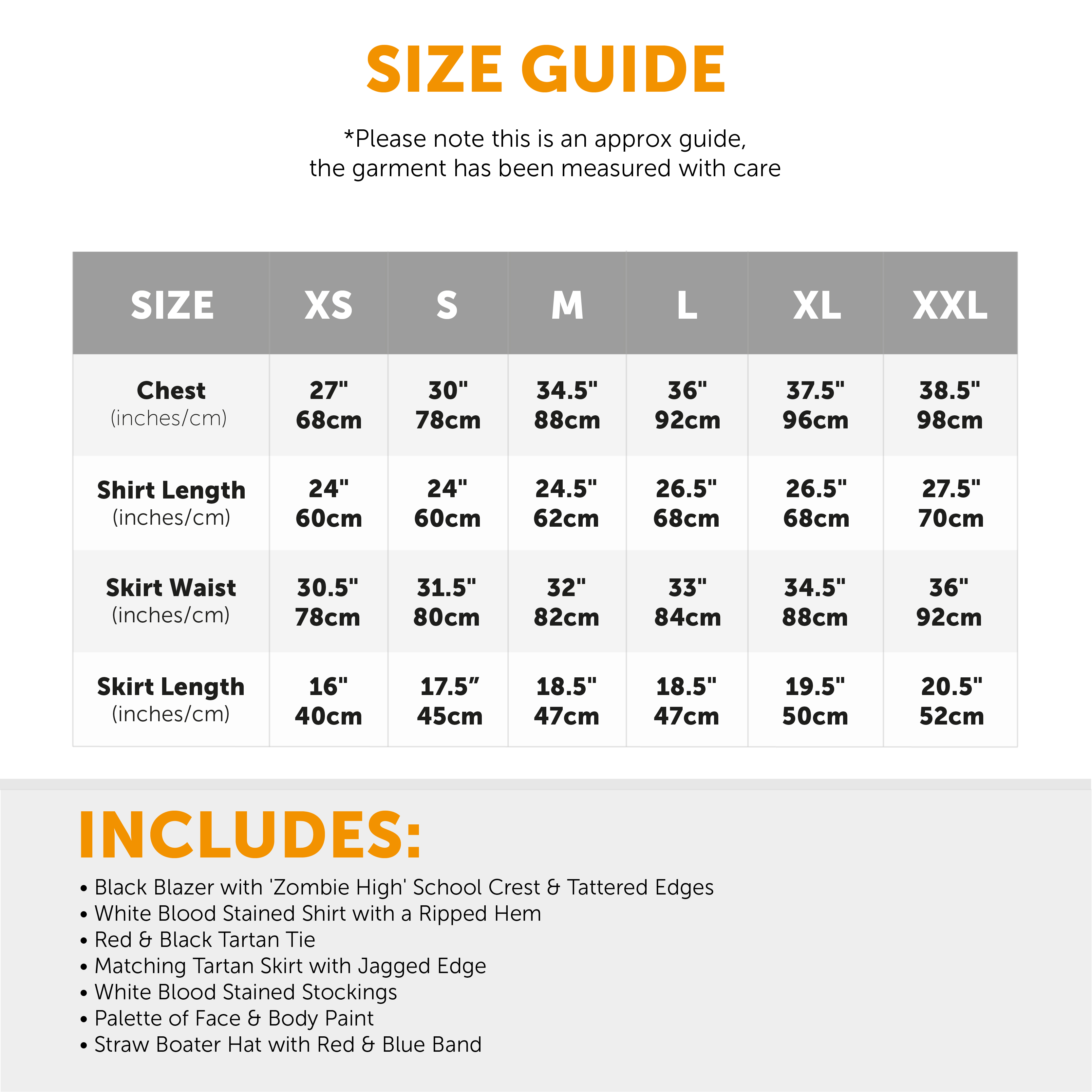AVAILABLE IN MULTIPLE SIZES: Your Ladies Zombie Schoolgirl Costume is available in multiple sizes from X-Small to XX-Large: X-Small - Chest 27" (68cm), Shirt Length 24" (60cm), Waist 30.5" (78cm), Skirt Length 16" (40cm) | Small - Chest 30" (78cm), Shirt Length 24" (60cm), Waist 31.5" (80cm), Skirt Length 17.5" (45cm) | Medium - Chest 34.5" (88cm), Shirt Length 24.5" (62cm), Waist 32" (82cm), Skirt Length 18.5" (47cm) | Large - Chest 36" (92cm), Shirt Length 26.5" (68cm), Waist 33" (84cm), Skirt Length 18.5" (47cm) | X-Large - Chest 37.5" (96cm), Shirt Length 26.5" (68cm), Waist 34.5" (88cm), Skirt Length 19.5" (50cm) | XX-Large - Chest 38.5" (98cm), Shirt Length 27.5" (70cm), Waist 36" (92cm), Skirt Length 20.5" (52cm)