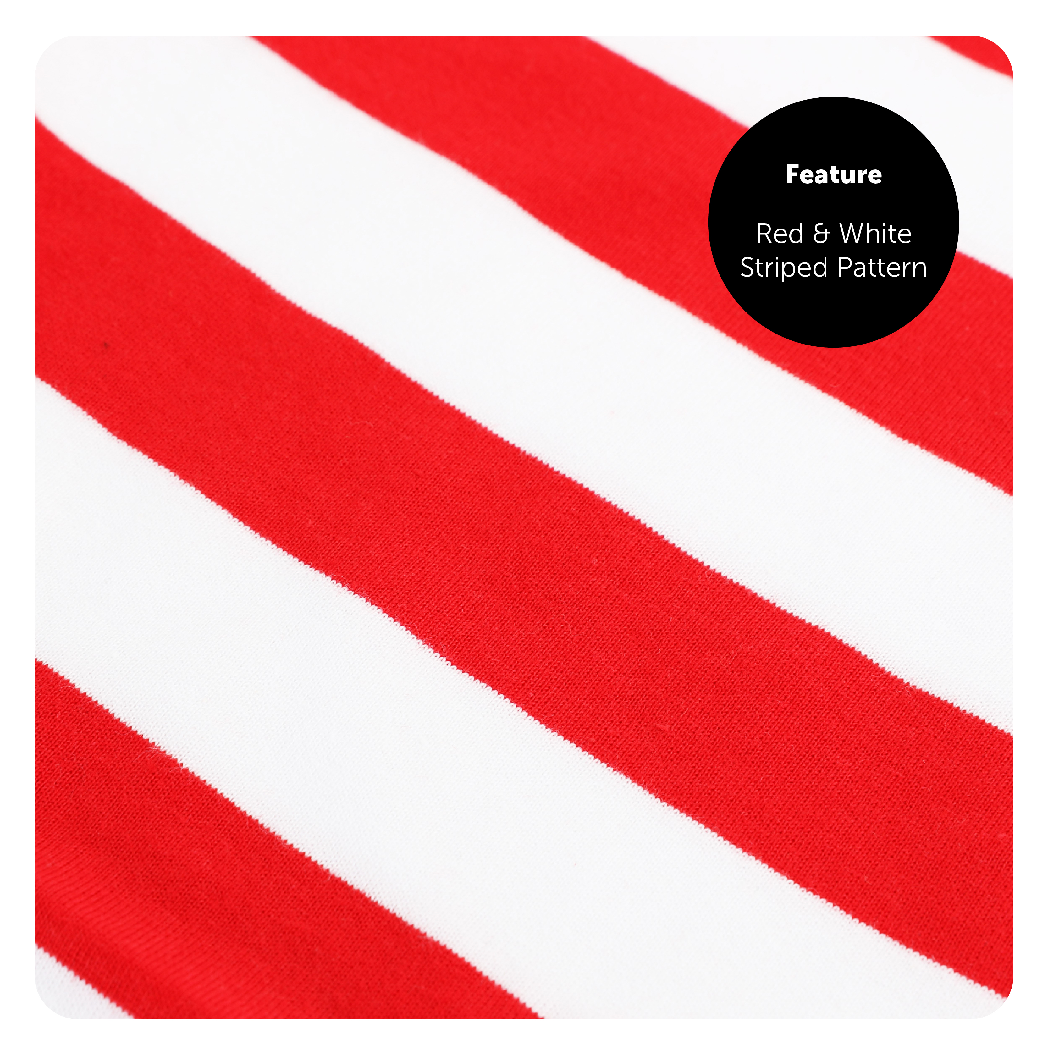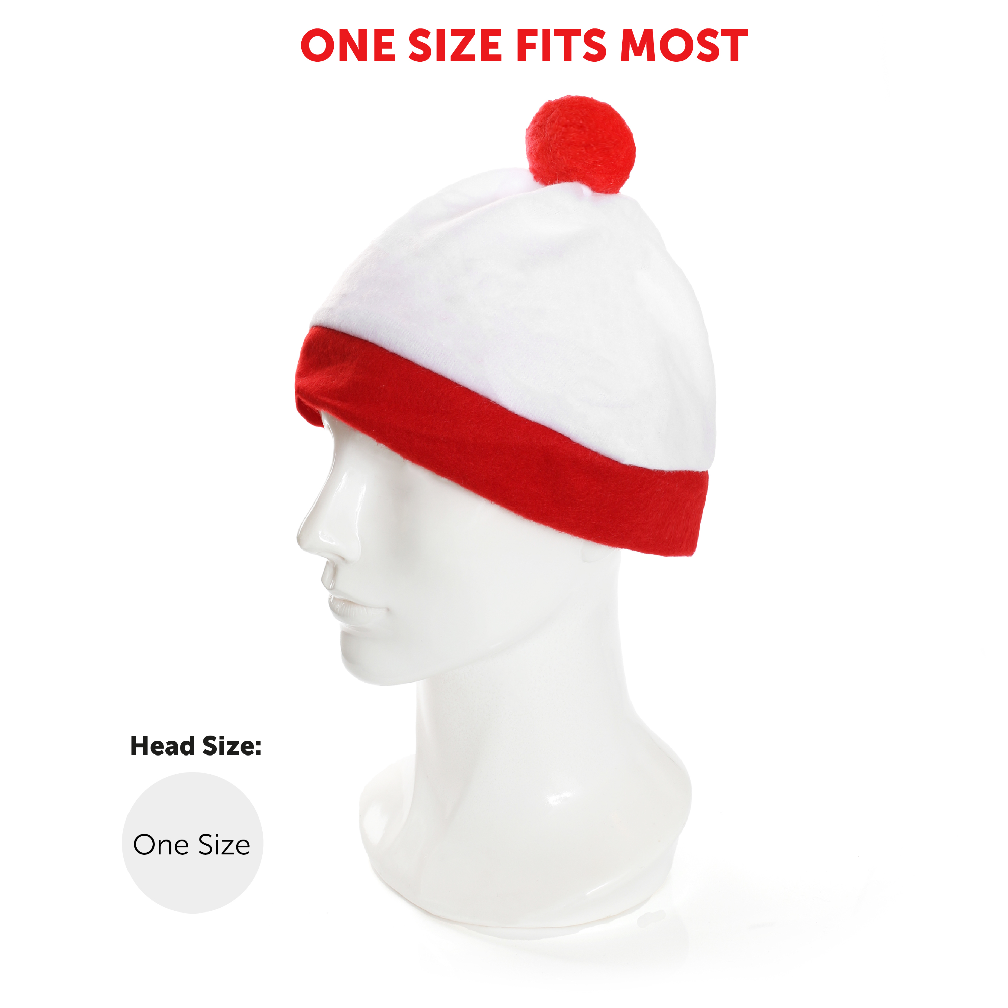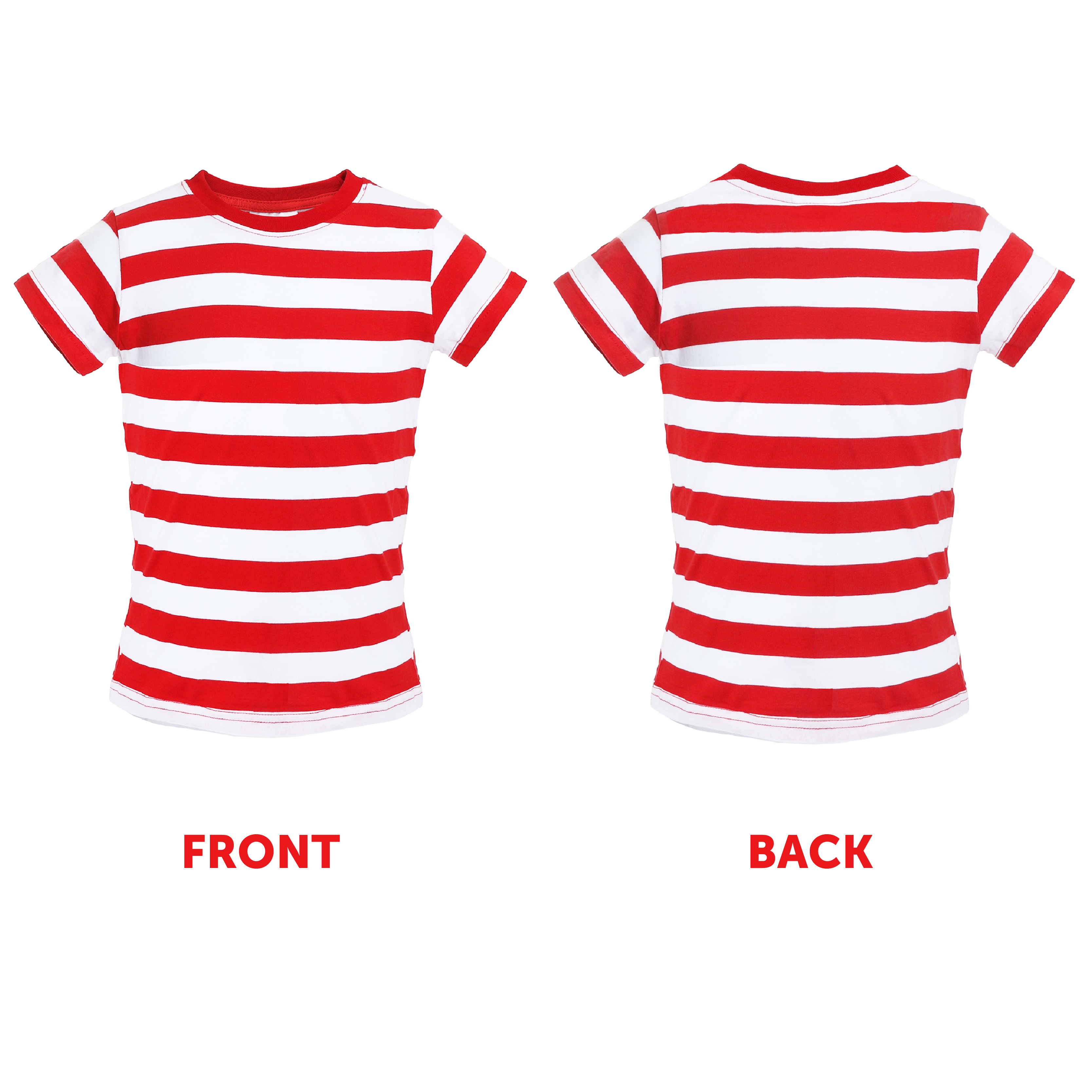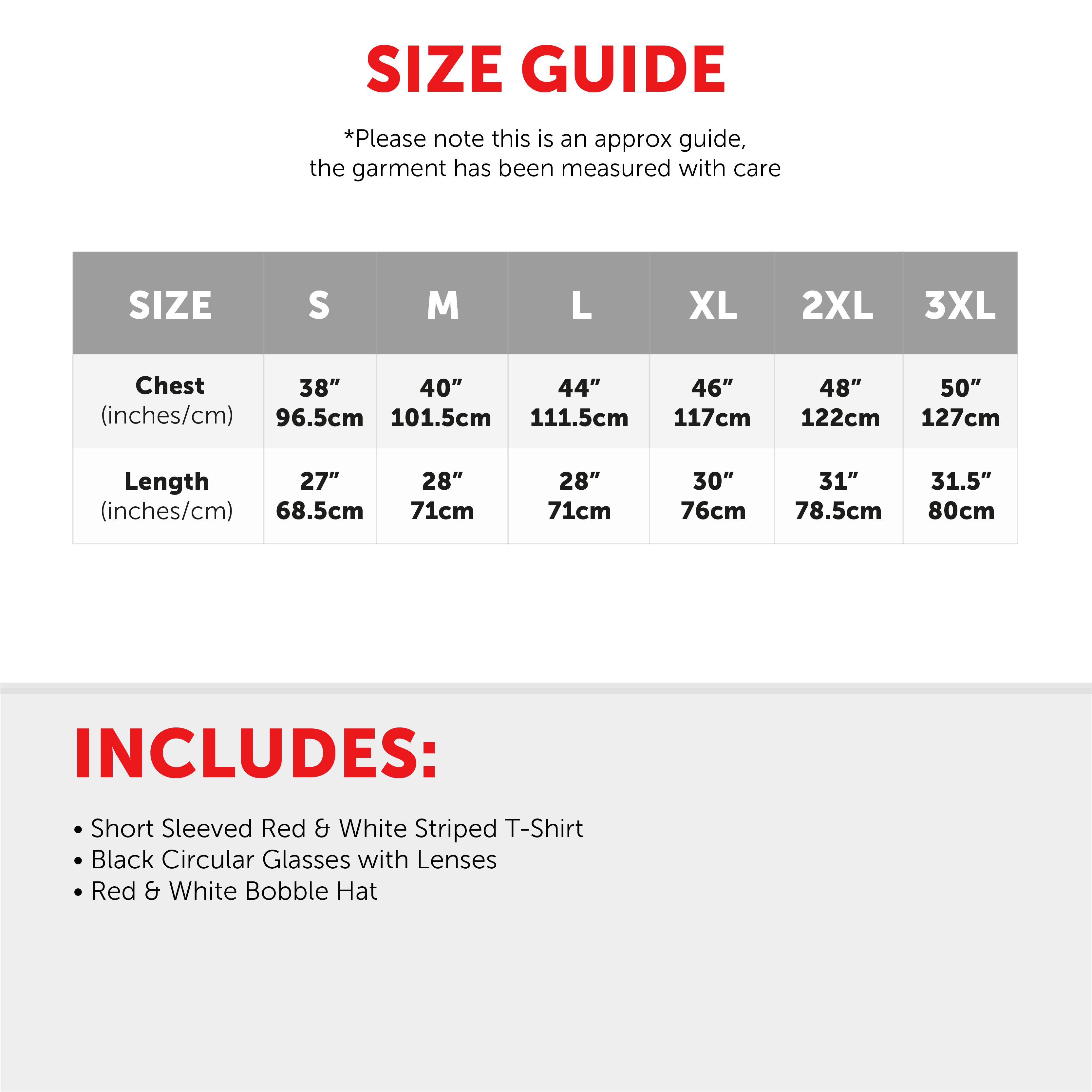 COSTUME DETAILS: Your Adults Find Me Costume Set includes a Short Sleeved Red and White Striped T-Shirt, Black Circular Glasses with lenses, and a Red and White Striped Bobble Hat!