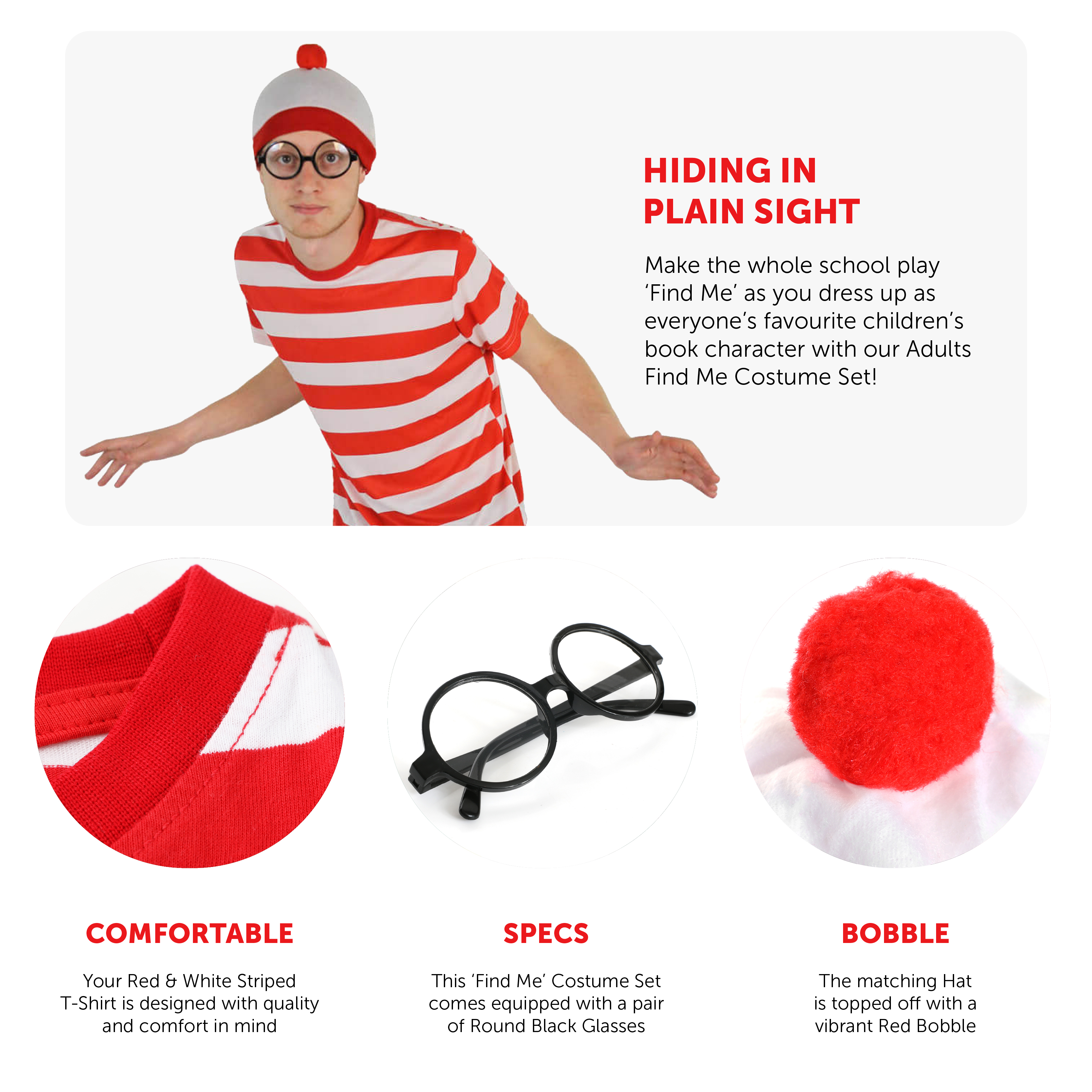 ADULTS FIND ME COSTUME SET: Make the whole school play ‘Find Me’ as you dress up as everyone’s favourite children’s book character with our Adults Find Me Costume Set!
