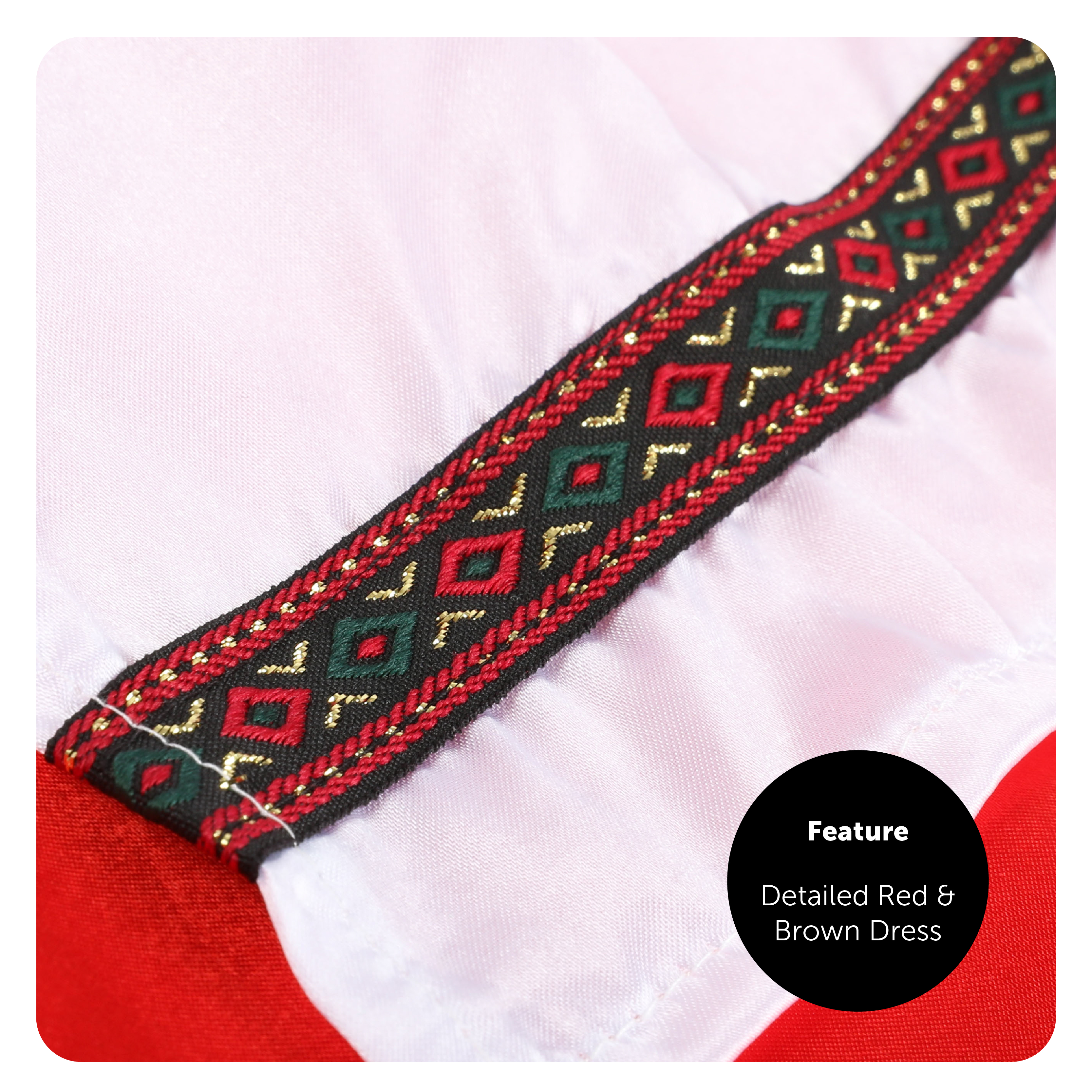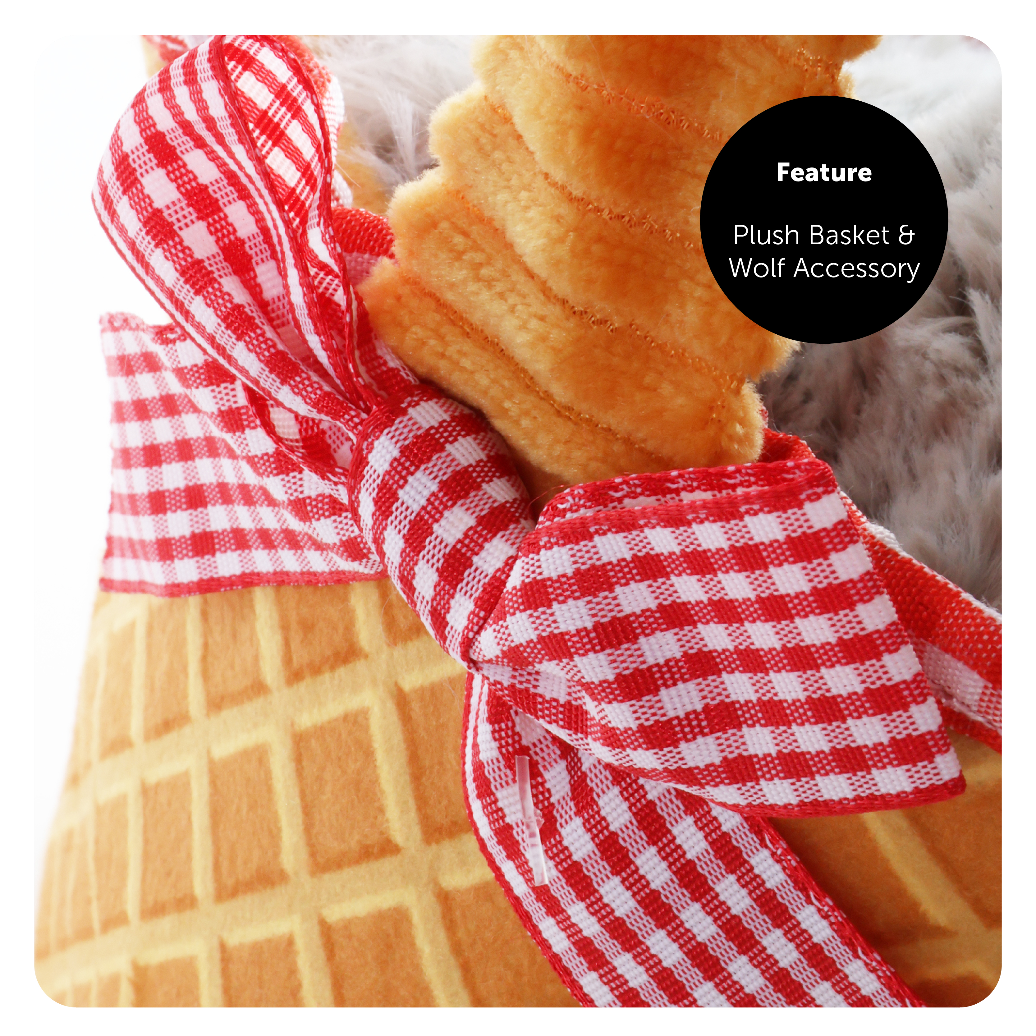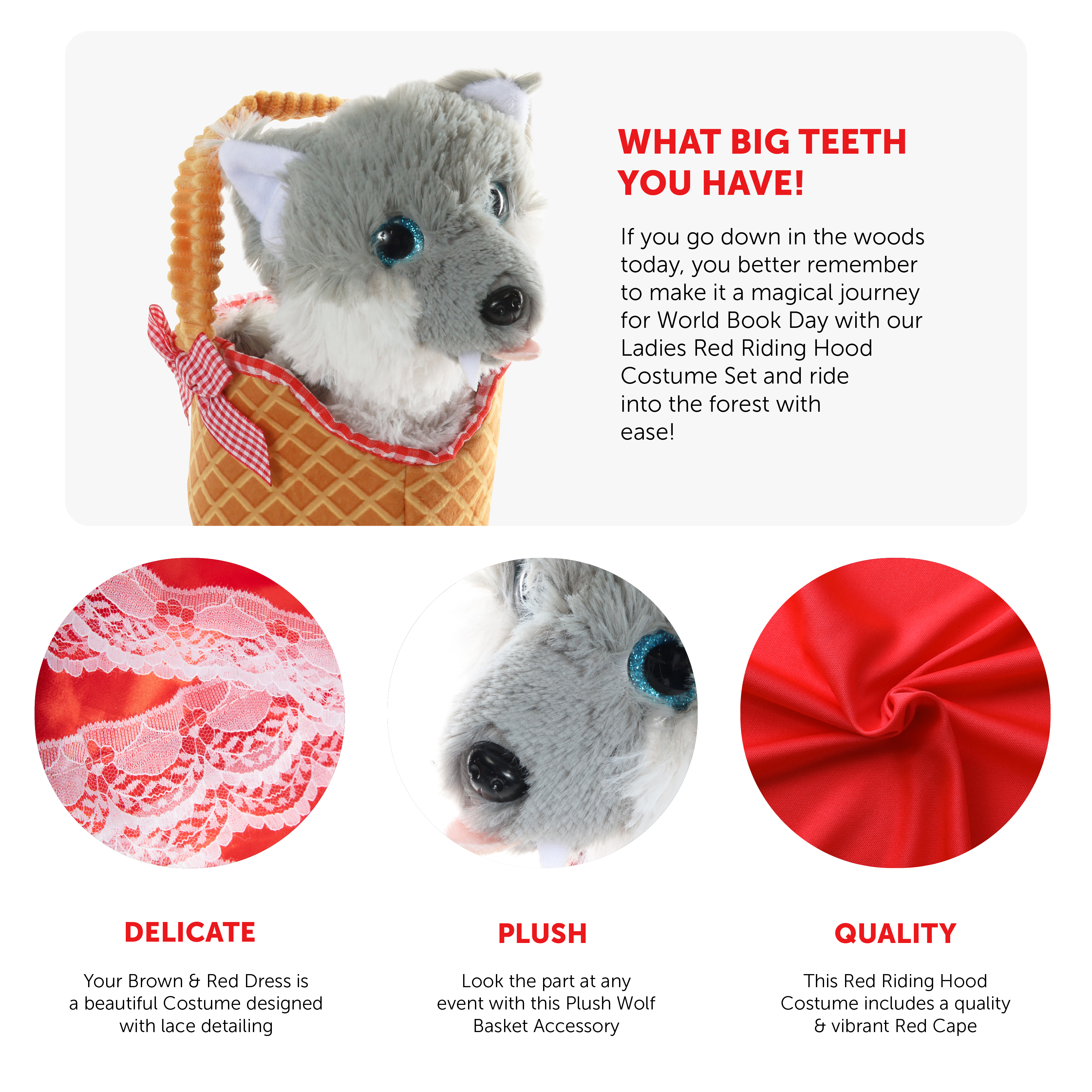 COSTUME INCLUDES: This Red Riding Hood Costume includes a Red Cape with easy tie up fastening, a silk-like Red and Brown Dress with Corset style and lace details, White Tights and a Plush Basket detailed with Red and White Gingham and a Plush Grey Wolf, the perfect look for any fancy dress event!