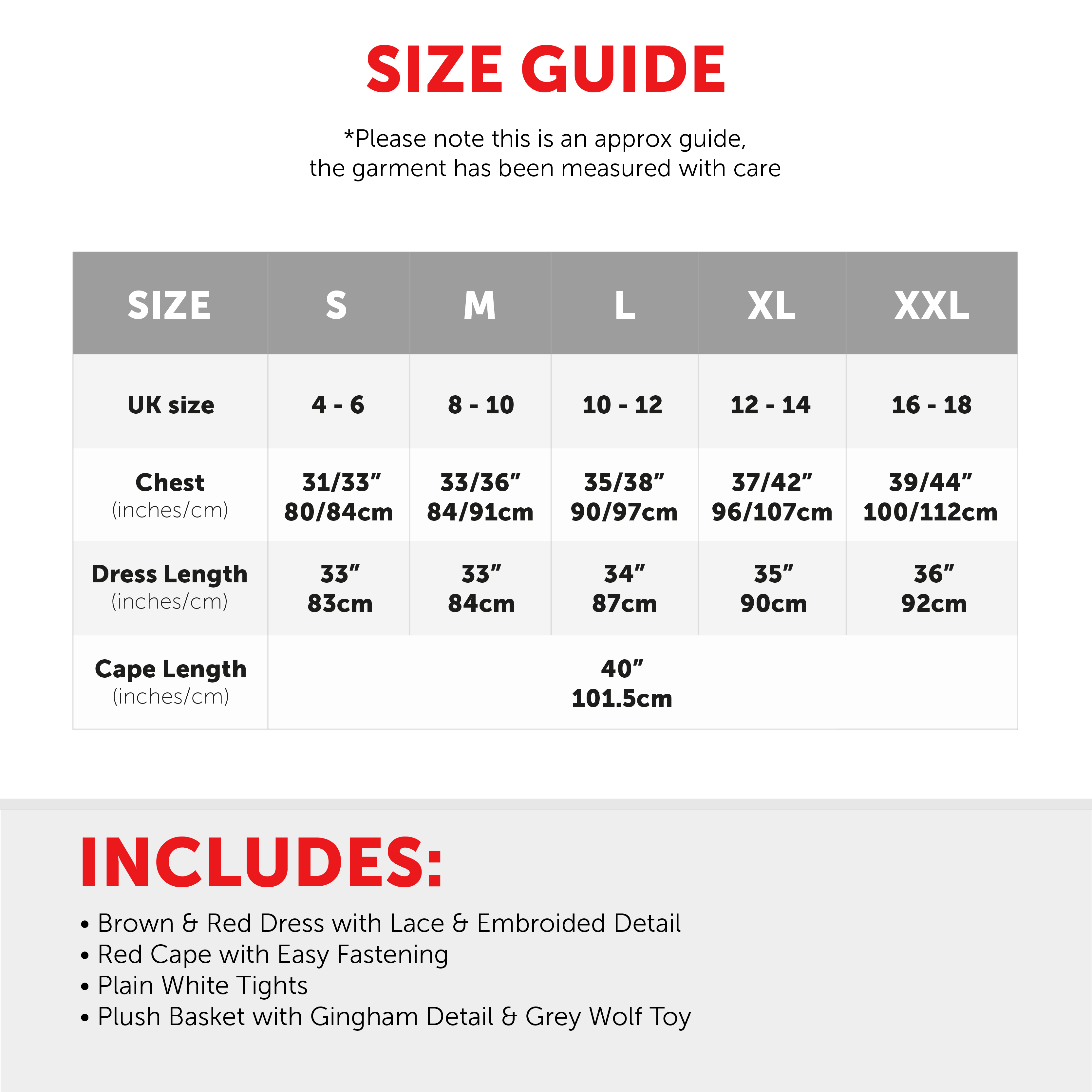AVAILABLE IN MULTIPLE SIZES: Your Ladies Red Riding Hood Costume is available in multiple sizes from Small to XX-Large: Small (UK 4 - 6) Chest: 31/33” (80/84cm), Length: 33” (83cm) | Medium (UK 8 - 10) Chest: 33/36” (84/91cm), Length: 33” (84cm) | Large (UK 10 - 12) Chest: 35/38” (90/97cm), Length: 34” (87cm) | X-Large (UK 12 - 14) Chest: 37/42” (96/107cm), Length: 35” (90cm) | XX-Large (UK 16 - 18) Chest: 39/44” (100/112cm), Length: 36” (92cm)