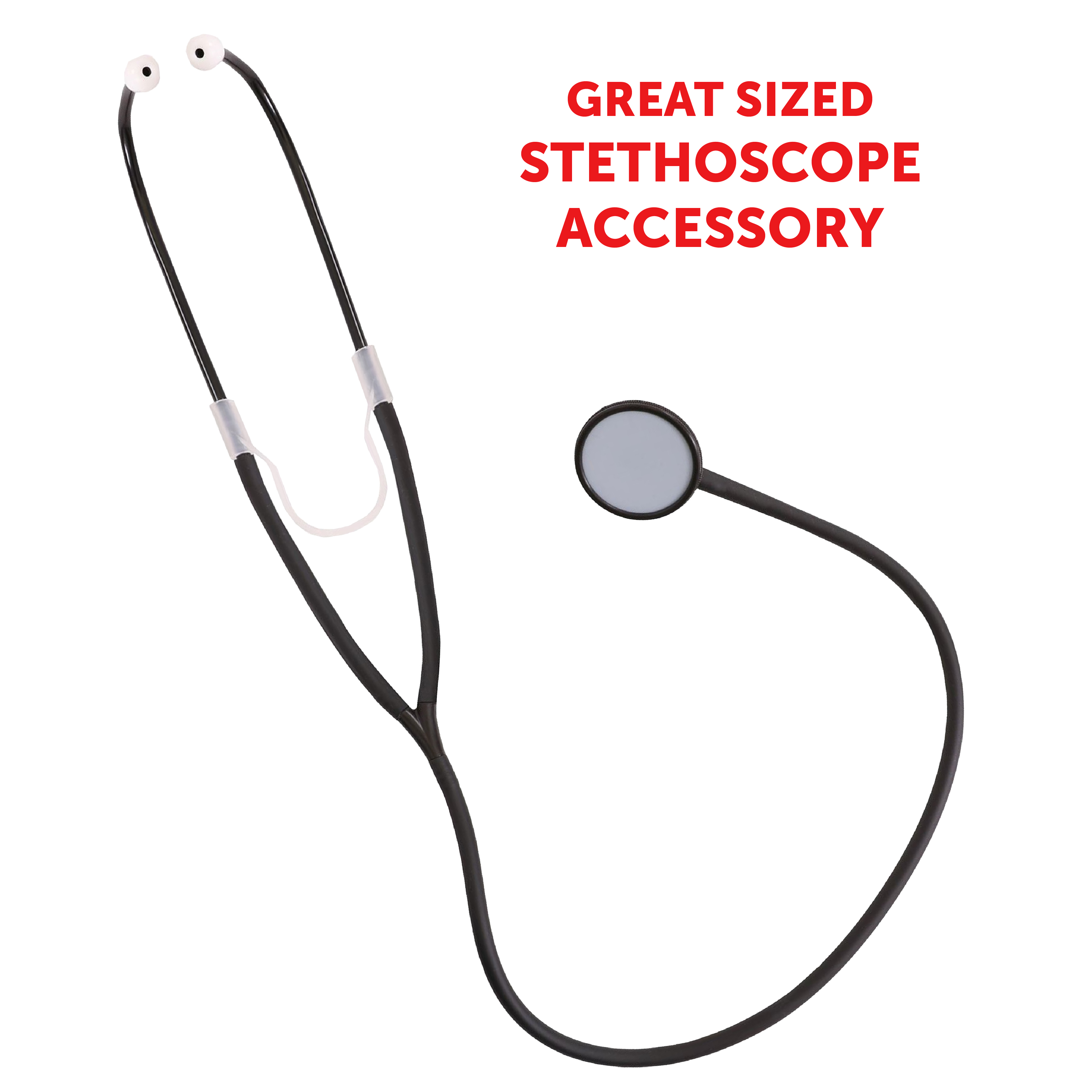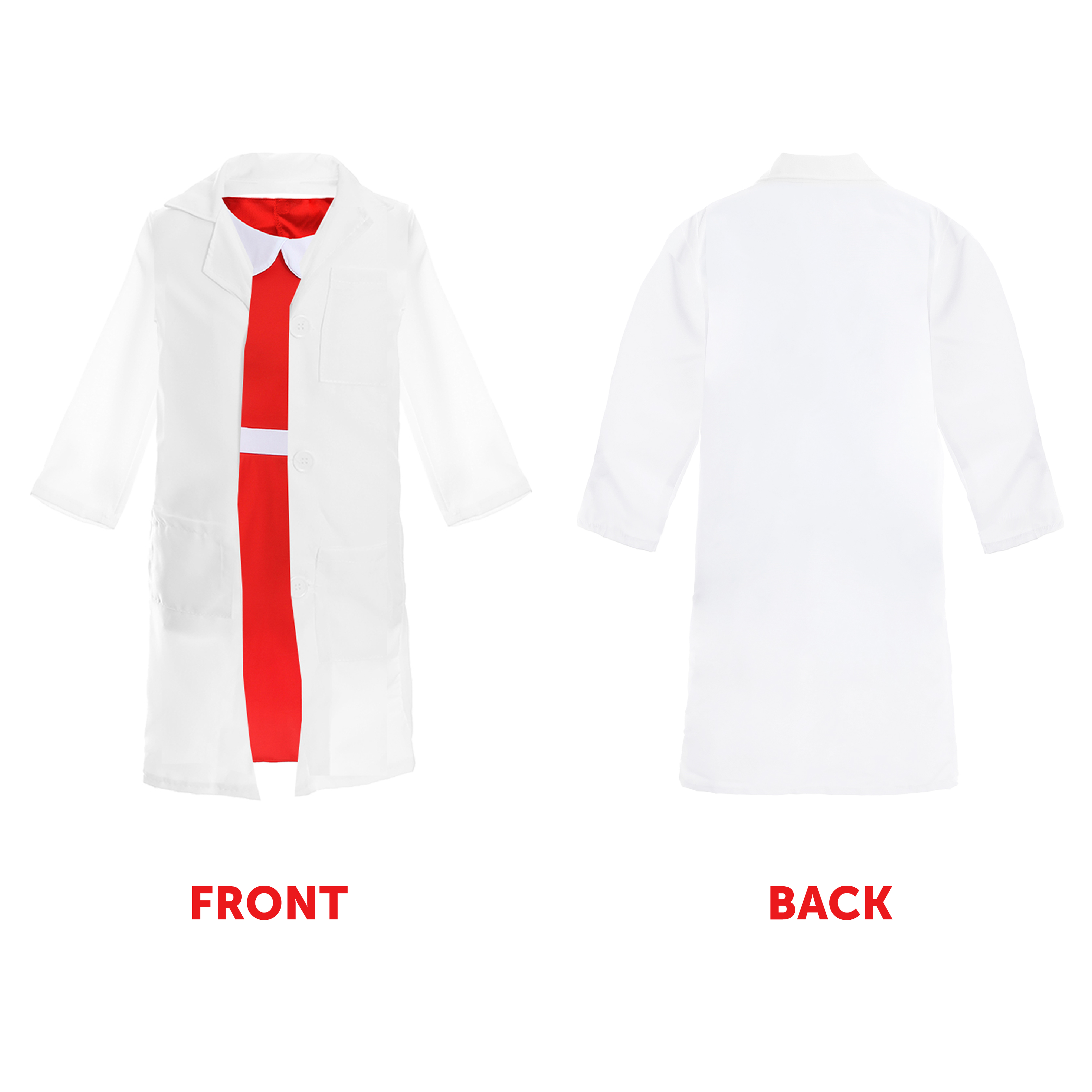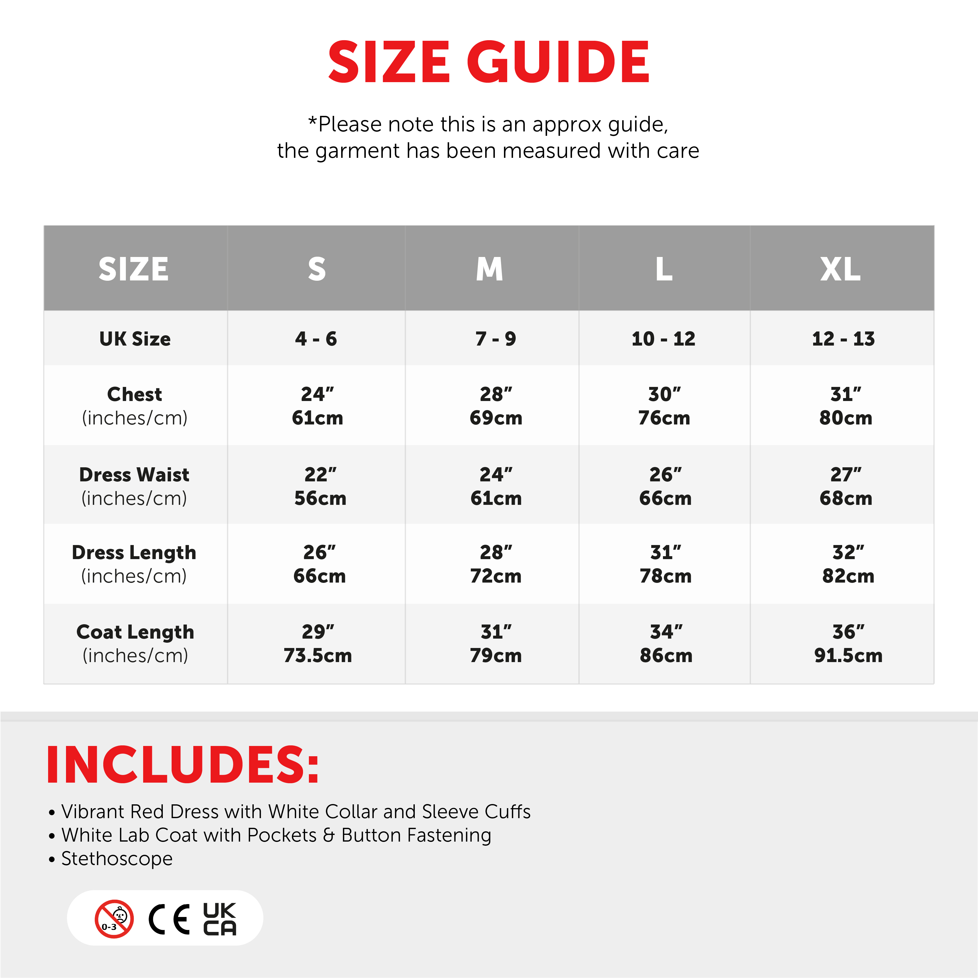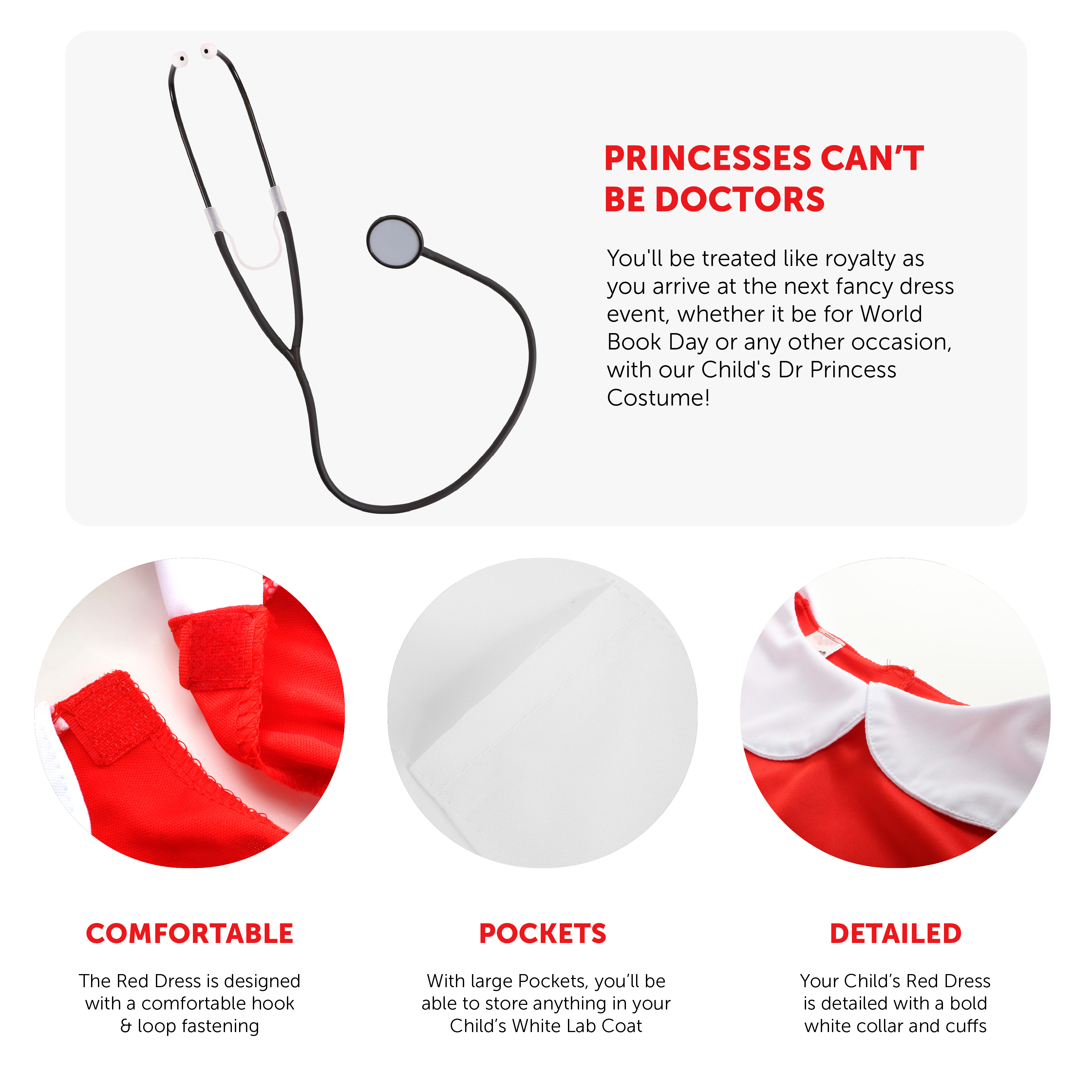 COSTUME INCLUDES: Your Child's Dr Princess Costume includes a long White Lab Coat with button fastening, a Red Dress with White Cuff and Collar detail, and a Stethoscope, the perfect look for World Book Day!