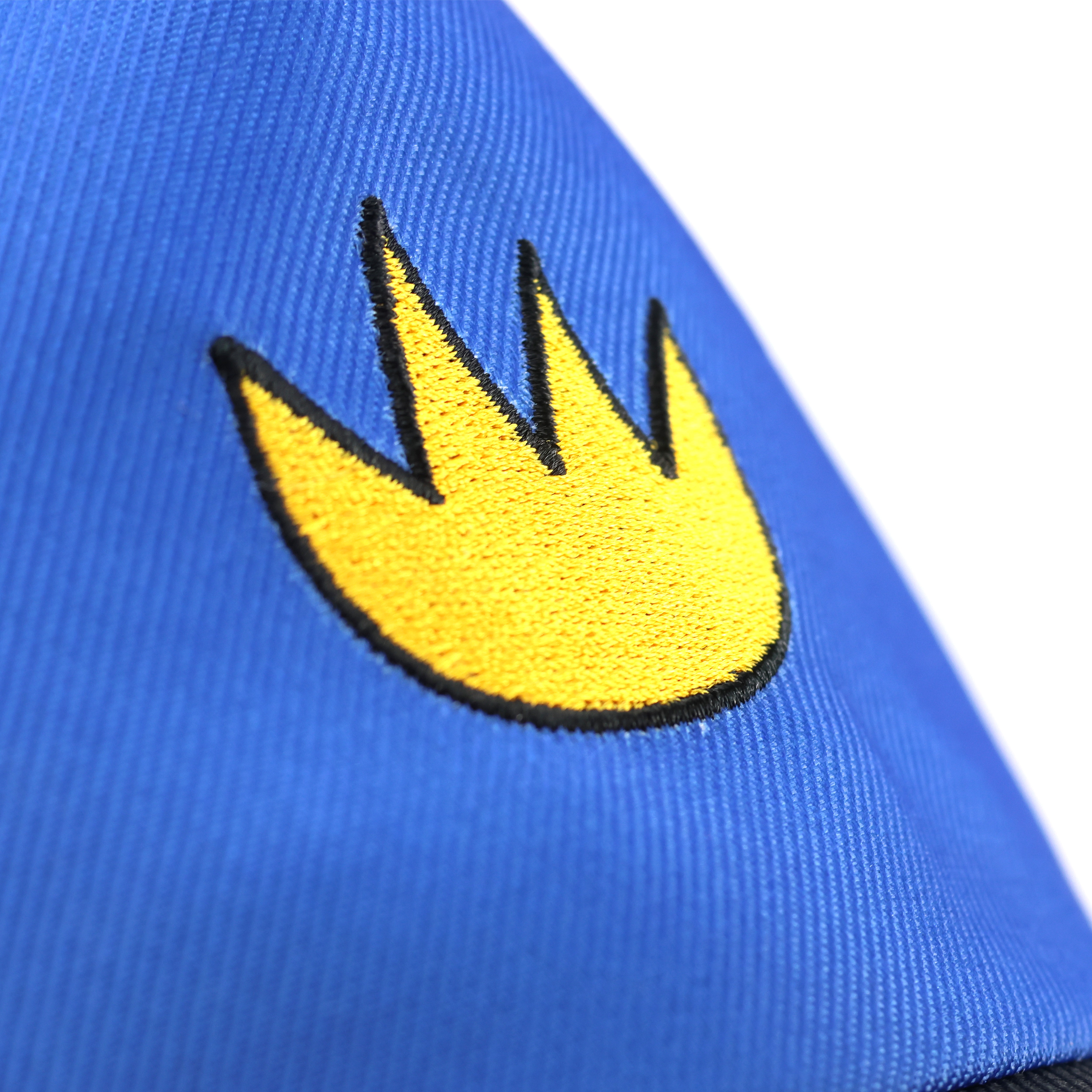- Blue short-sleeved T-shirt with a bold gold crown printed on the front