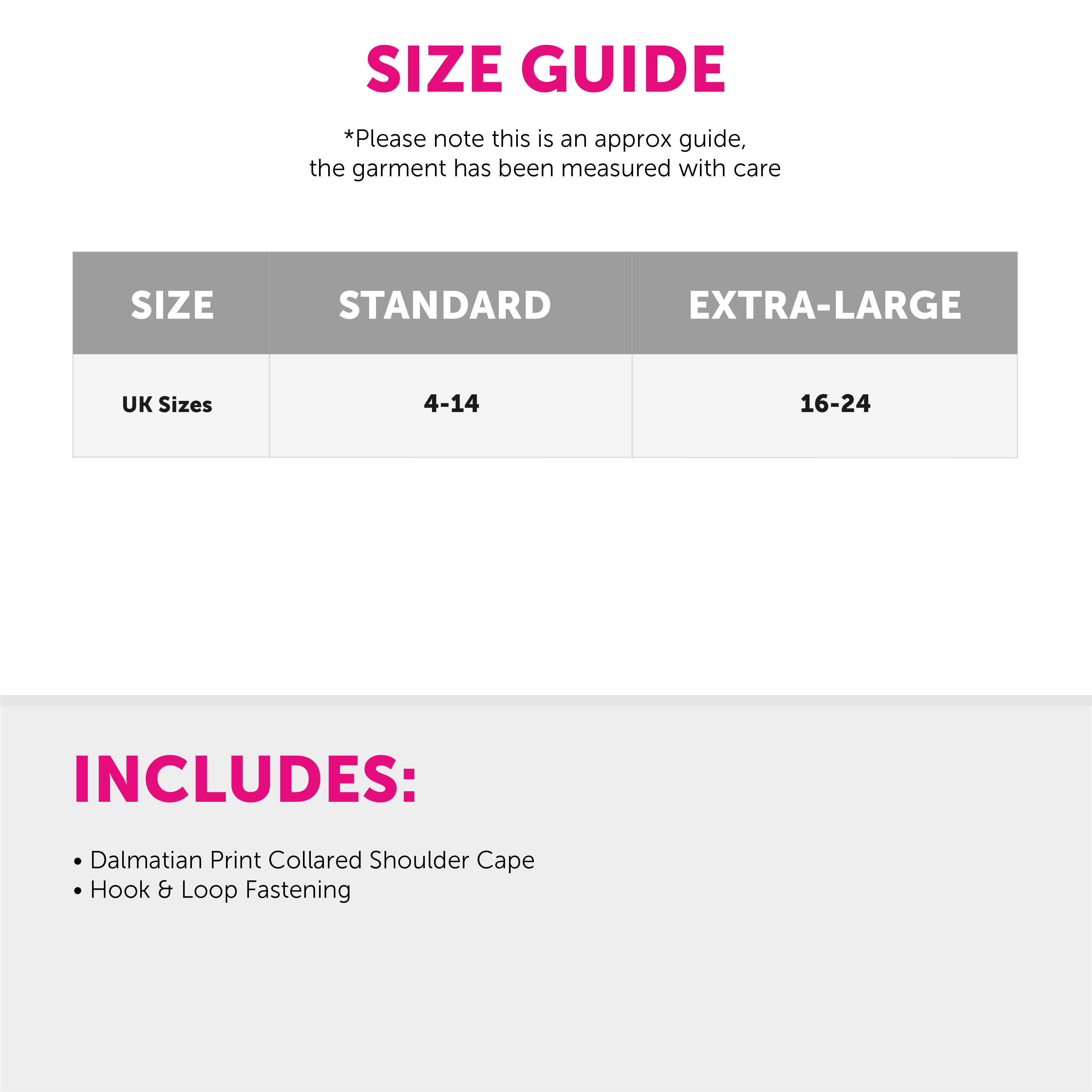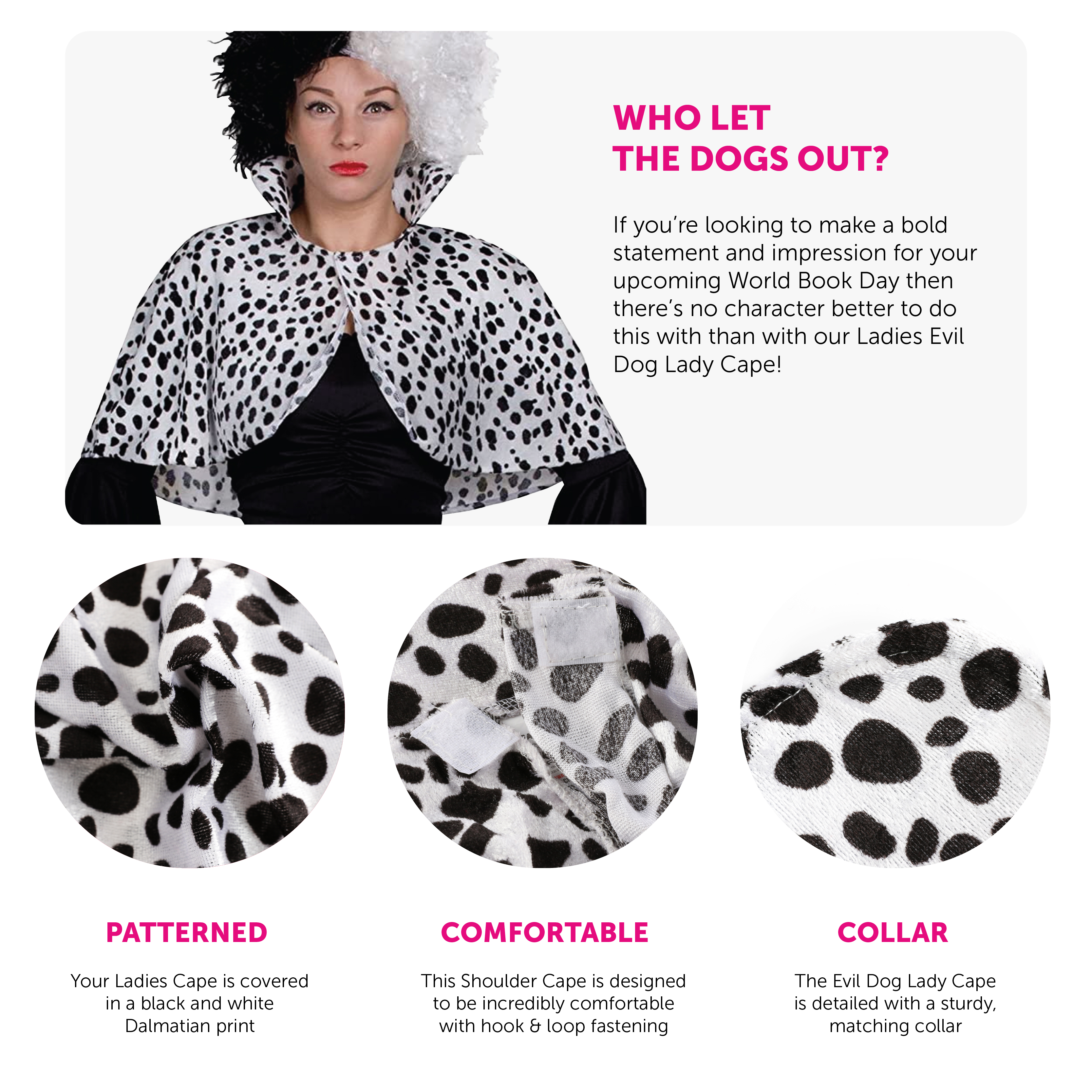 COSTUME DETAILS: Our Evil Dog Lady Cape includes a Dalmatian Print Over-the-Shoulder Cape, which uses a hook and loop buttoning system, with a stand collar for your extra look of prestige and class!