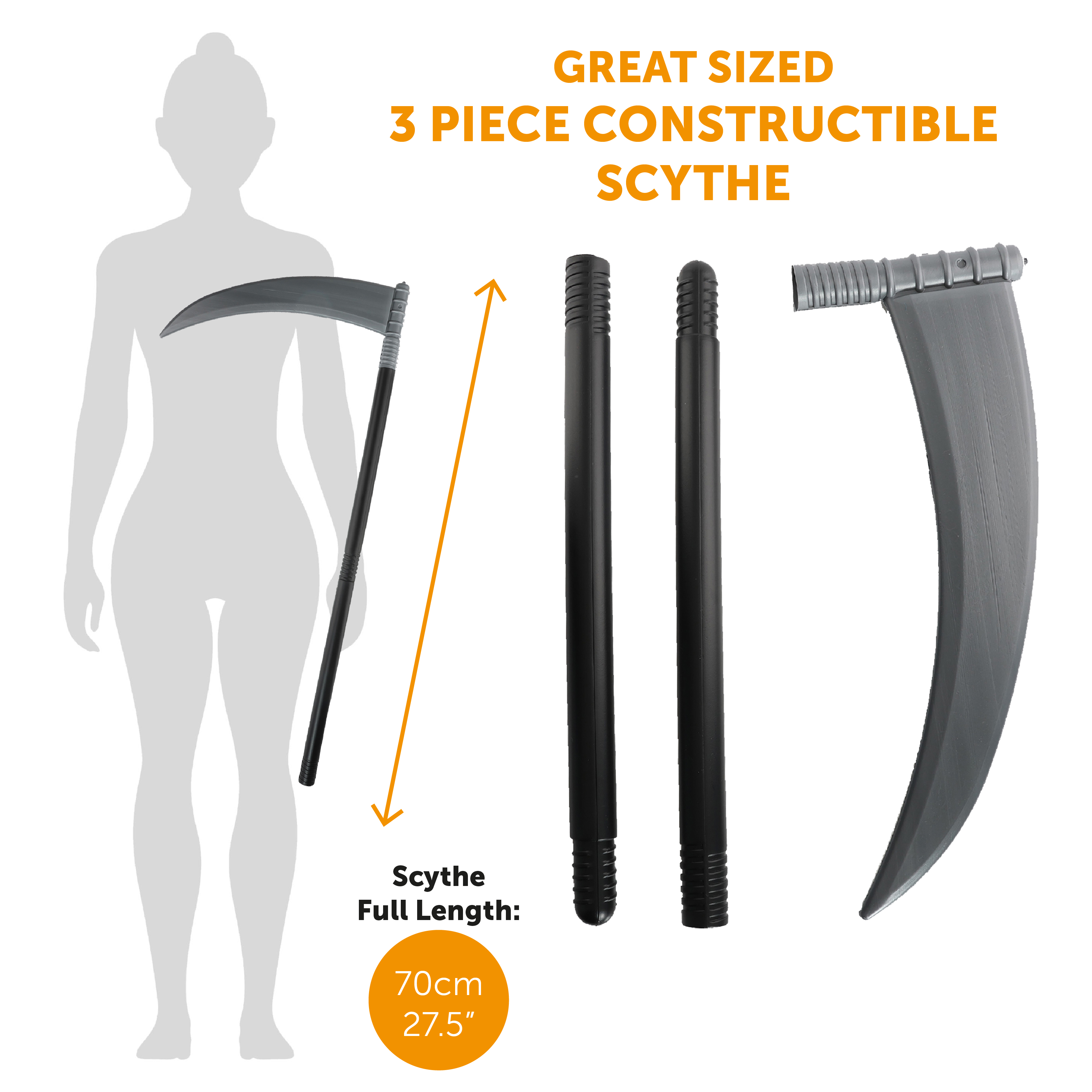SCYTHE MEASUREMENTS: Your Reaper Scythe is a constructible Scythe composed of 3 pieces, 2 black screw in handles & 1 Grey screw in blade, once fully constructed this Scythe measures a full length of 27.5" (70cm)