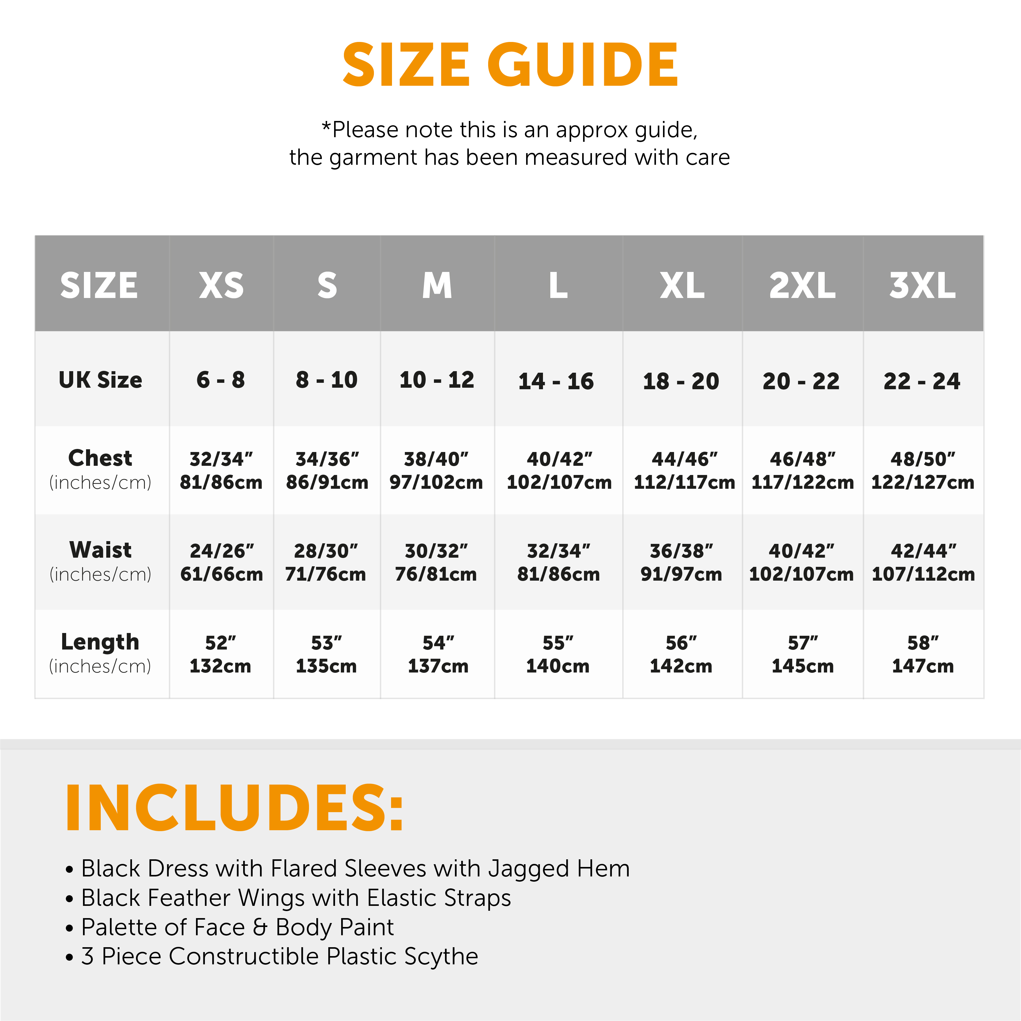 AVAILABLE IN MULTIPLE SIZES: This Ladies Halloween Reaper Costume is available in multiple sizes from X-Small to XXX-Large: X-Small (UK 6 - 8) Chest 32/34" (81/86cm), Waist 24/26" (61/66cm), Length 52" (132cm) | Small (UK 8 - 10) Chest 34/36" (86/91cm), Waist 28/30" (71/76cm), Length 53" (135cm) | Medium (UK 10 - 12) Chest 38/40" (97/102cm), Waist 30/32" (76/81cm), Length 54" (137cm) | Large (UK 14 - 16) Chest 40/42" (102/107cm), Waist 32/34" (81/86cm), Length 55" (140cm) | X-Large (UK 18 - 20) Chest 44/46" (112/117cm), Waist 36/38" (91/97cm), Length 56" (142cm) | XX-Large (UK 20 - 22) Chest 46/48" (117/122cm), Waist 40/42" (102/107cm), Length 57" (145cm) | XXX-Large (UK 22 - 24) Chest 48/50" (122/127cm), Waist 42/44" (107/112cm), Length 58" (147cm)
