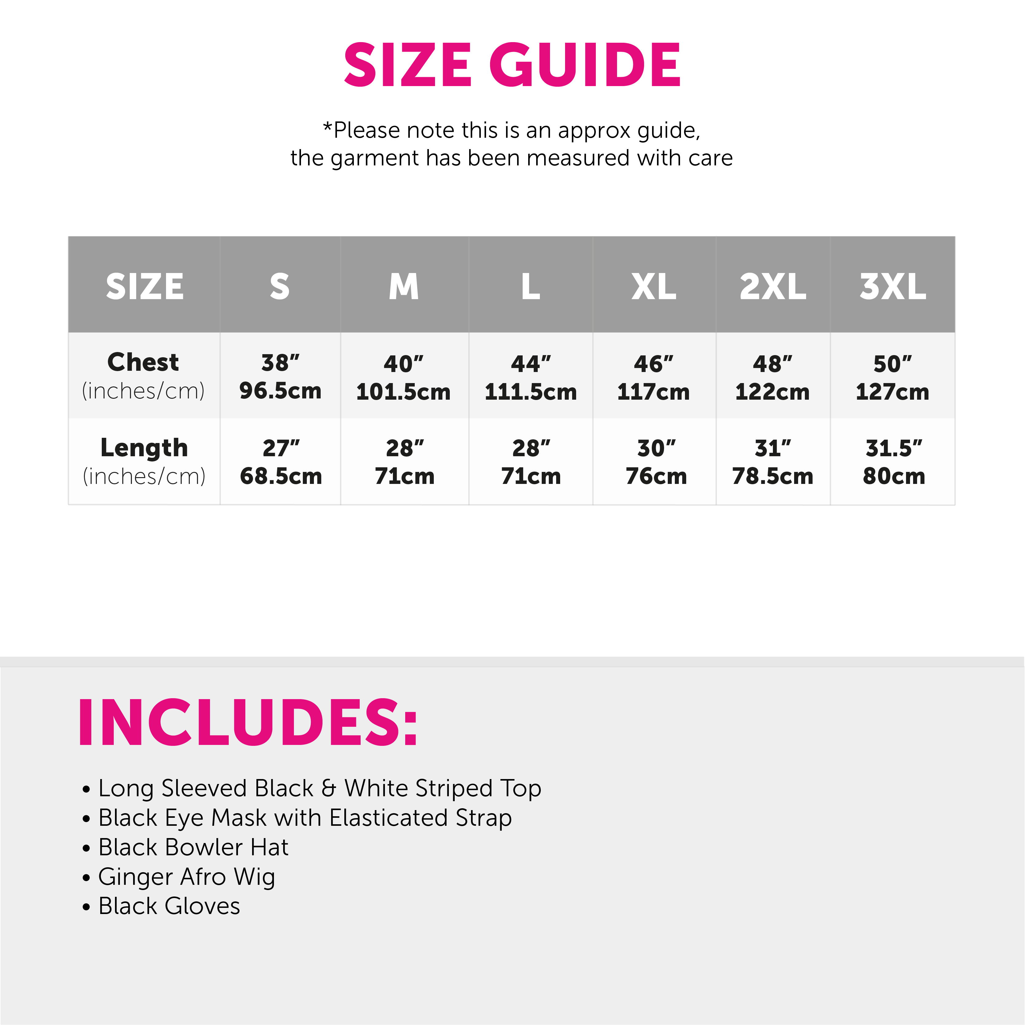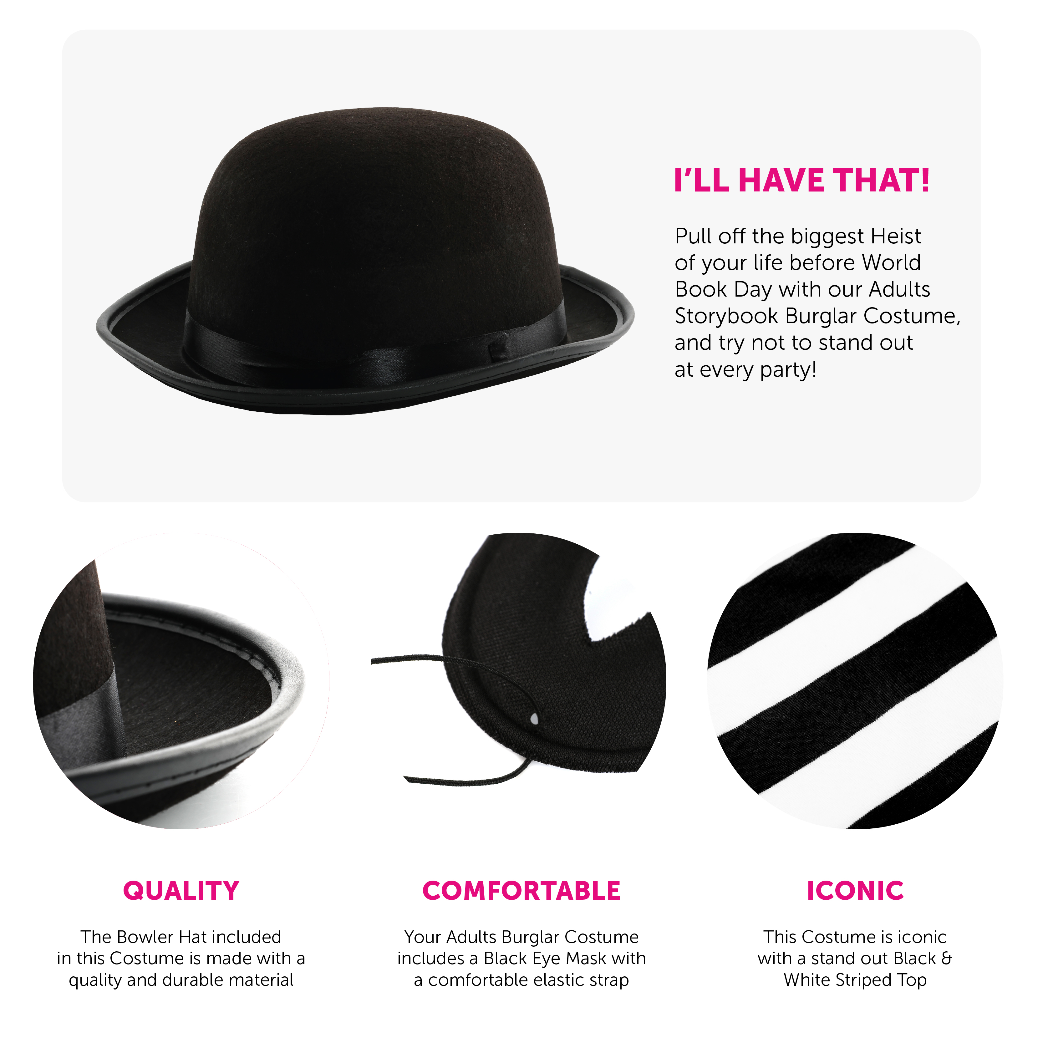 COSTUME SET INCLUDES: This Adults Storybook Burglar Costume includes a Black Bowler Hat, Long Sleeved Black and White Striped Top, a Black Eye Mask on a comfortable elasticated strap, an Ginger Afro Wig, and Black Gloves, the perfect look for you this World Book Day!