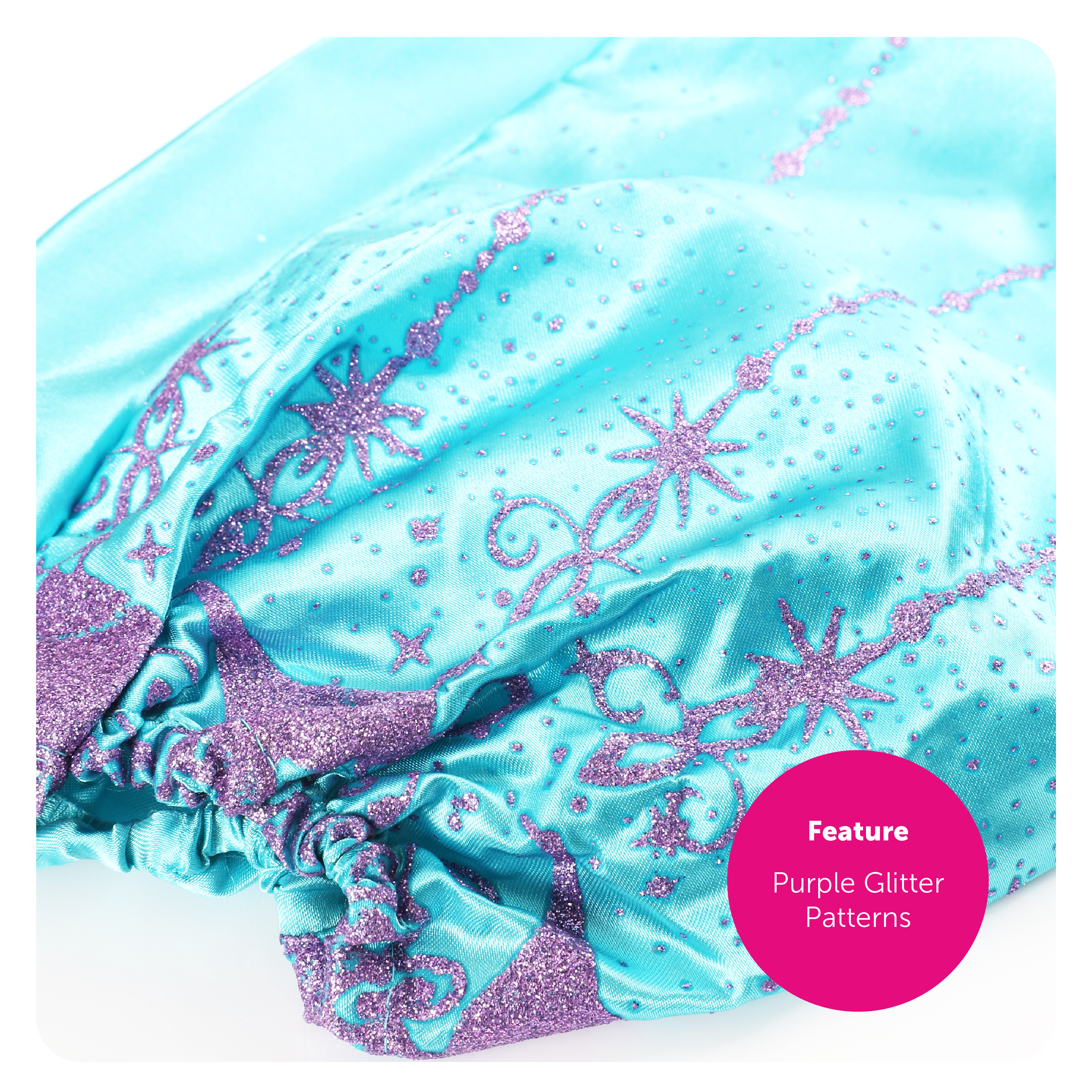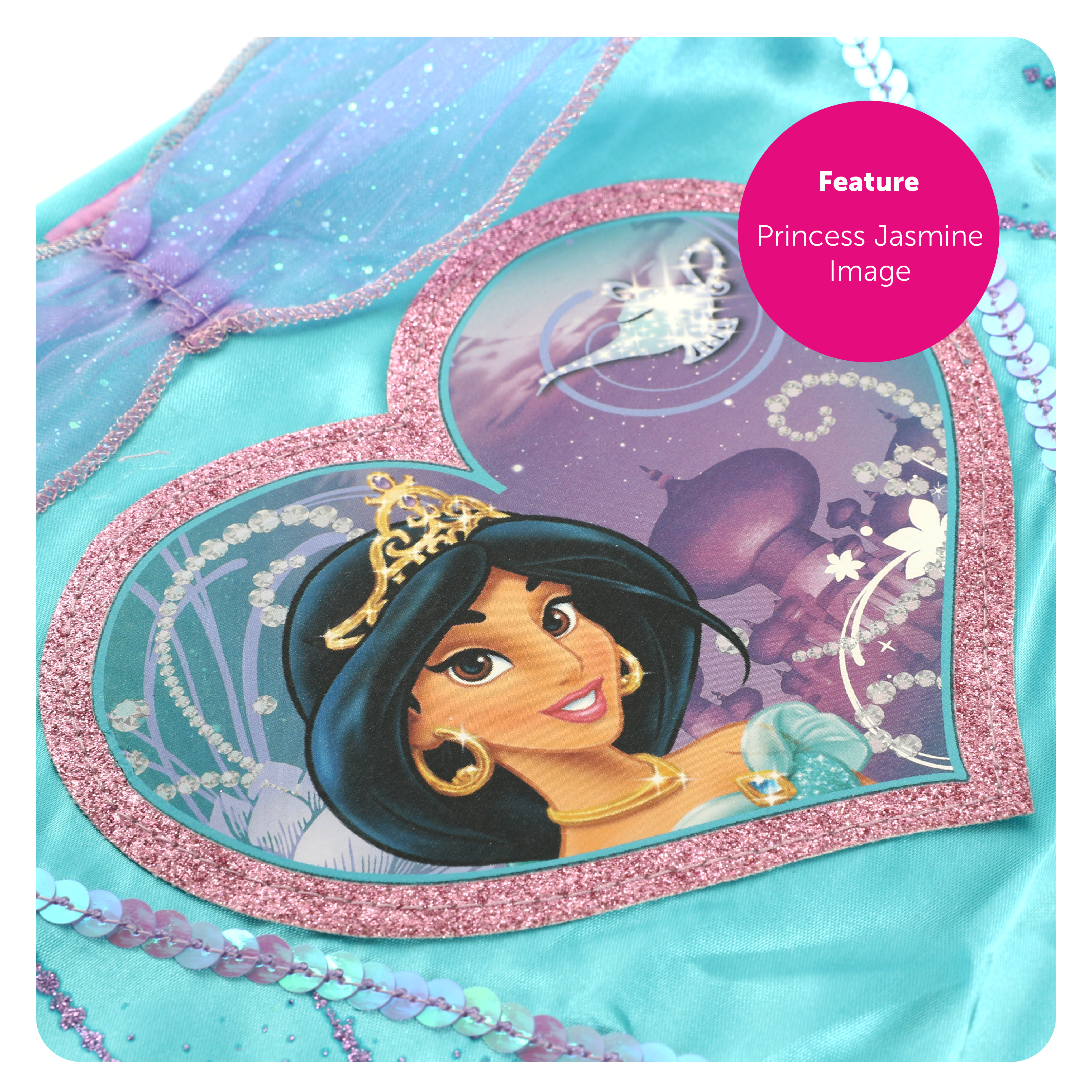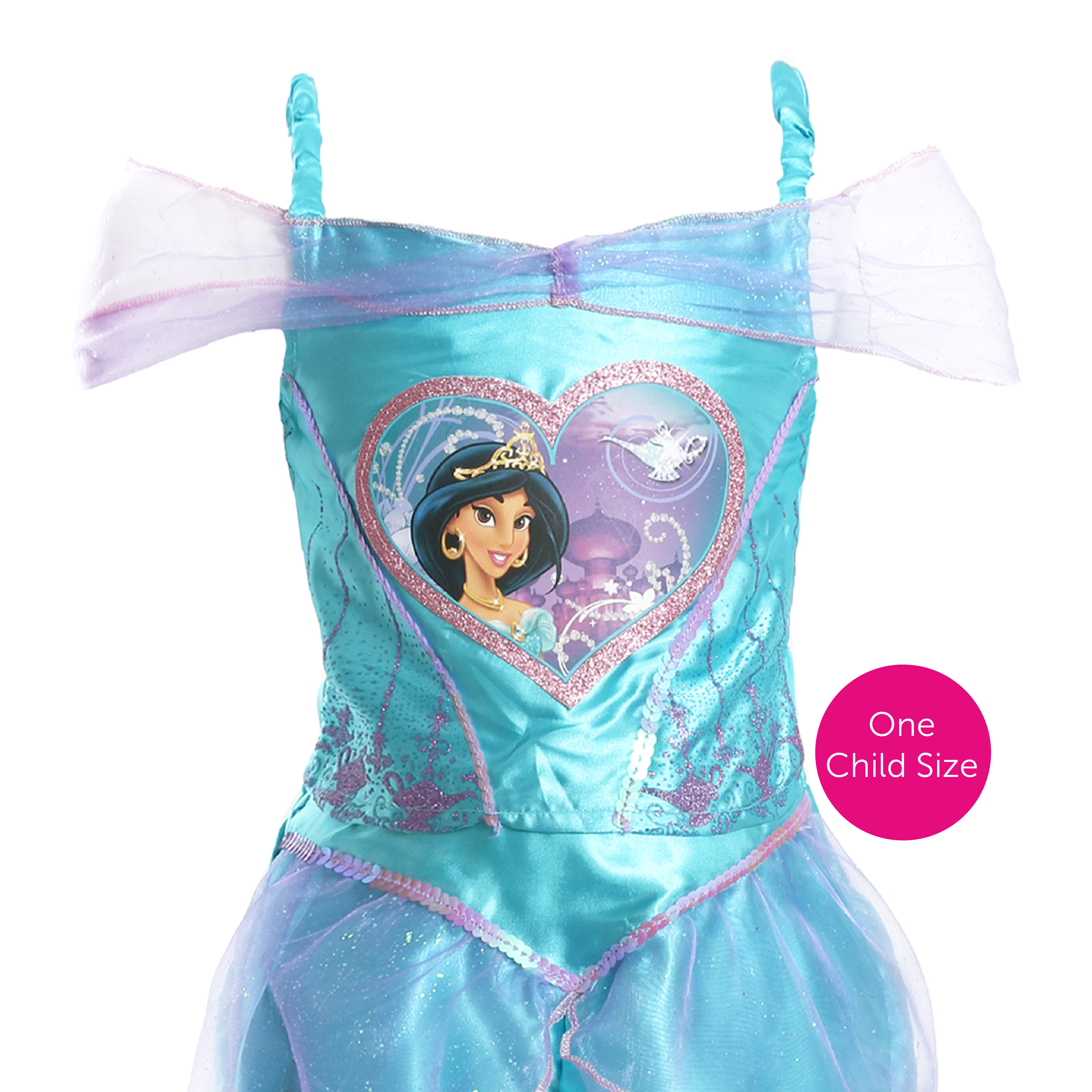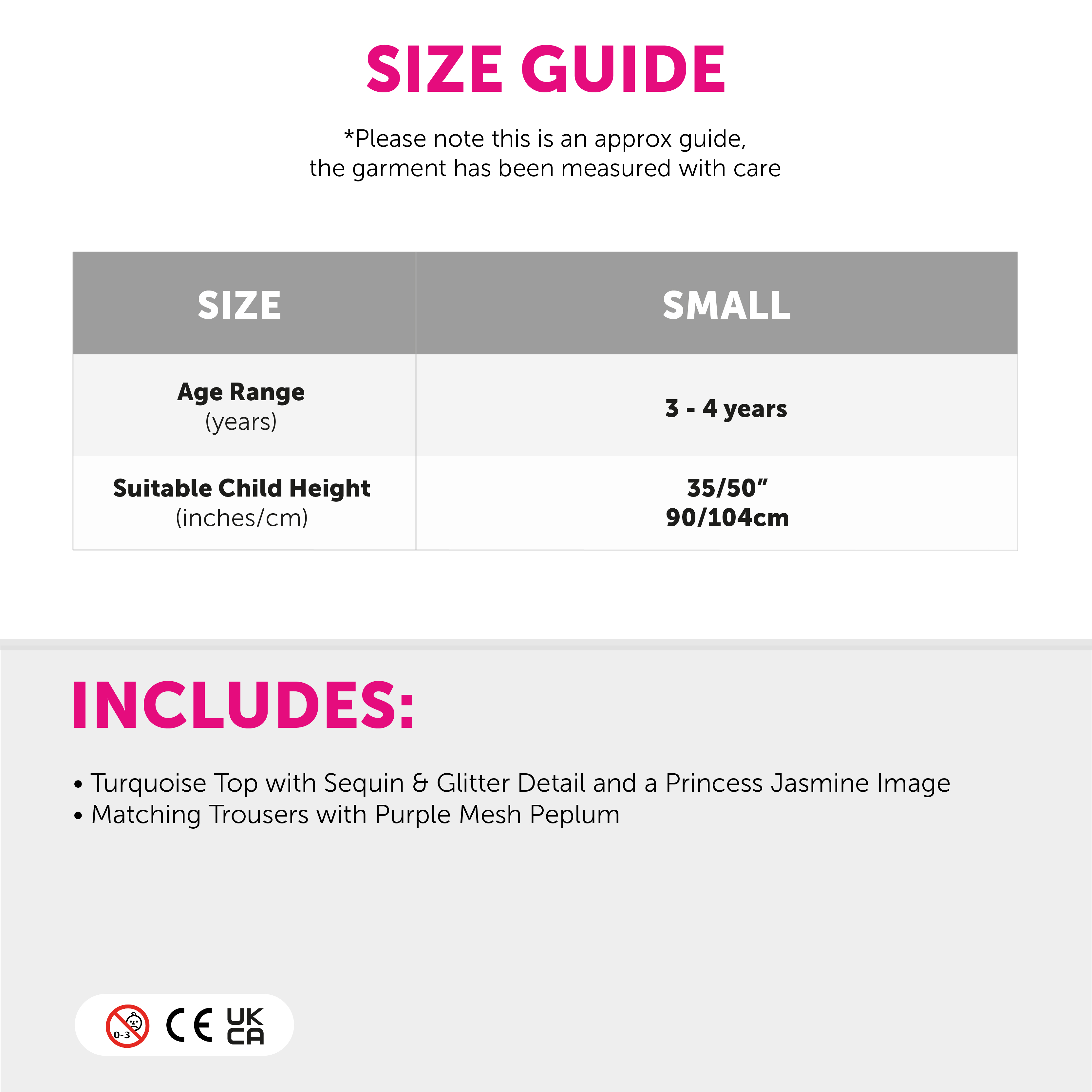 COSTUME INCLUDES: Your Child's Princess Jasmine Costume includes a Turquoise satin feel Top detailed with a Princess Jasmine image and Purple Glitter detail and matching Turquoise Trousers with an attached Purple mesh peplum with sequin detail!