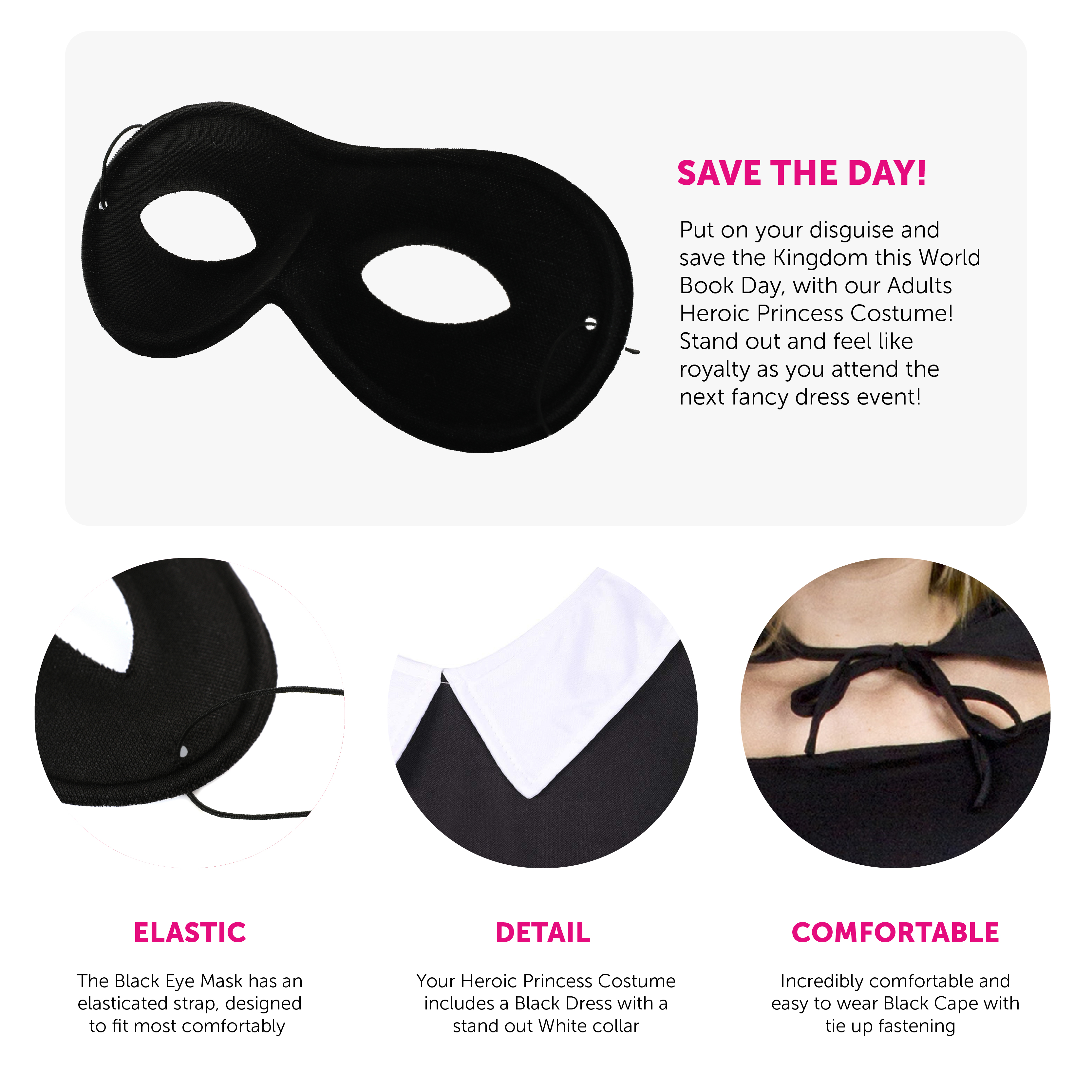 COSTUME DETAILS: Your Adults Heroic Princess Costume includes a Black Dress with White Cuff and Collar detail, a long Black Cape, a Black Eye Mask with a comfortable elastic strap, and a pair of Black Gloves, the perfect look for you this World Book Day!