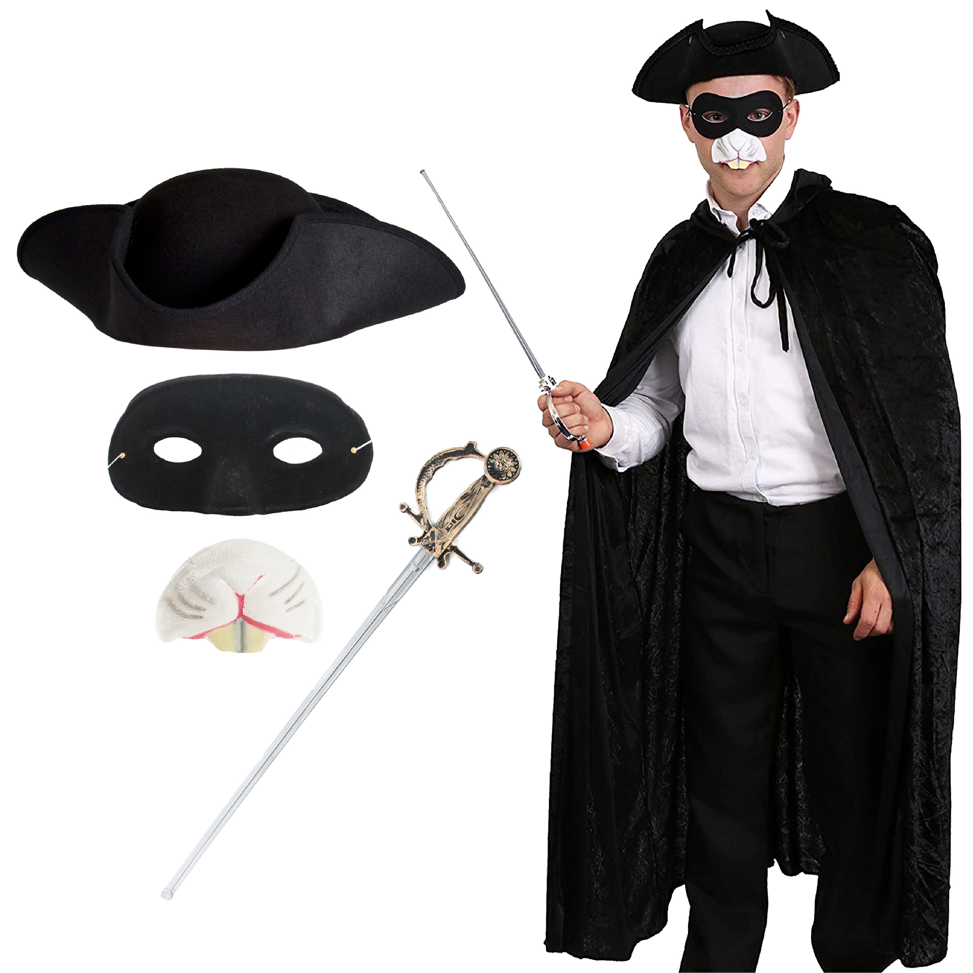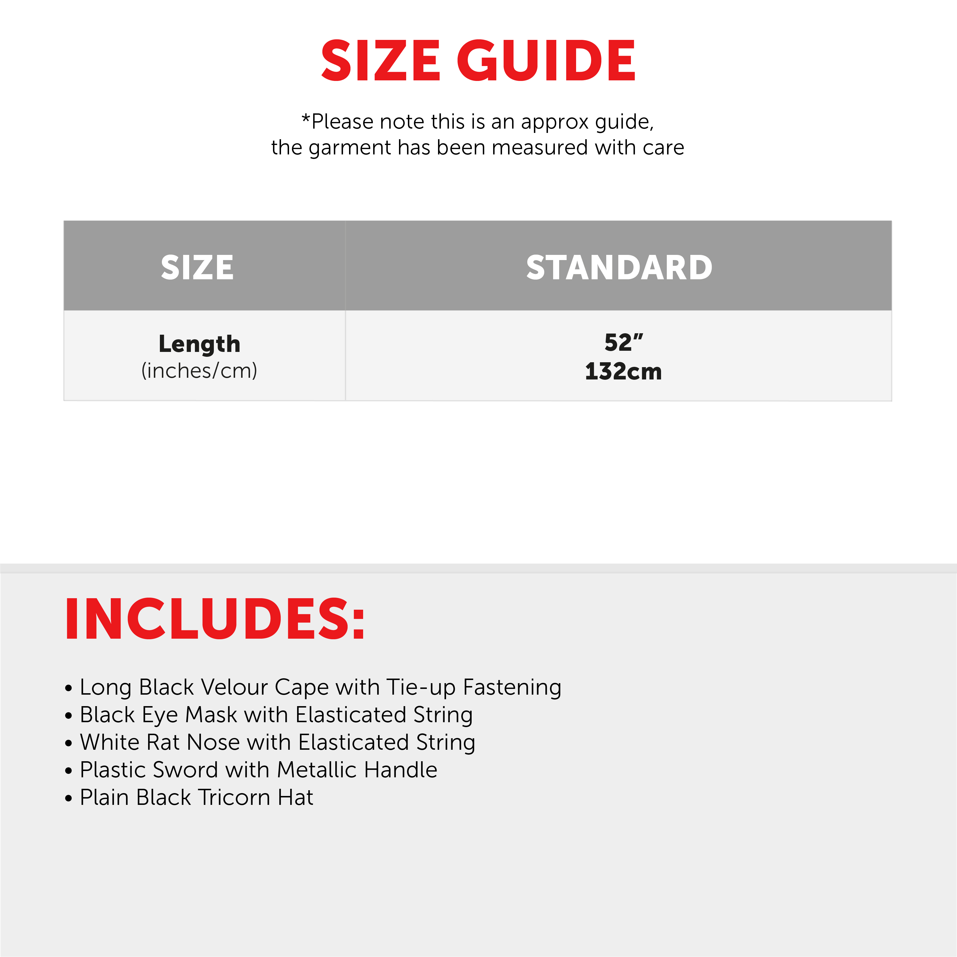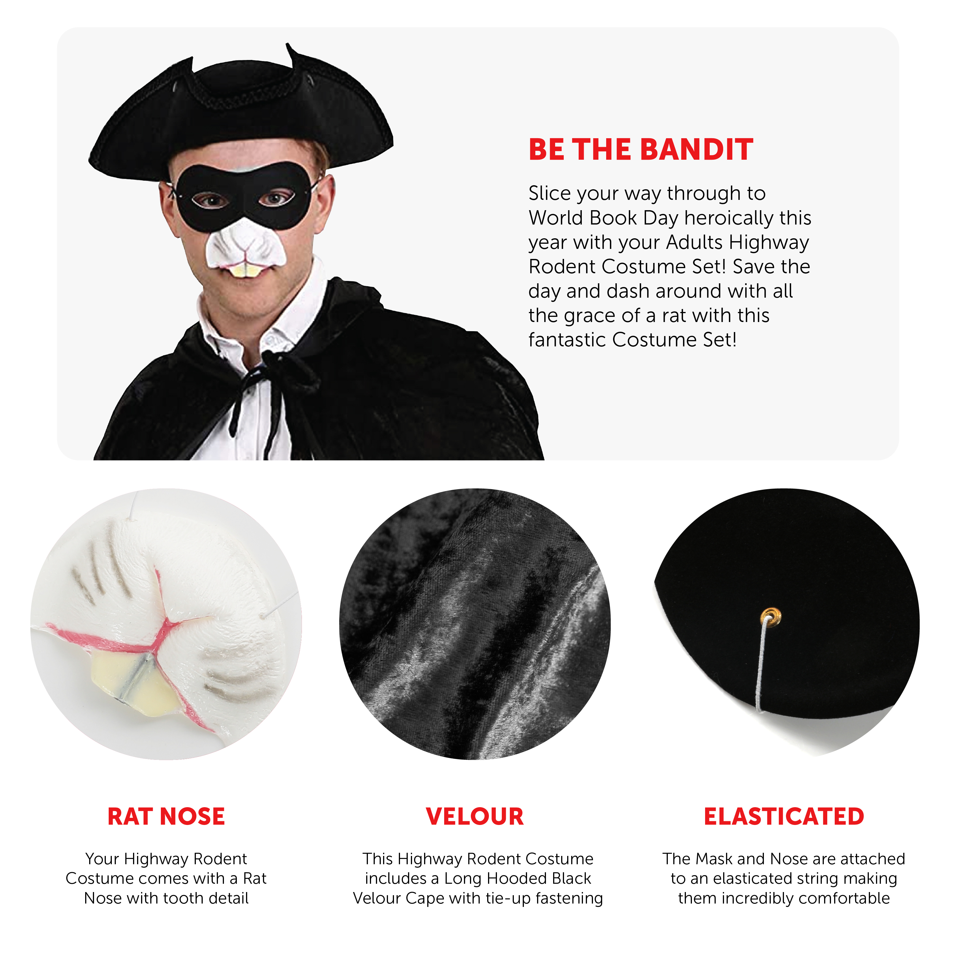 COSTUME SET INCLUDES: Your Adults Highway Rodent Costume Set includes a Long Black Hooded Velour Cape, a Black Tricorn Hat, a Black Eye Mask, a Sword, and a Rat Nose with an elasticated strap!