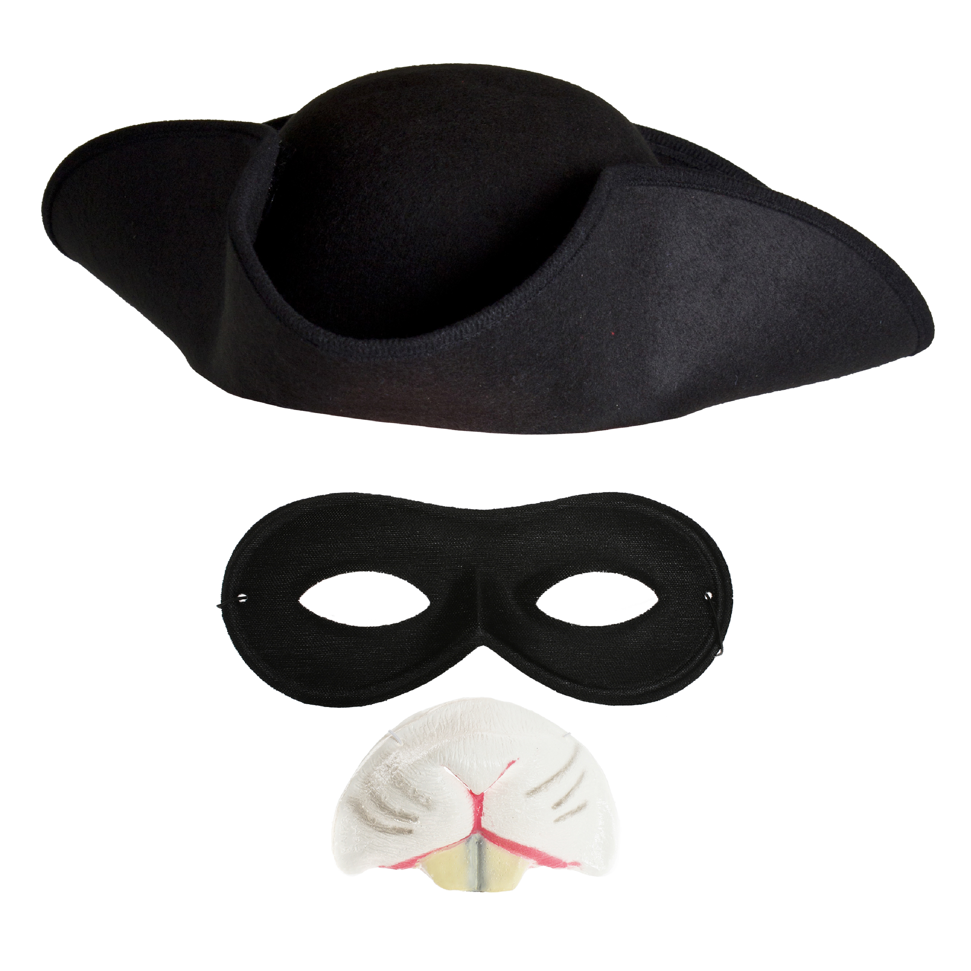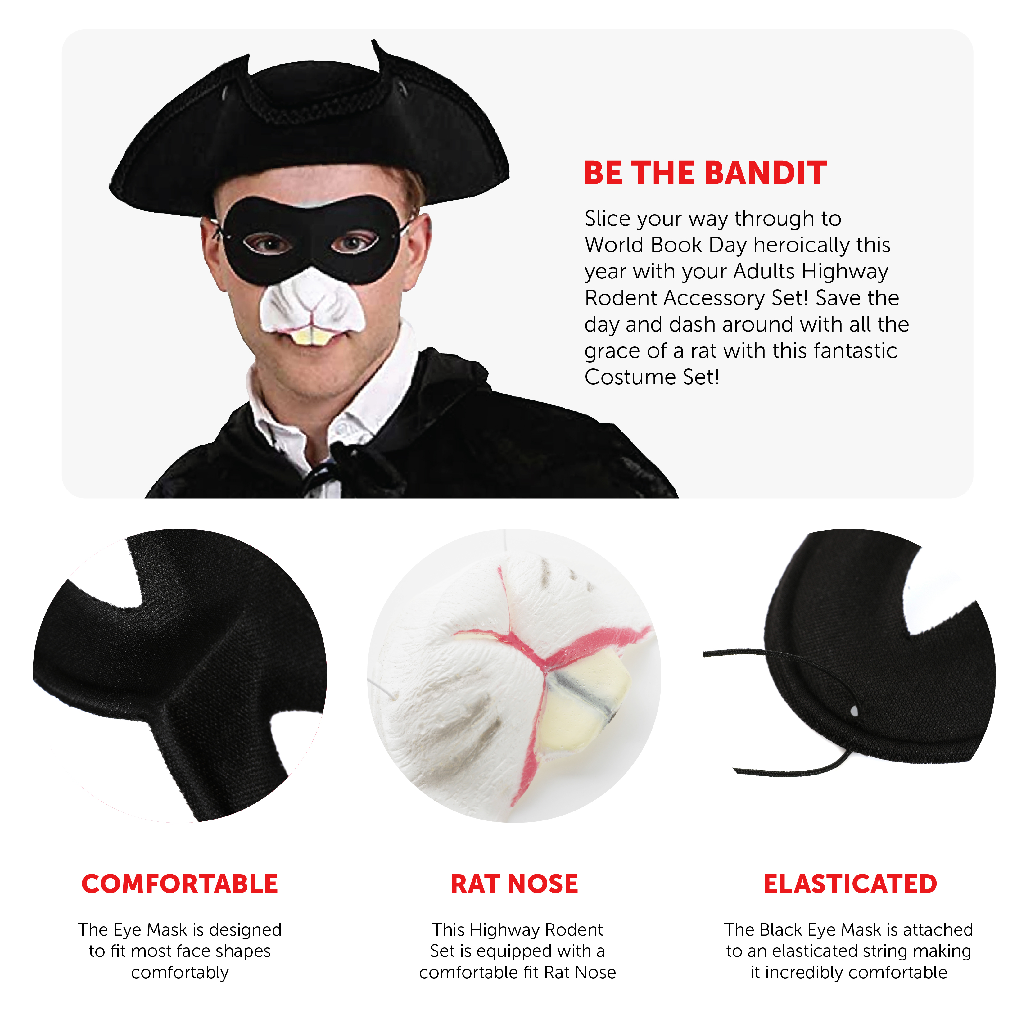 SET INCLUDES: Your Adults Highway Rodent Accessory Set includes a Plain Black Tricorn Hat, a Black Eye Mask, and a Rat Nose on an elastic strap!