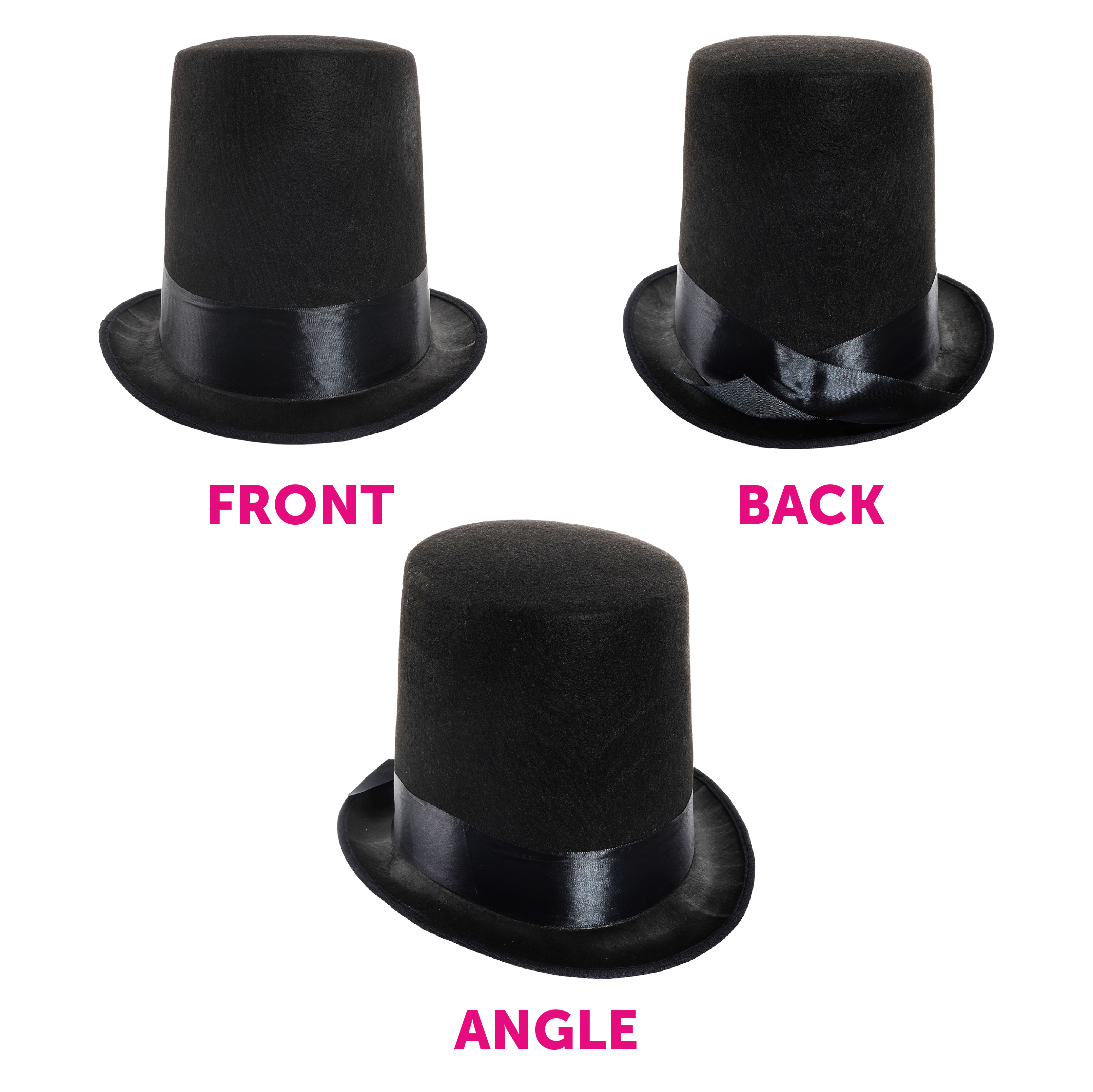 Command attention with this tall, elegant stovepipe hat featuring a smooth black finish and a classic satin ribbon band. Designed to complete any dapper costume look – from Victorian gentlemen and magicians to ringmasters and gothic icons.