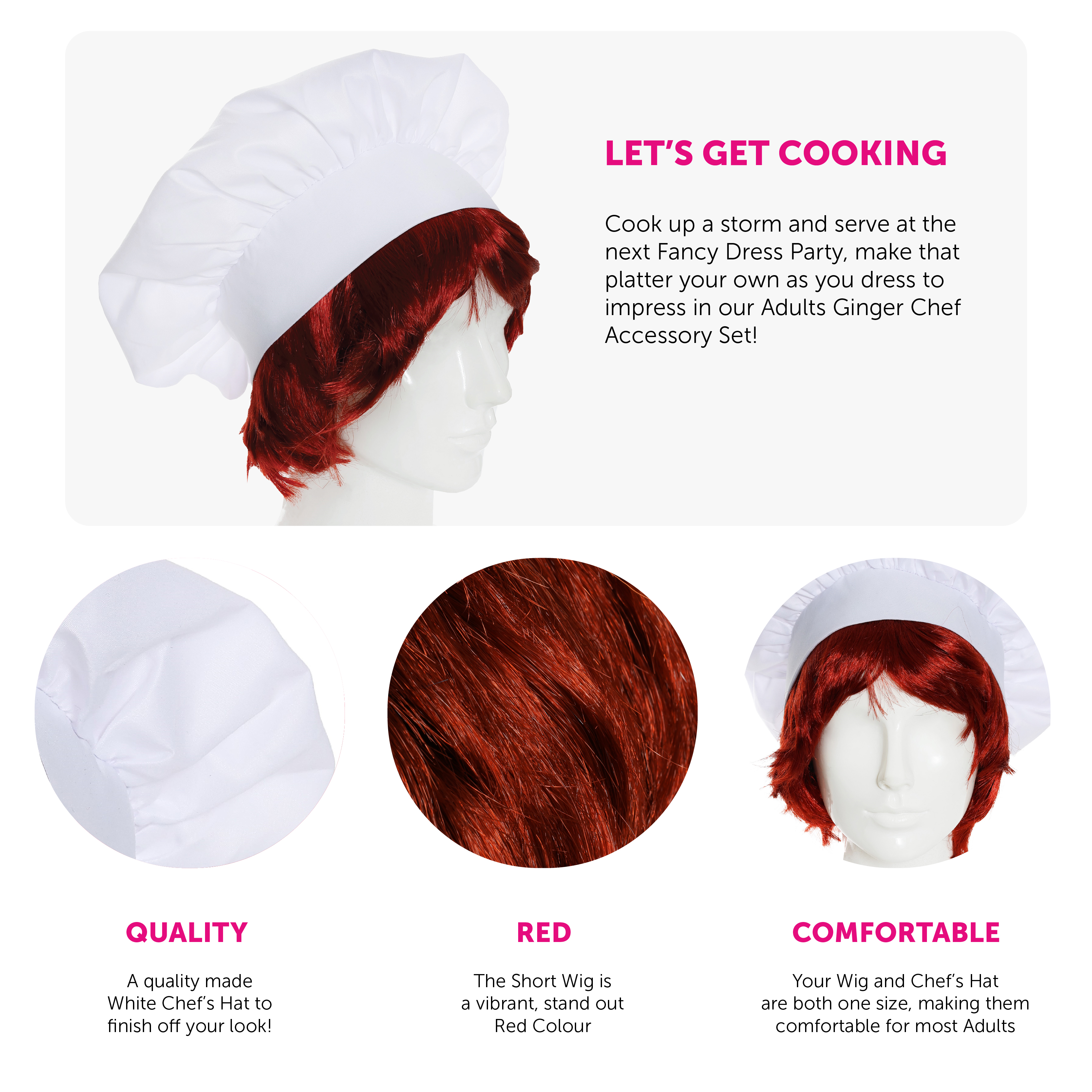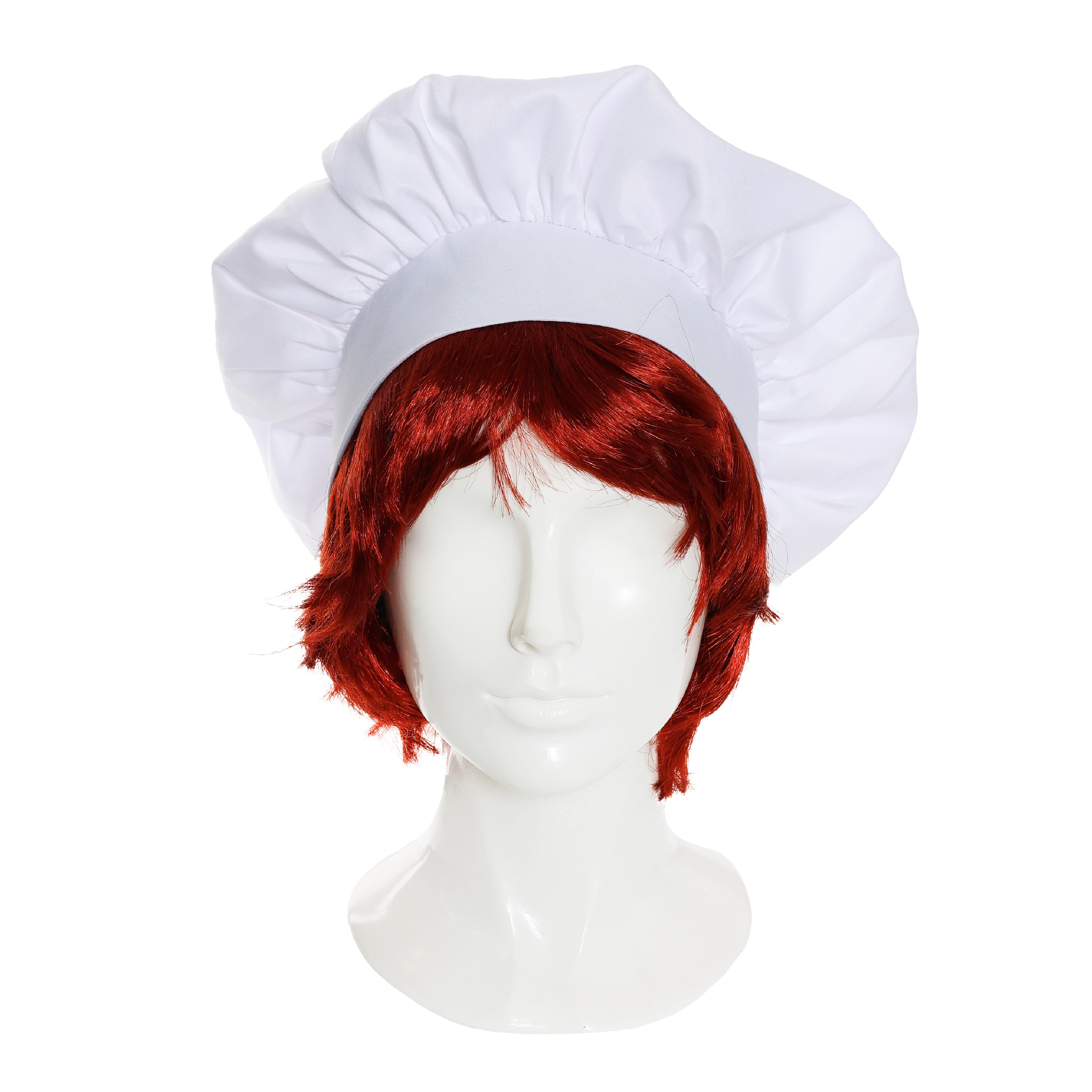 ONE SIZE FITS MOST: Your Short Ginger Wig and White Chef's Hat are both one size, meaning they are designed to suitably fit most Adults comfortably!