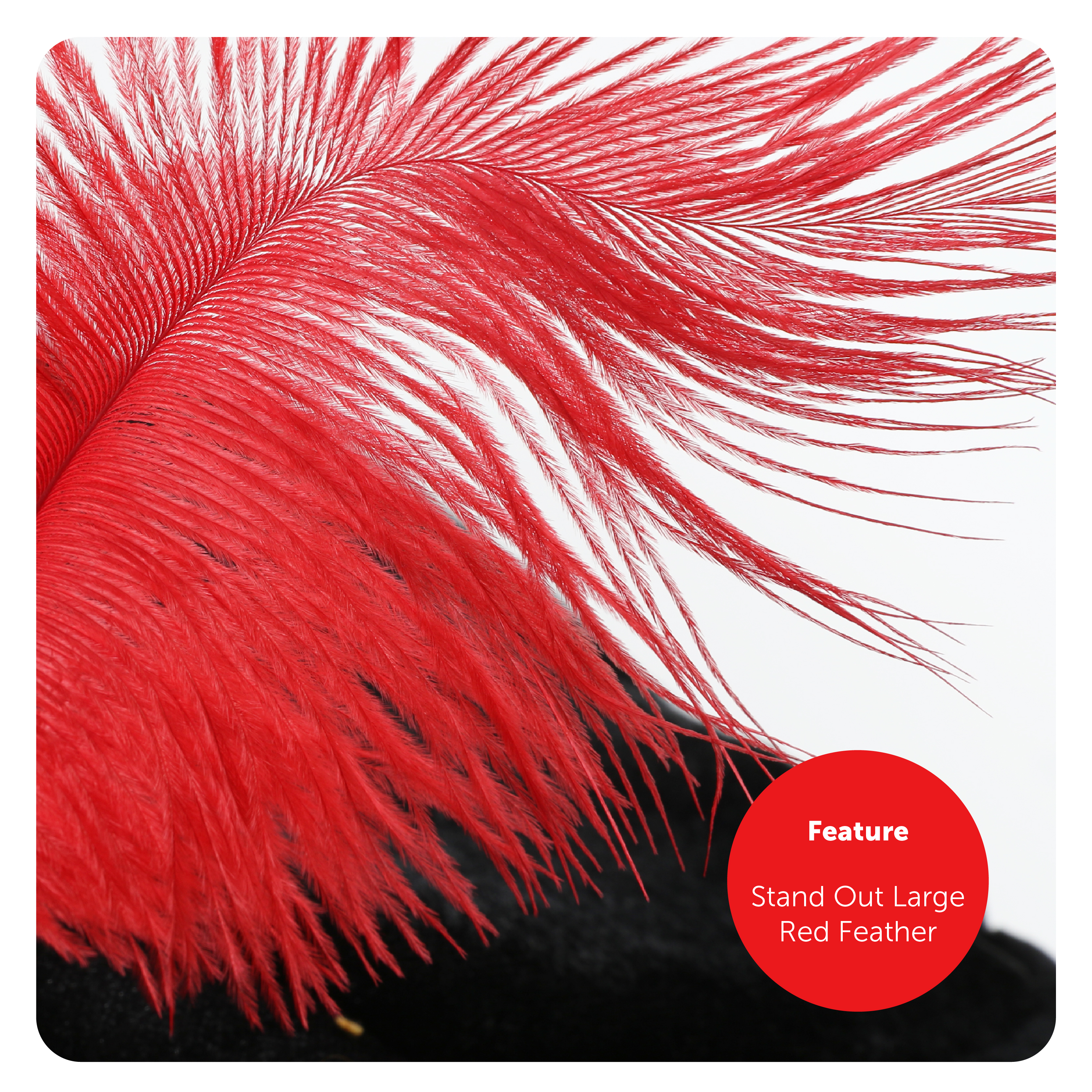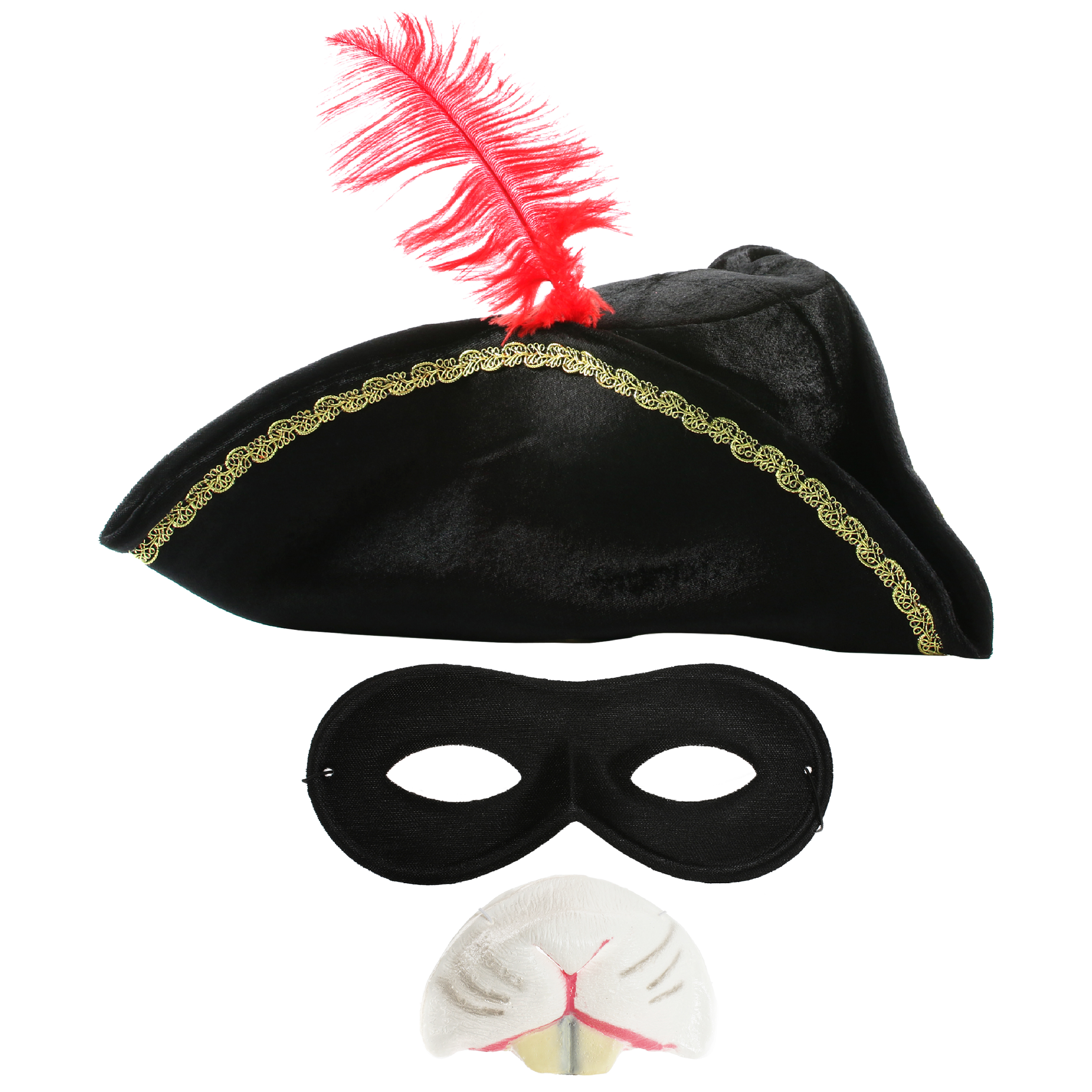 COSTUME SET INCLUDES: Your Child's Highway Man Costume Set includes a Black Trimmed Tricorn Hat with a Large Red Feather, Black Eye Mask, and a Fake Rat Nose on Elastic String!