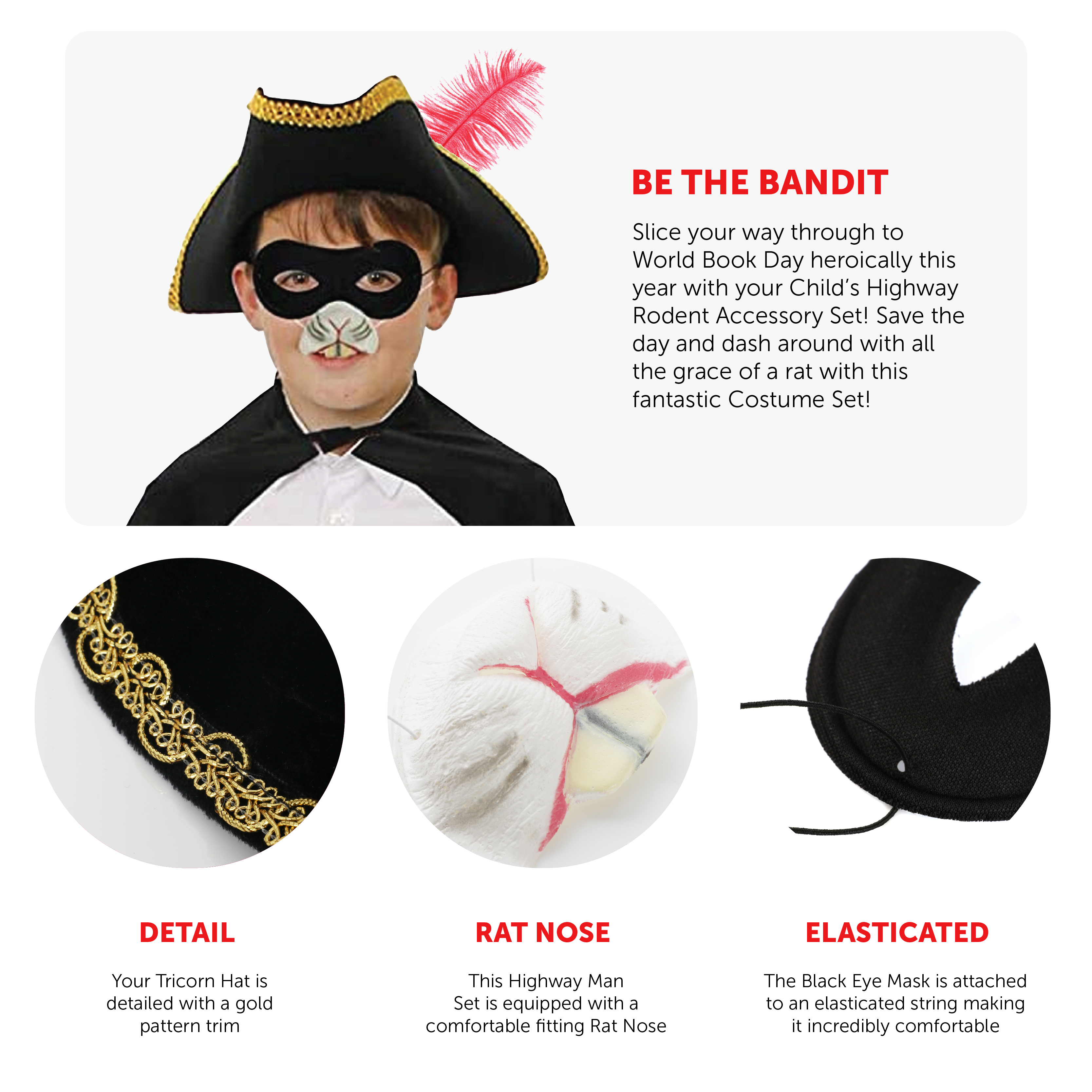 CHILDS HIGHWAY MAN COSTUME: Slice your way through to World Book Day heroically this year with your Child’s Highway Man Costume! Save the day and dash around with all the grace of a rat with this fantastic Costume Set!
