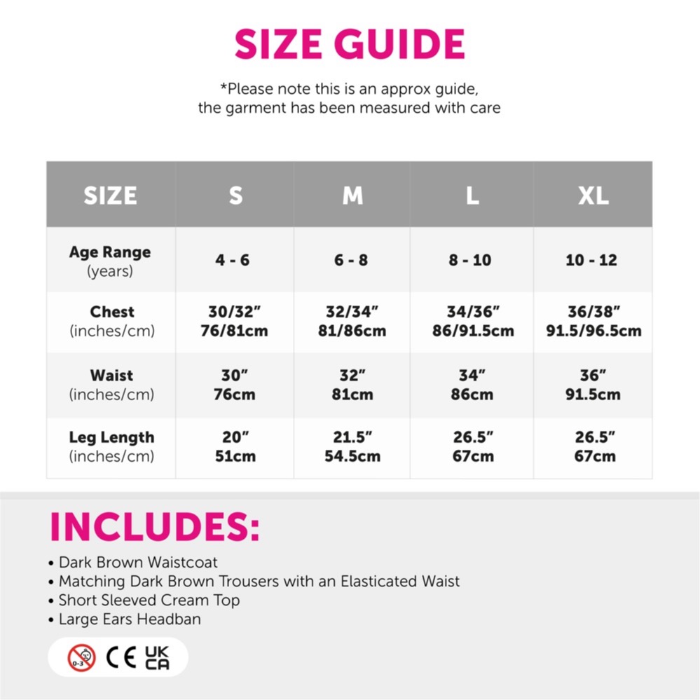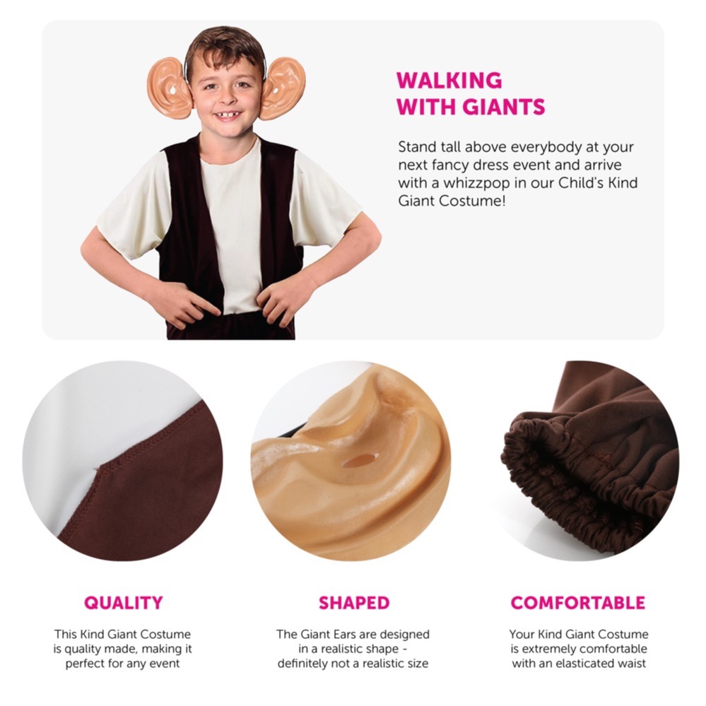 KIND GIANT COSTUME DETAILS: Your Child's Kind Giant Costume includes a Dark Brown Waistcoat, matching Dark Brown Trousers with an elasticated waist, a short sleeved Cream Top and Large Ears Headband accessory, to finish off your outfit!
