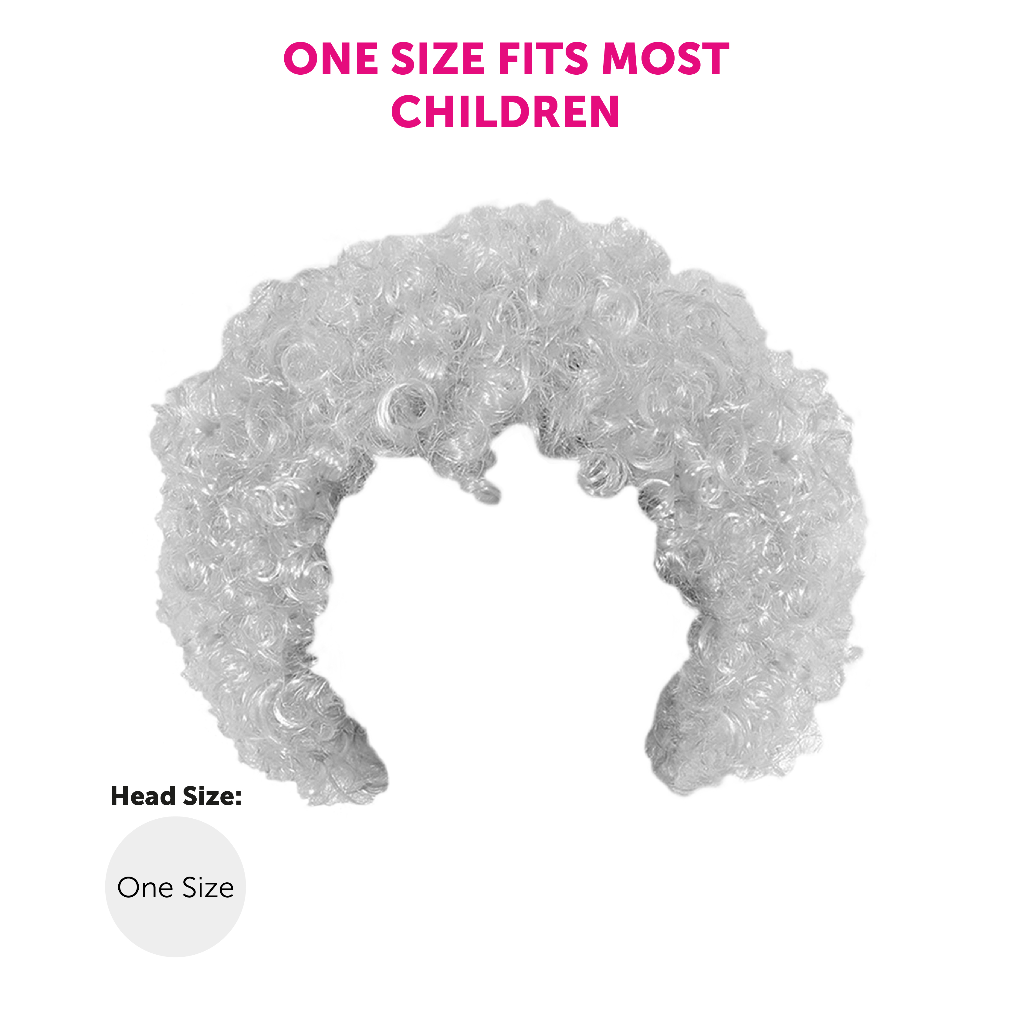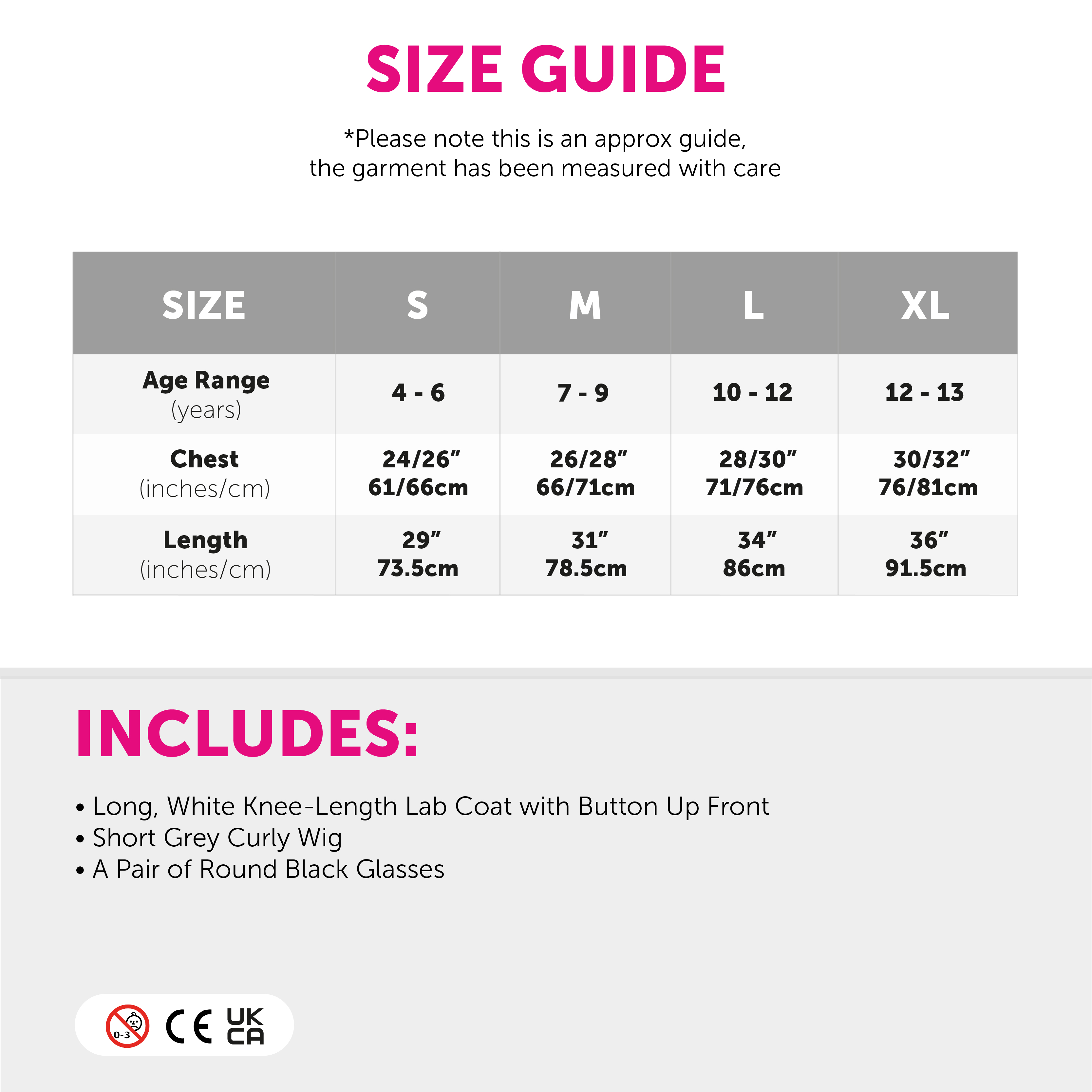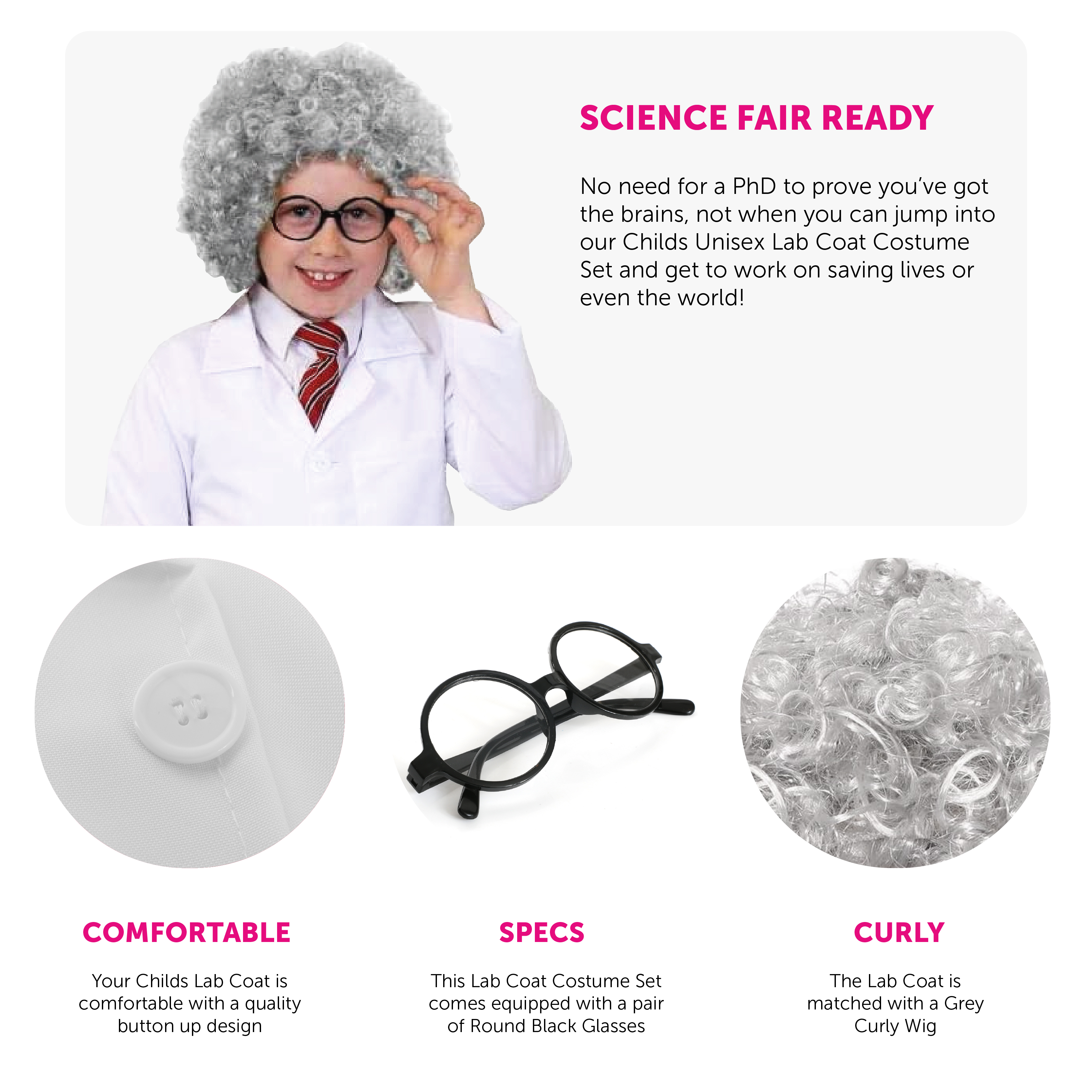 COSTUME DETAILS: Your Child’s Unisex Lab Coat Set is a long knee-length lab coat, with a button up front and 3 pockets to the front, a Grey Curly Wig, and a pair of Black Glasses!