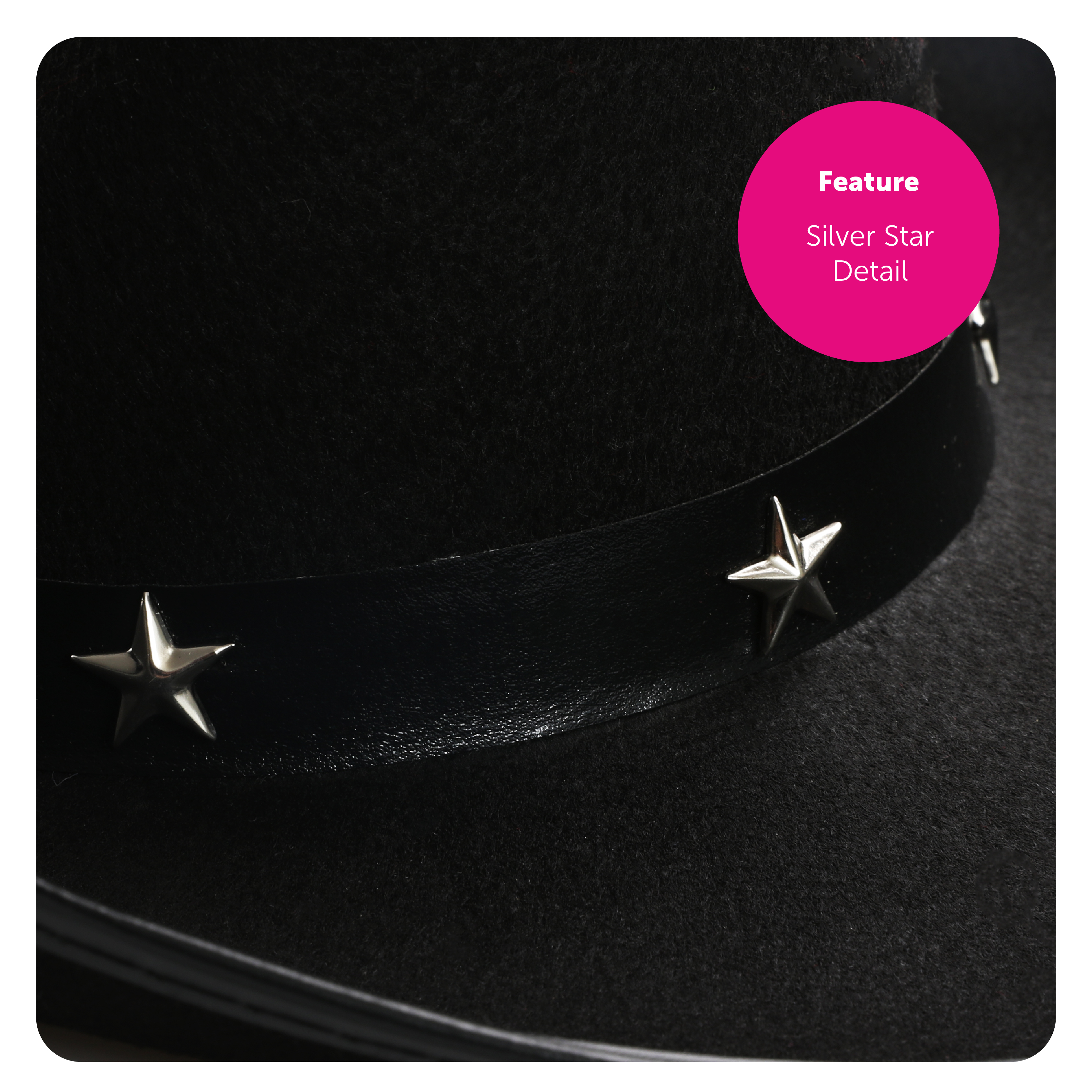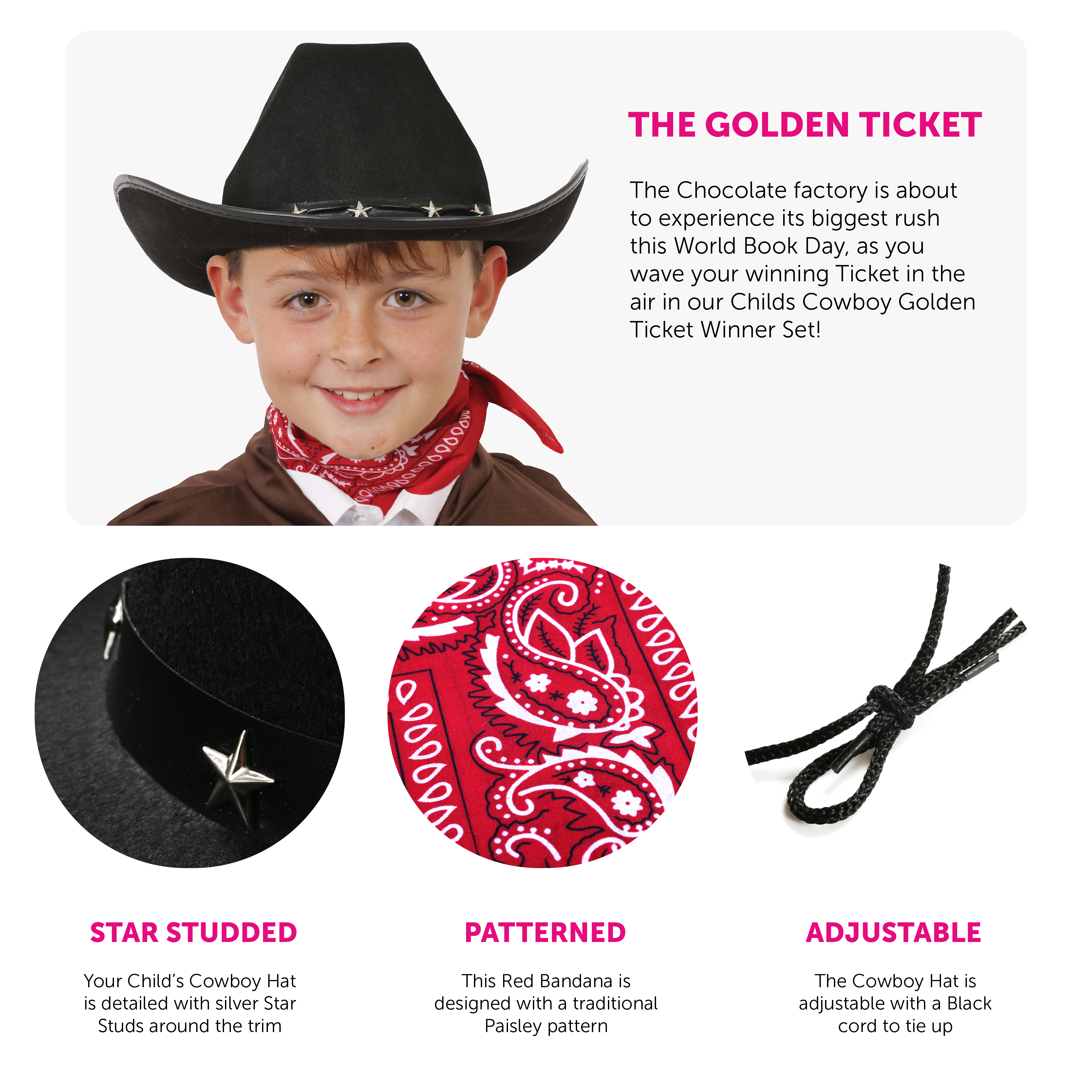 ACCESSORY SET INCLUDES: Your Childs Cowboy Golden Ticket Winner Set includes a Black Felt Cowboy Hat with a Silver Star Studded Trim and a Red Bandana with paisley pattern detail!