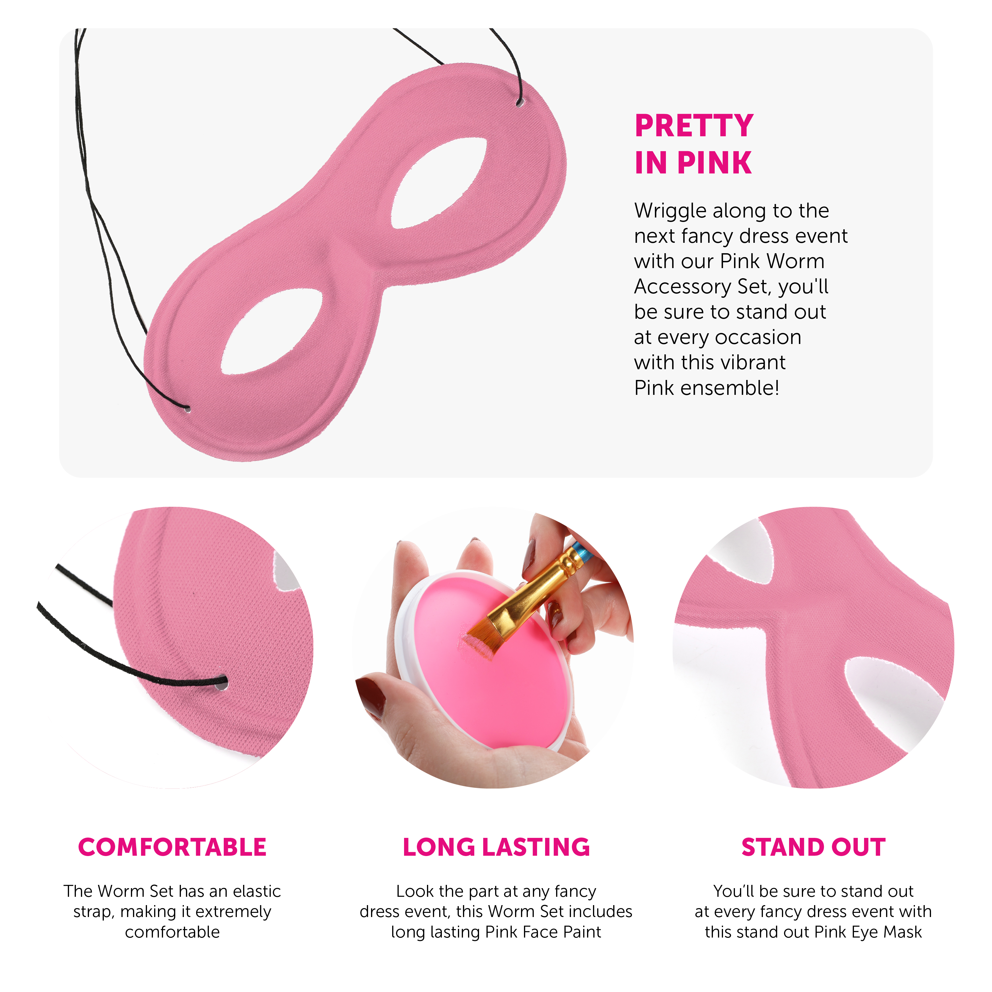 SET INCLUDES: The Worm Accessory Set includes a sturdy Pink Eye Mask with an elasticated strap, and a Palette of long lasting Pink Face and Body Paint, the perfect look for any fancy dress event!