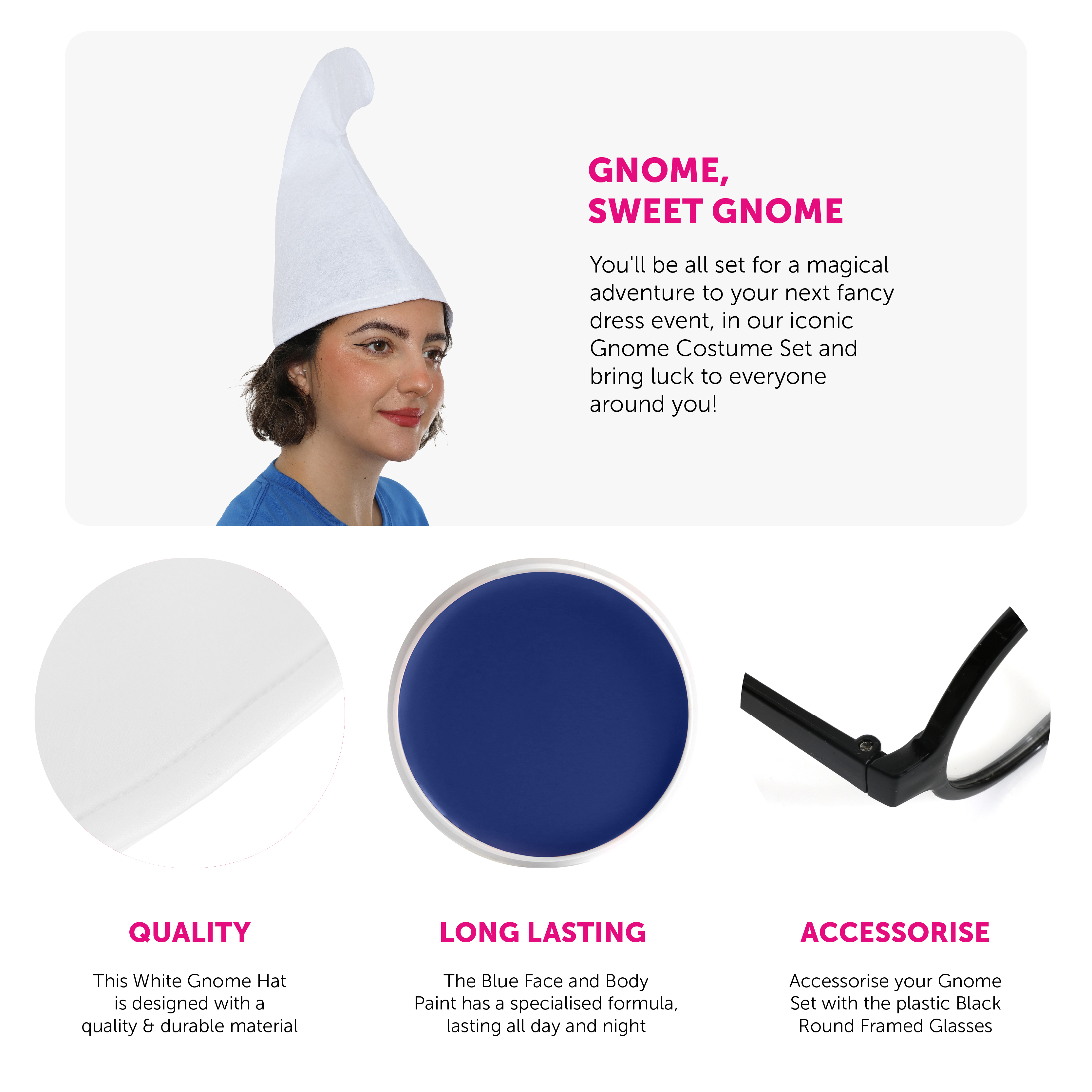 SET INCLUDES: This Gnome Set includes a soft and comfortable, tall White Gnome Hat with a curved top, Black Round Framed Glasses, and a palette of Blue Face and Body Paint, the perfect finishing touch to your Costume at any fancy dress event!