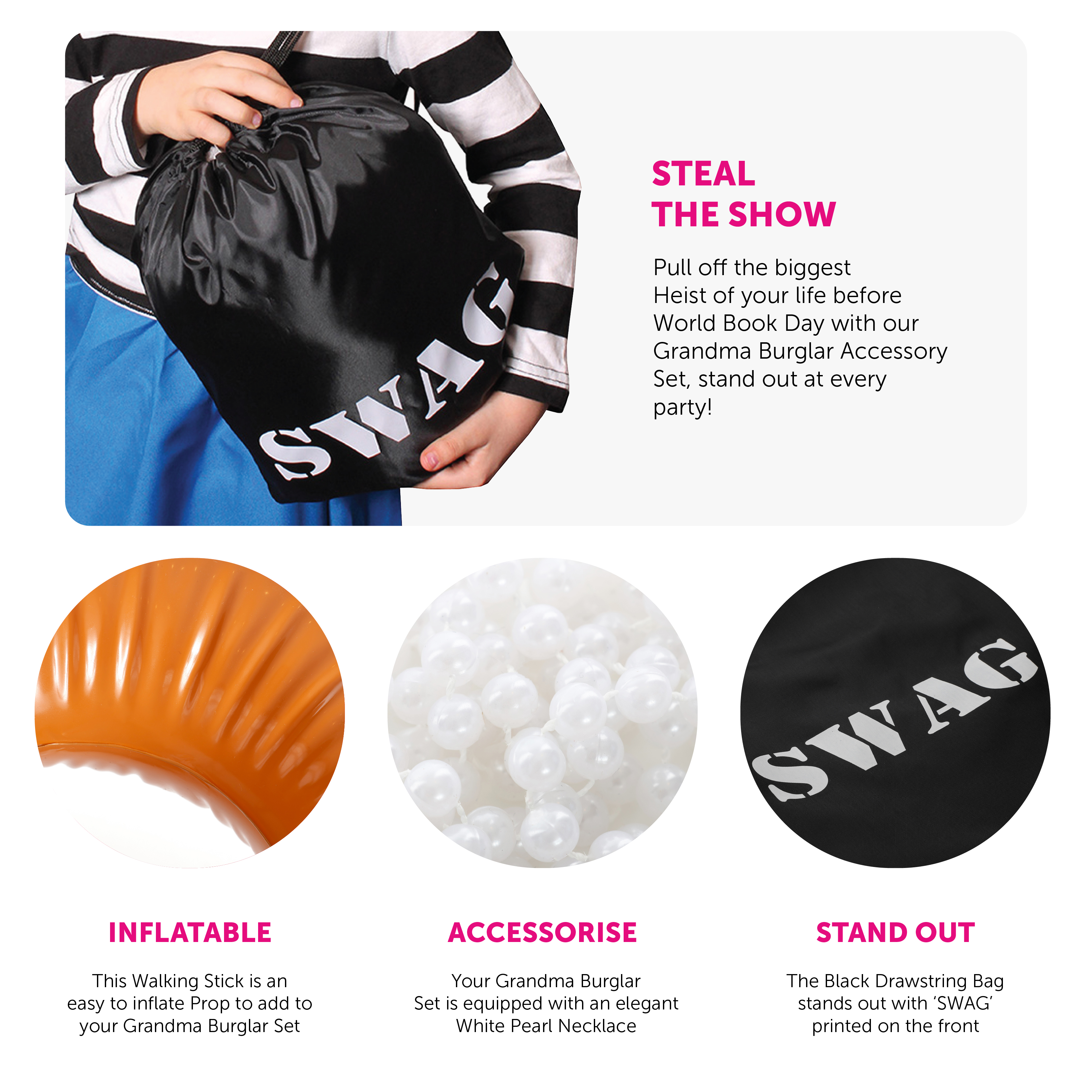 SET INCLUDES: This Grandma Burglar Accessory Set includes a Pearl Bead Necklace, a Black Drawstring Bag with SWAG printed on the front, and an Inflatable Walking Stick, the perfect look for World Book Day!