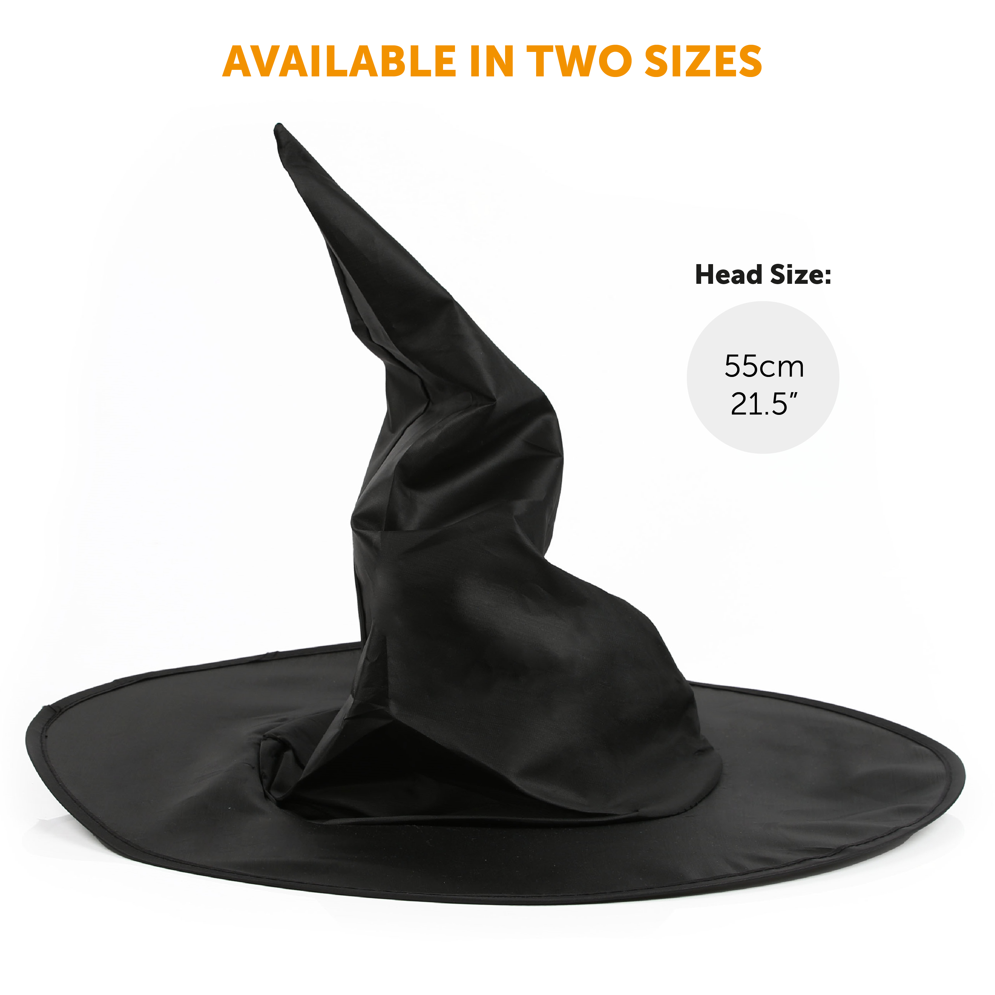 TWO SIZES AVAILABLE: Your Black Witches Hat is designed to fit most with two sizes available, a suitable Head Size of 55cm (21.5"), and 58cm (23"), a comfortable fit for anyone to wear at any fancy dress event!