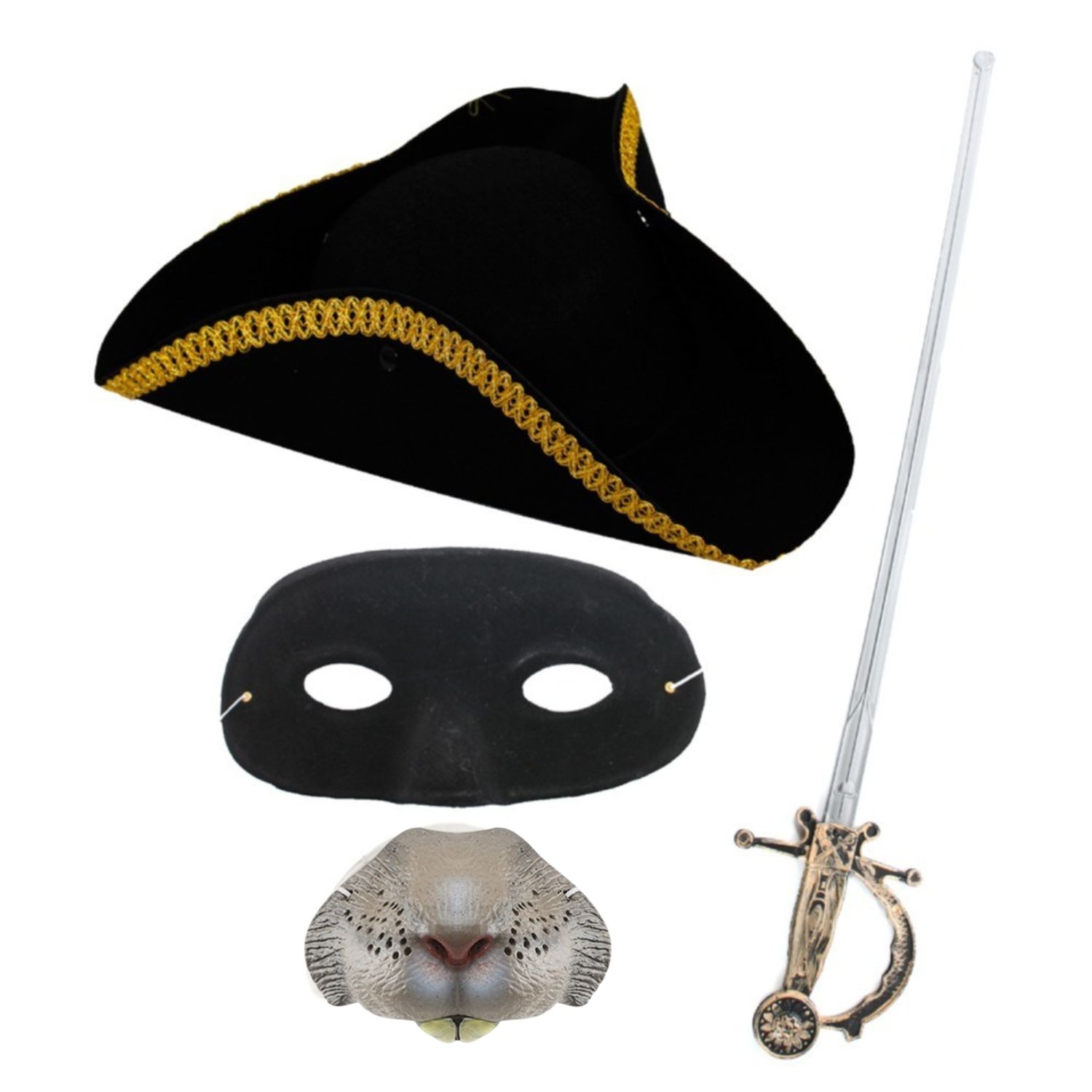 Adults Highway Rodent Accessory Set - Gold Trim Tricorn Hat, Mask & Sword