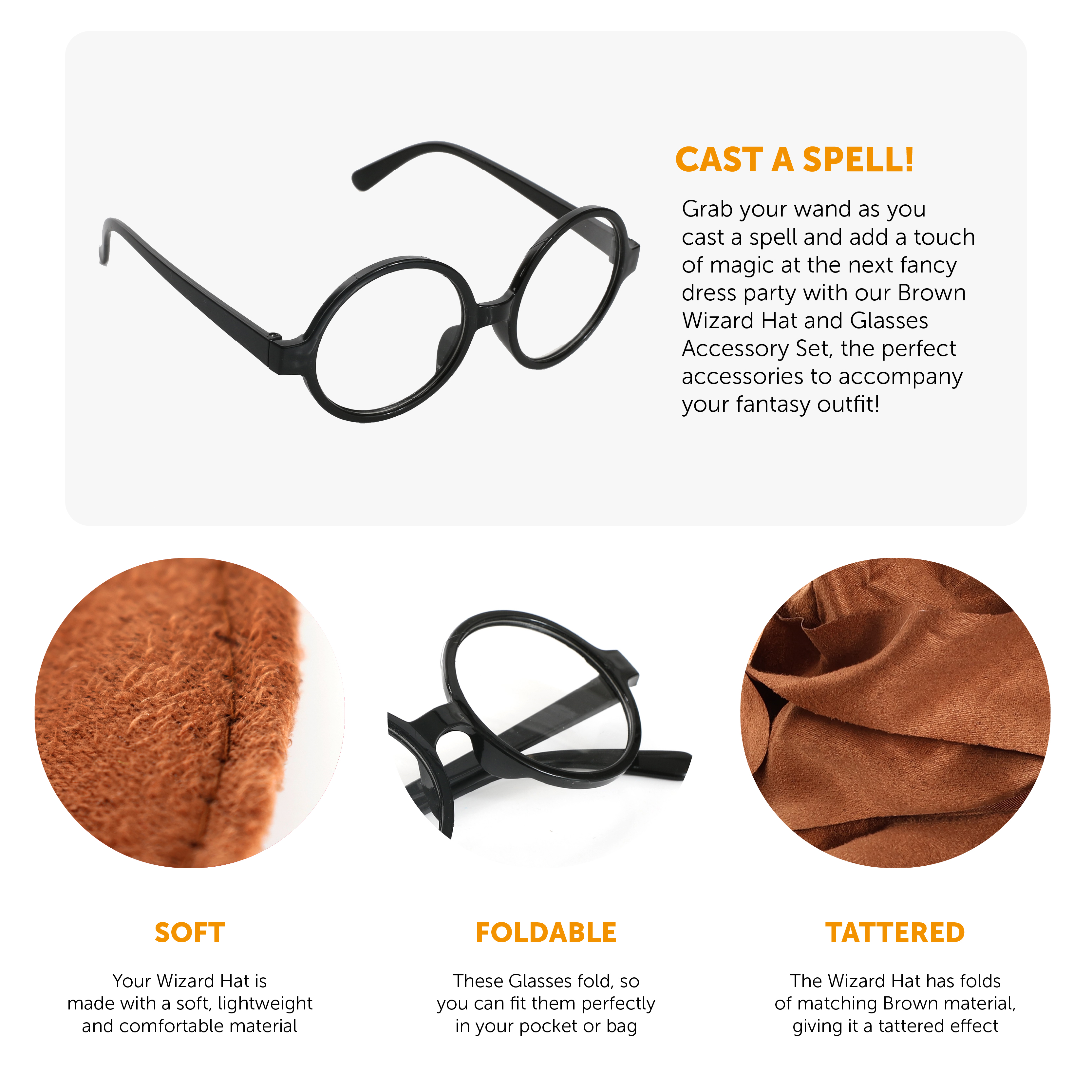 SET DETAILS: Your Magical Accessory Set includes a Brown Wizard Hat with tattered material detail and a poseable wire inside, and a pair of Round Glasses with thick Black Frames, the perfect addition to your Wizard Costume!
