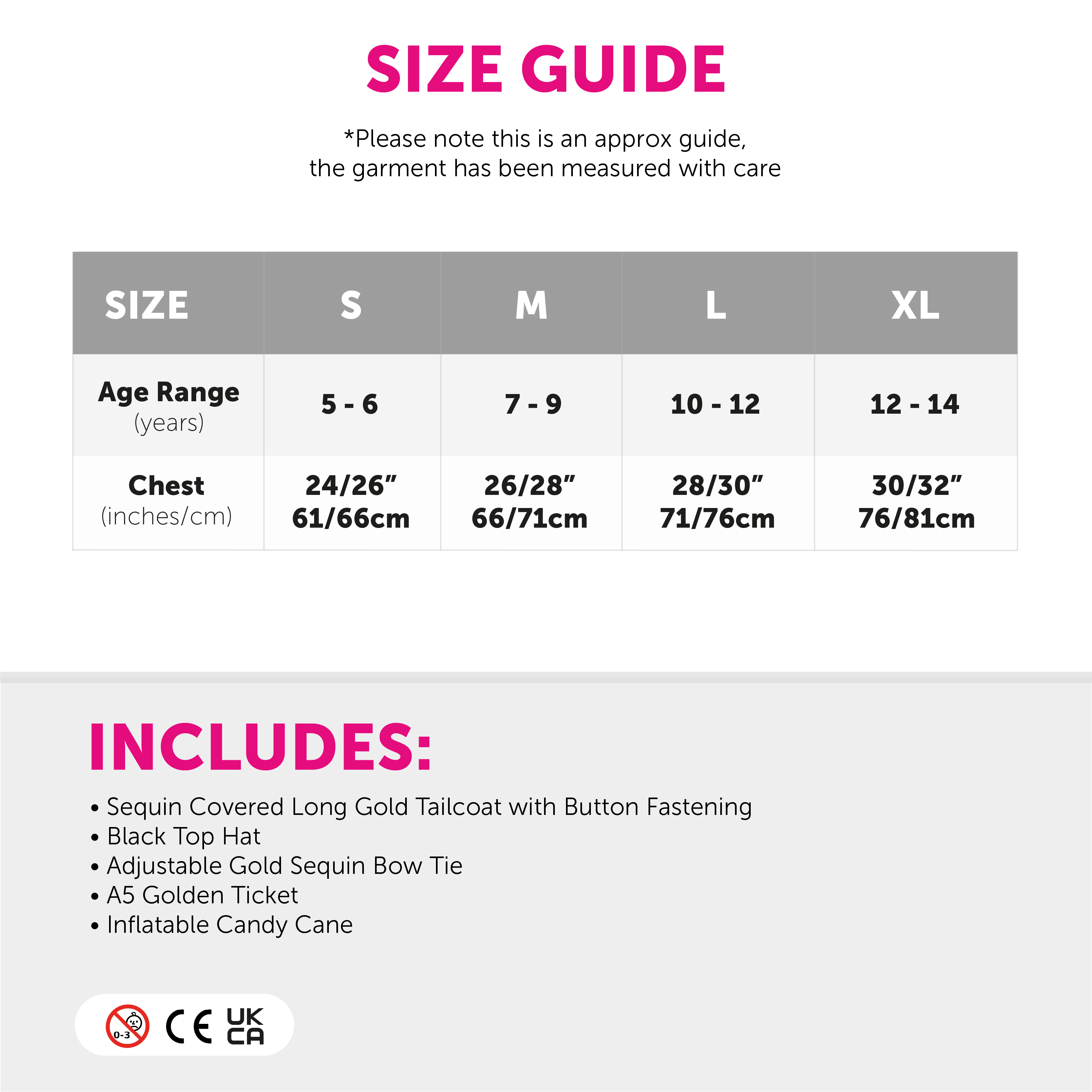 COSTUME INCLUDES: Your Child's Chocolate Factory Boss Costume includes a long Gold Sequin Tailcoat with Black edging and a Gold Button, a Gold Sequin covered Bow Tie with an adjustable strap, a Black Top Hat, an Inflatable Red and White striped Candy Cane and an A5 Laminated Gold Ticket Prop, the perfect look for World Book Day!