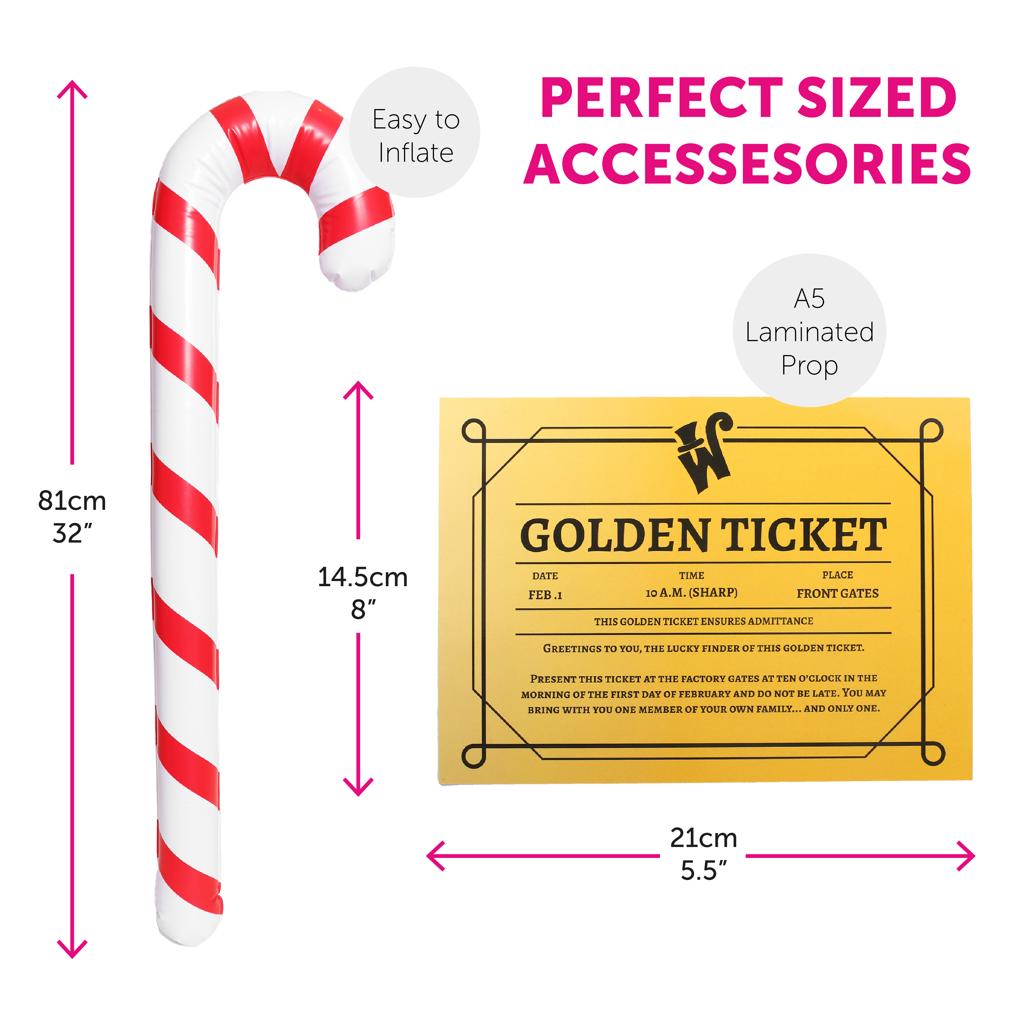 GREAT SIZED PROPS: The Props included in this Costume Set are great sizes; the Golden Ticket is an A5 accessory with measurements of 21cm x 14.5cm (8" x 5.5"), and the Inflatable Candy Cane Stick measures a full length of 81cm (32")