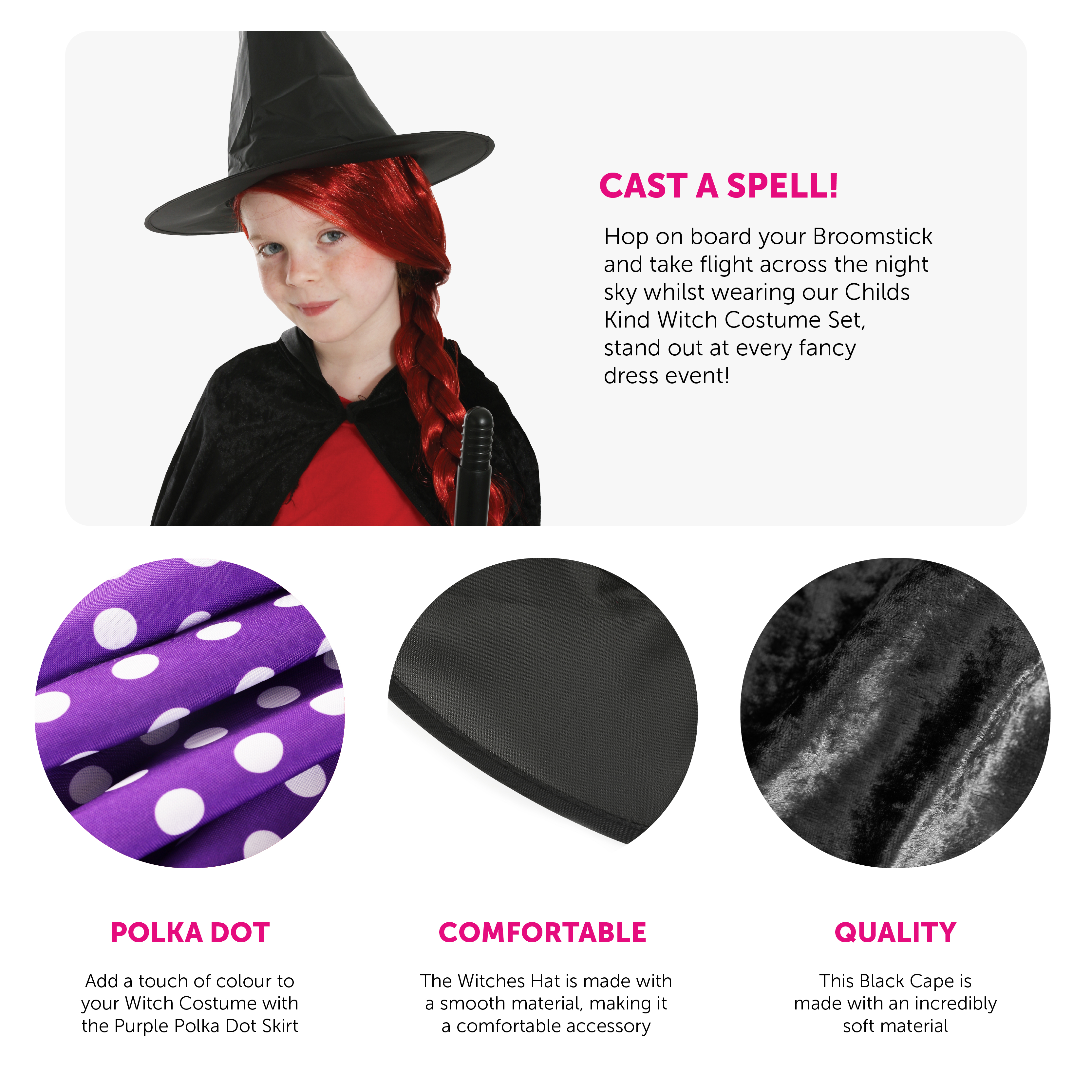 COSTUME INCLUDES: This Childs Kind Witch Costume includes a Black Witches Hat, a soft Black Velour Hooded Cape with hook and loop fastening, and a Purple and White Polka Dot Skirt, the perfect look for World Book Day!