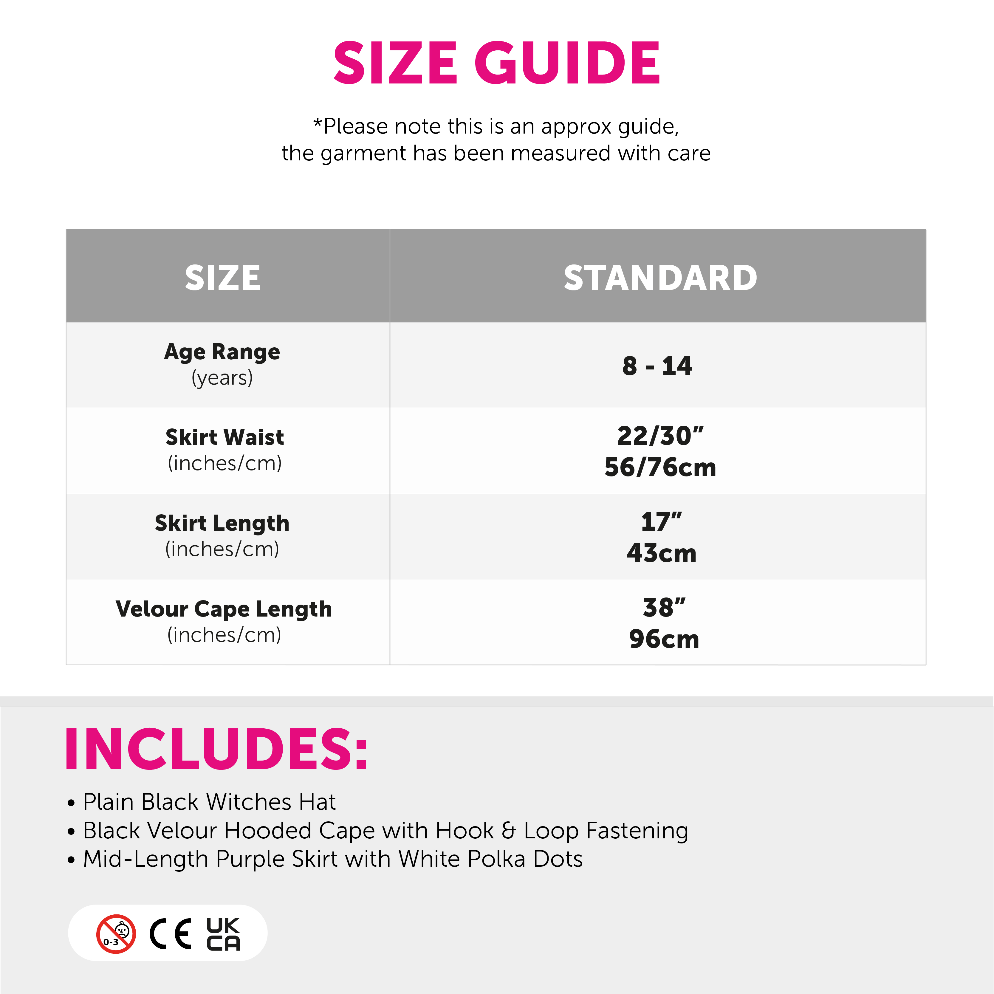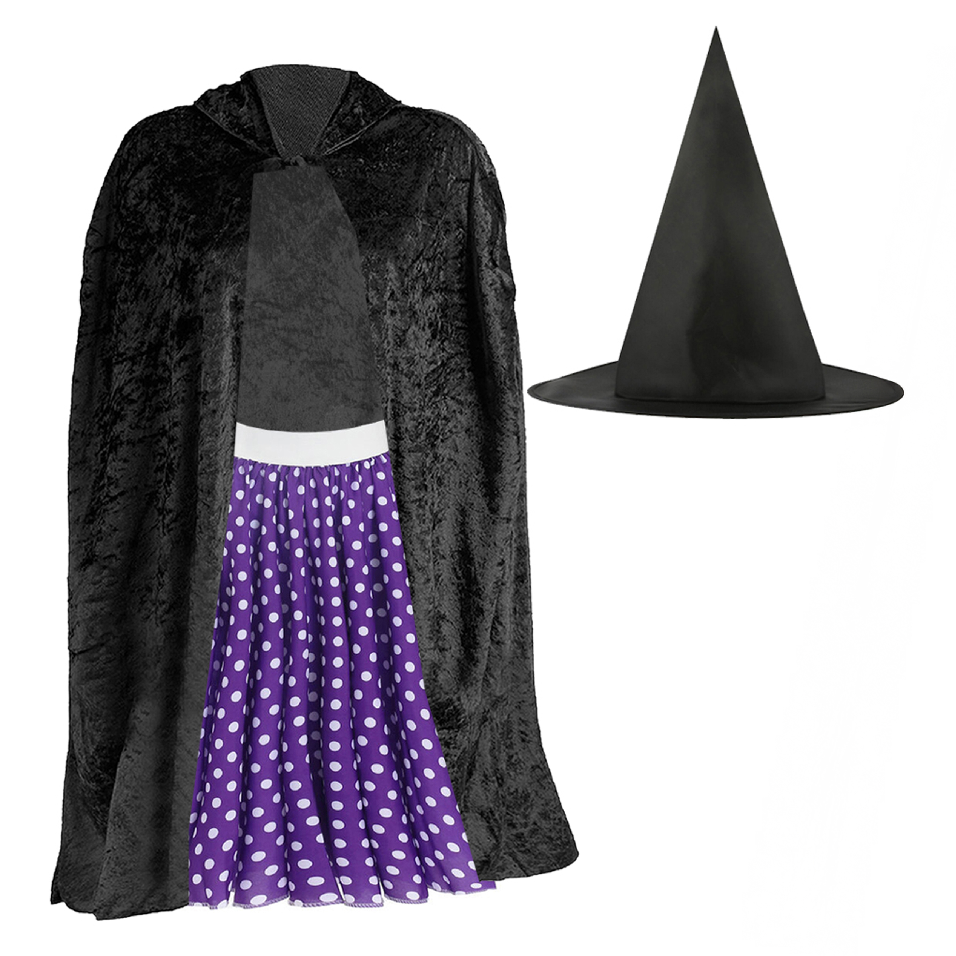 ONE SIZE FITS MOST: Your Childs Kind Witch Costume Set is only available in one size, as all items fit most Children - the Black Velour Cape measures 38" (96cm) in length, and the Purple & White Polka Dot Skirt is suitable for ages 8 - 14 years, Waist 22/30" (56/76cm), Length 17" (43cm)