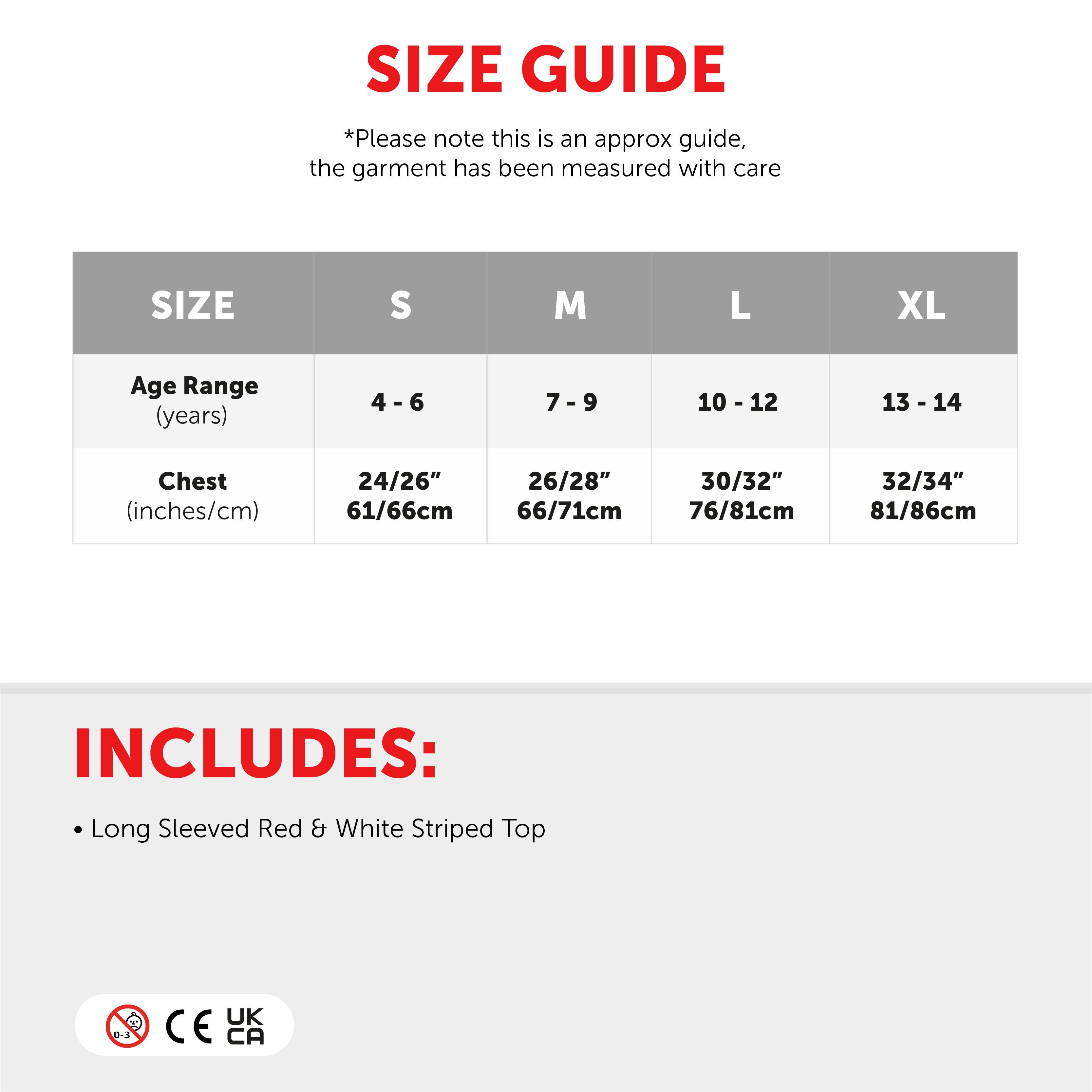 AVAILABLE IN MULTIPLE SIZES: Your Child's Red and White Striped Top is available in multiple sizes from Small to X-Large: Small (4 - 6 years), Chest 24/26" (61/66cm) | Medium (7 - 9 years), Chest 26/28" (66/71cm) | Large (10 - 12 years), Chest 30/32" (76/81cm) | X-Large (13 - 14 years), Chest 32/34" (81/86cm)