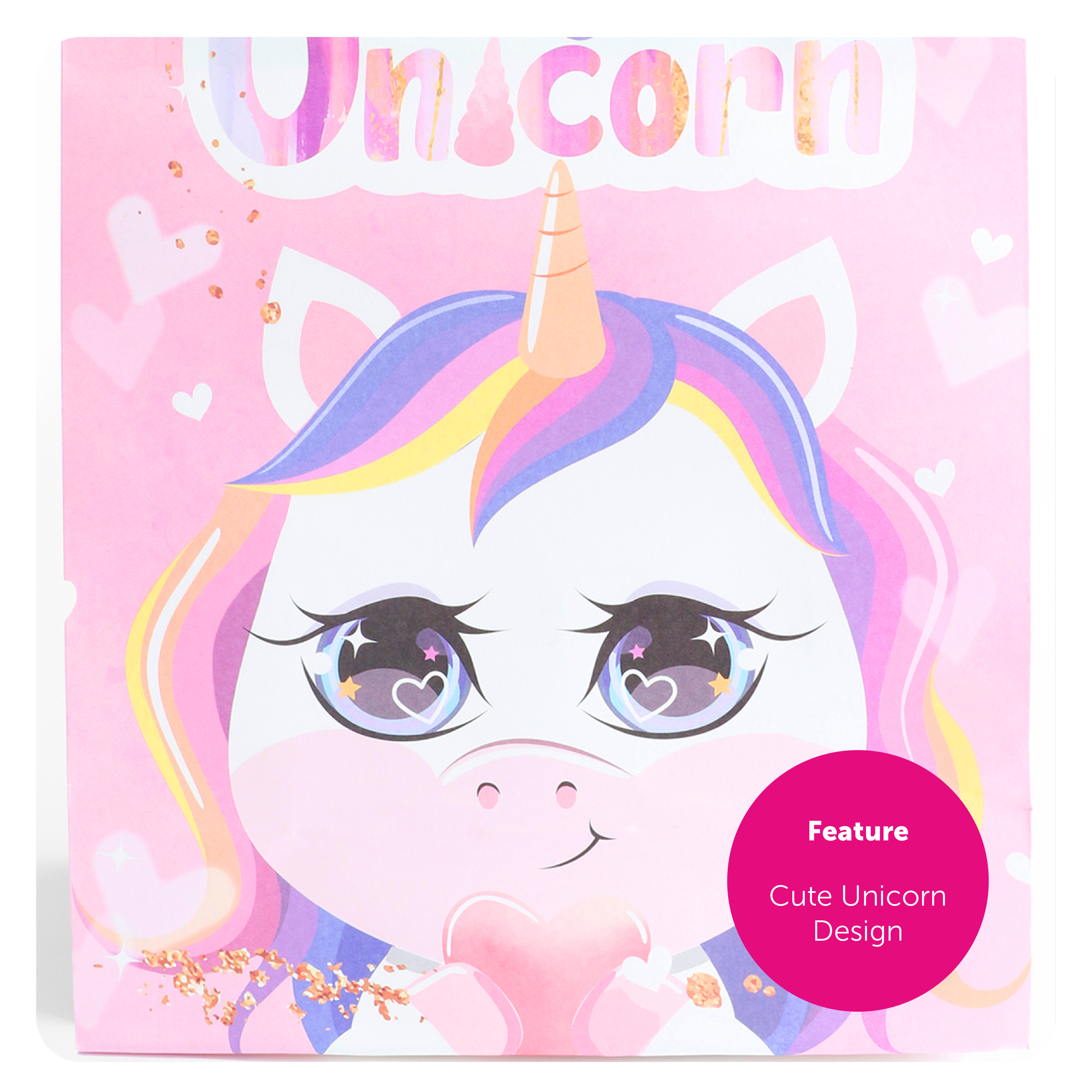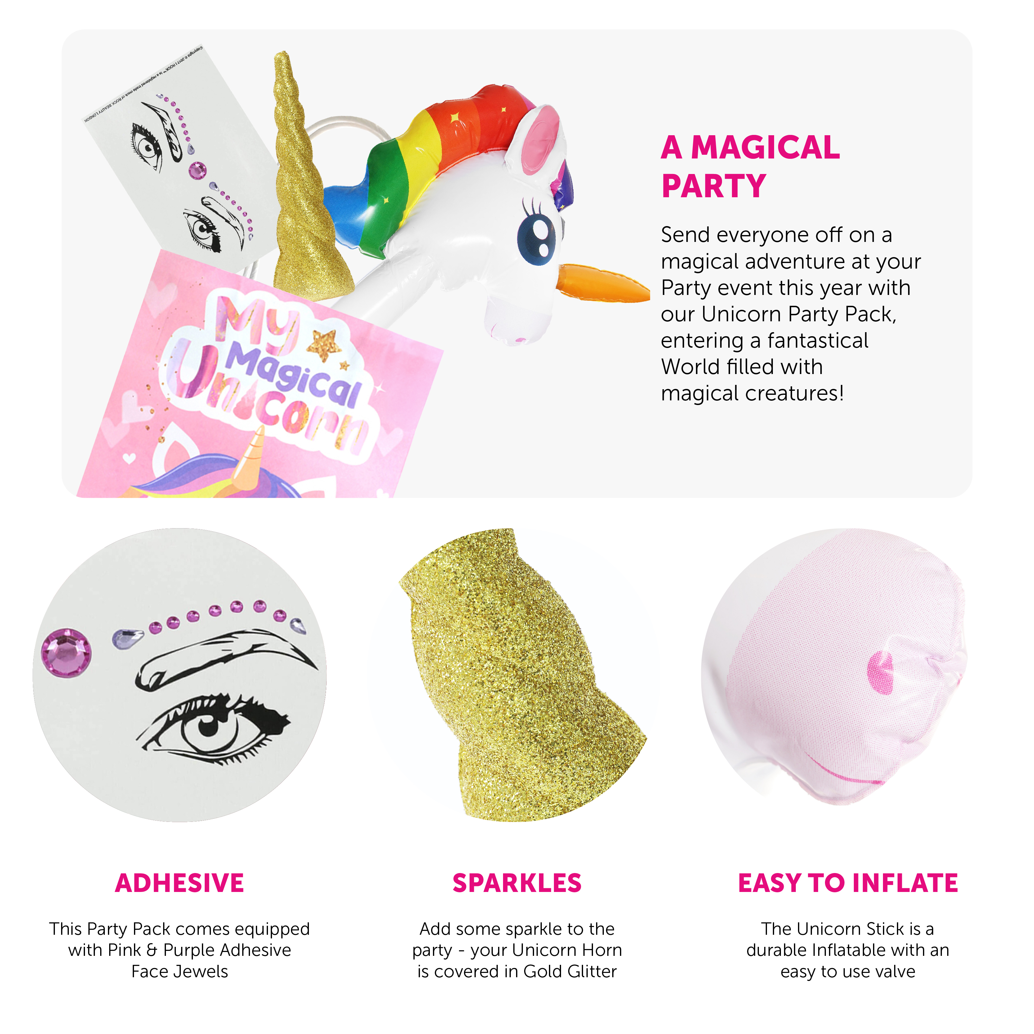 PARTY PACK INCLUDES: Your Unicorn Party Pack includes a Pink Paper Party Bag with a Unicorn and 'My Magical Unicorn' printed onto it, a long Inflatable Unicorn with a Rainbow coloured Mane and a Gold Horn on the front, Pink Adhesive Face Jewels, and a Gold Metallic Unicorn Horn!